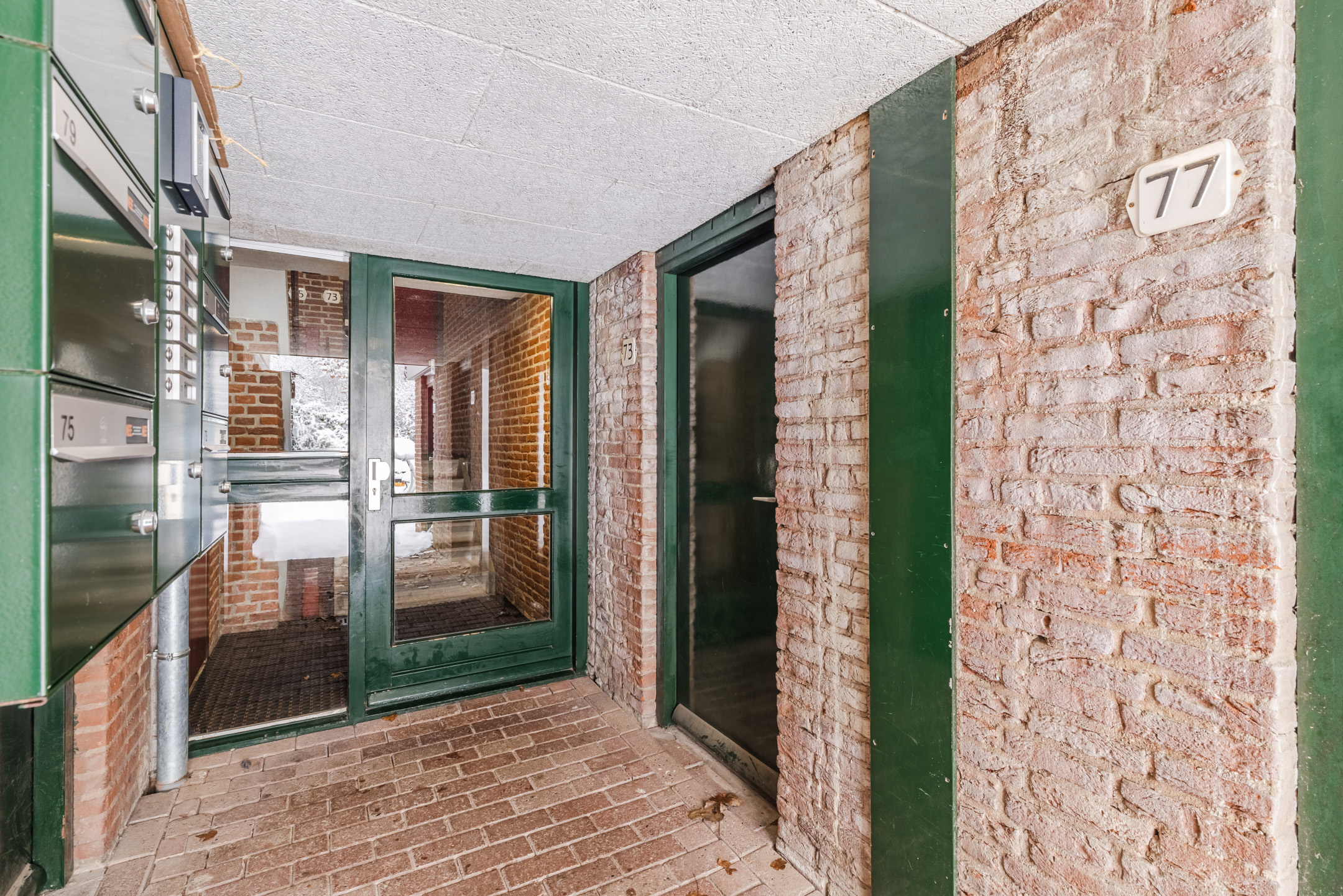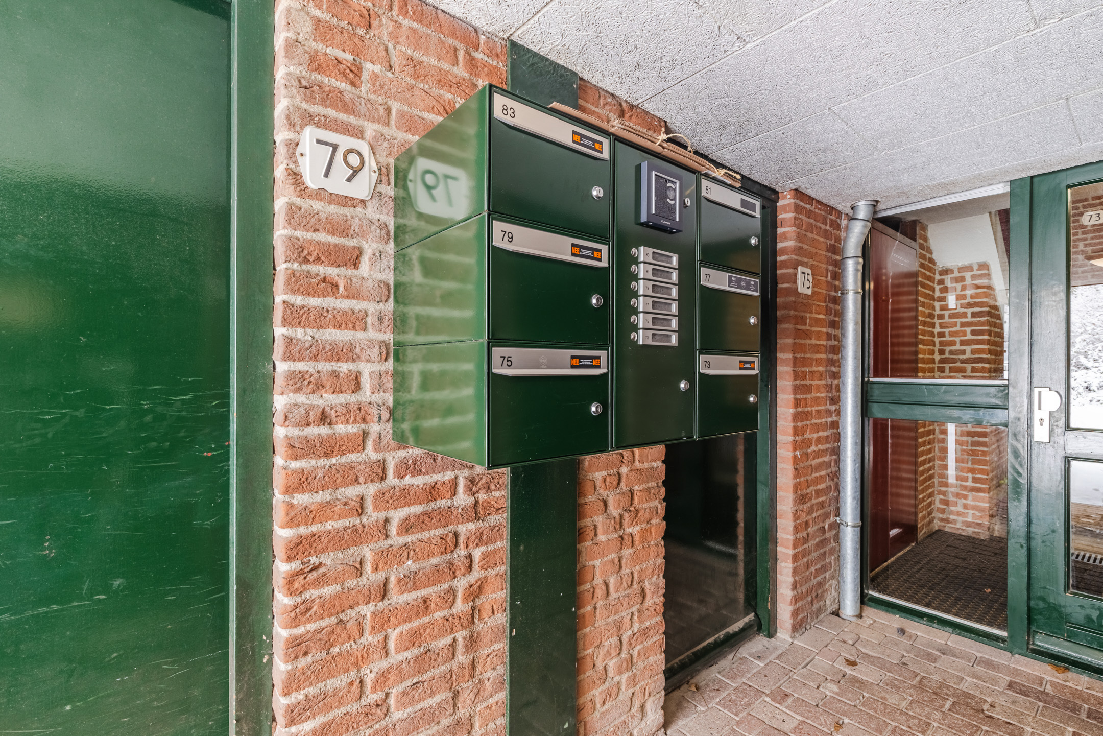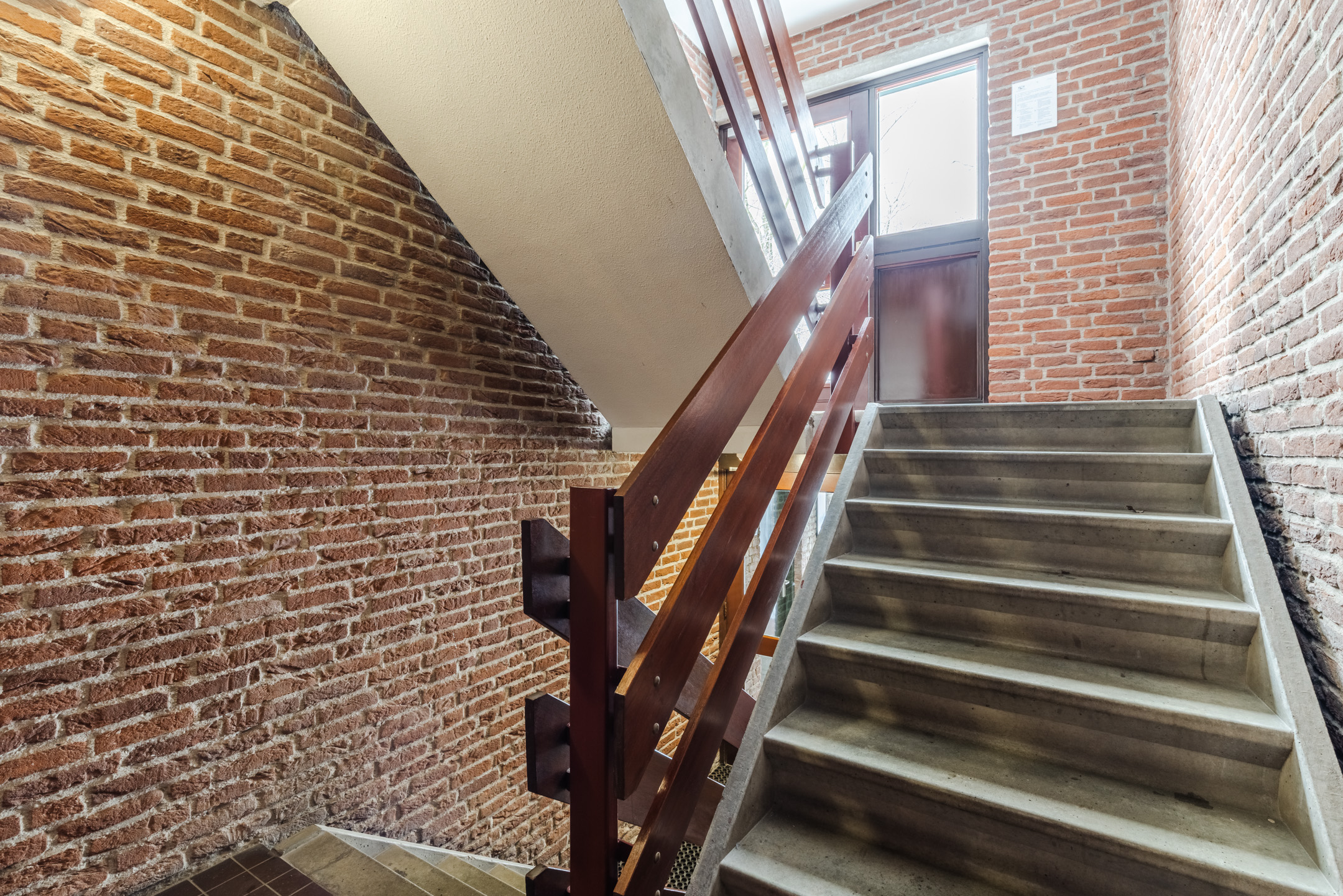 Intercom/bellentableau, brievenbussen, entree, centrale hal, trapopgang naar de verdiepingen.