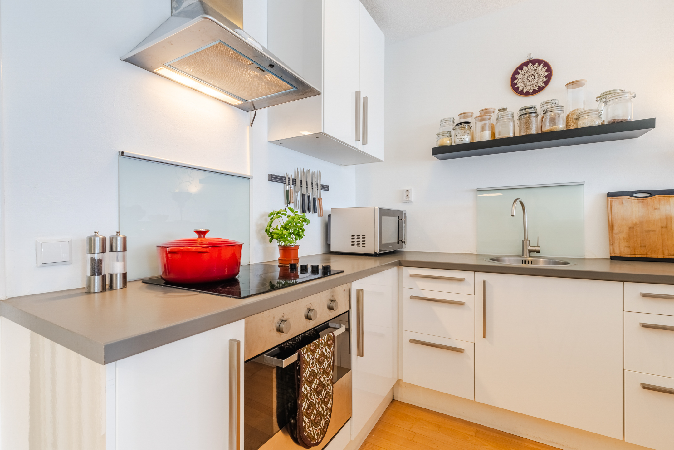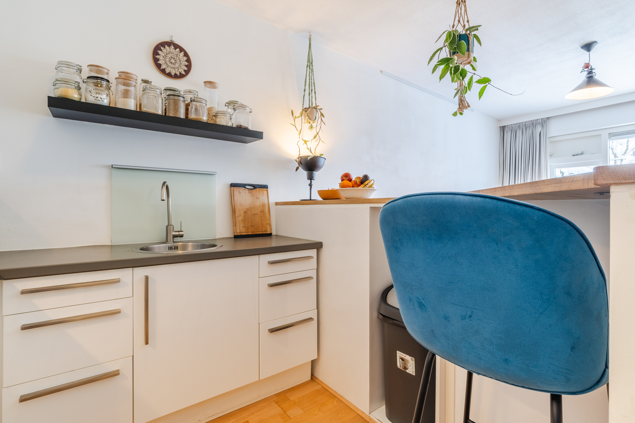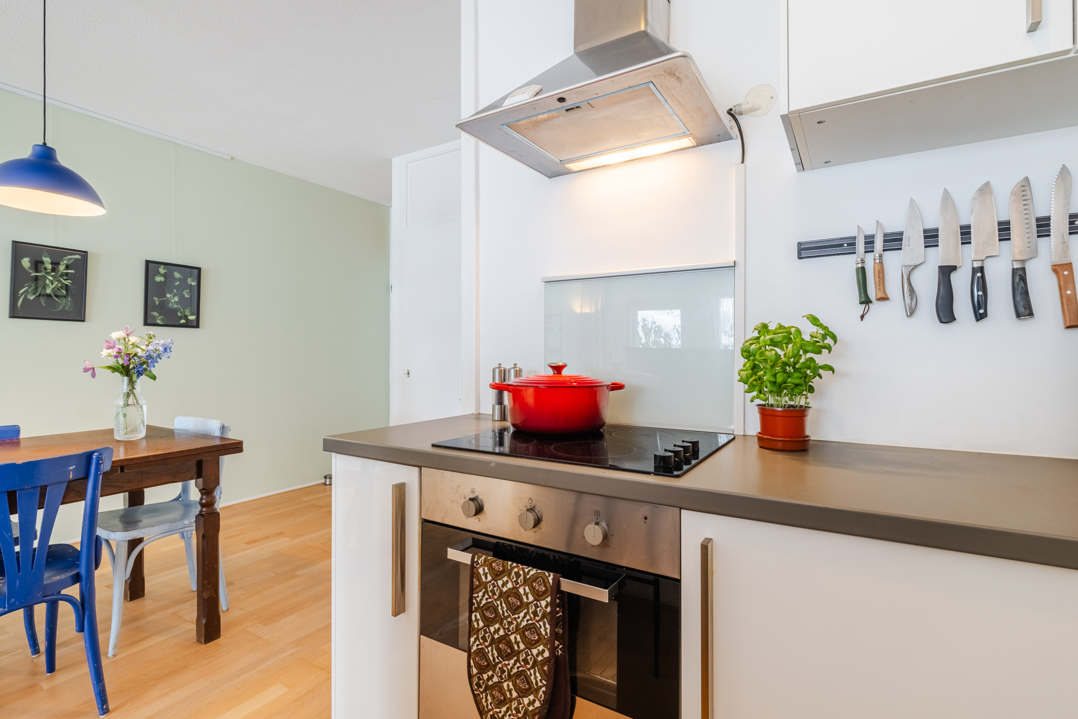 Aan de achterzijde van de woonkamer bevindt zich een open moderne open keuken in een L-opstelling voorzien van inbouwapparatuur (afzuigkap, kookplaat en een oven) en een losse magnetron en een losse koel-/vriescombinatie. Daarnaast beschikt de keuken over een fijne ontbijt/borrelbar met opbergkast en een eettafelopstelling