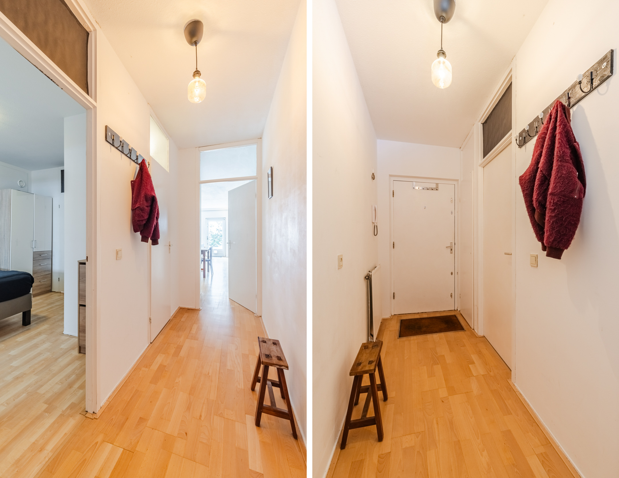 Voordeur, entree, lange hal met garderobe, toiletruimte v.v. hangend toilet en fontein en toegang tot de slaapkamer en de keuken annex woonkamer.