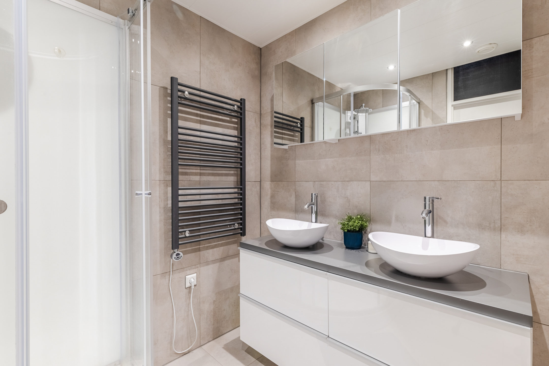 De royale slaapkamer, bereikbaar vanuit de hal laat zich makkelijk indelen voor een groot 2-persoonsbed en kastruimte. Vanuit de slaapkamer is de inpandige badkamer bereikbaar. Deze moderne en neutrale badkamer, uitgevoerd in een lichte betegeling, is voorzien van een dubbele wastafelmeubel, designerradiator en douche. Daarnaast zit in de badkamer de opstelmogelijkheid voor de wasmachine.