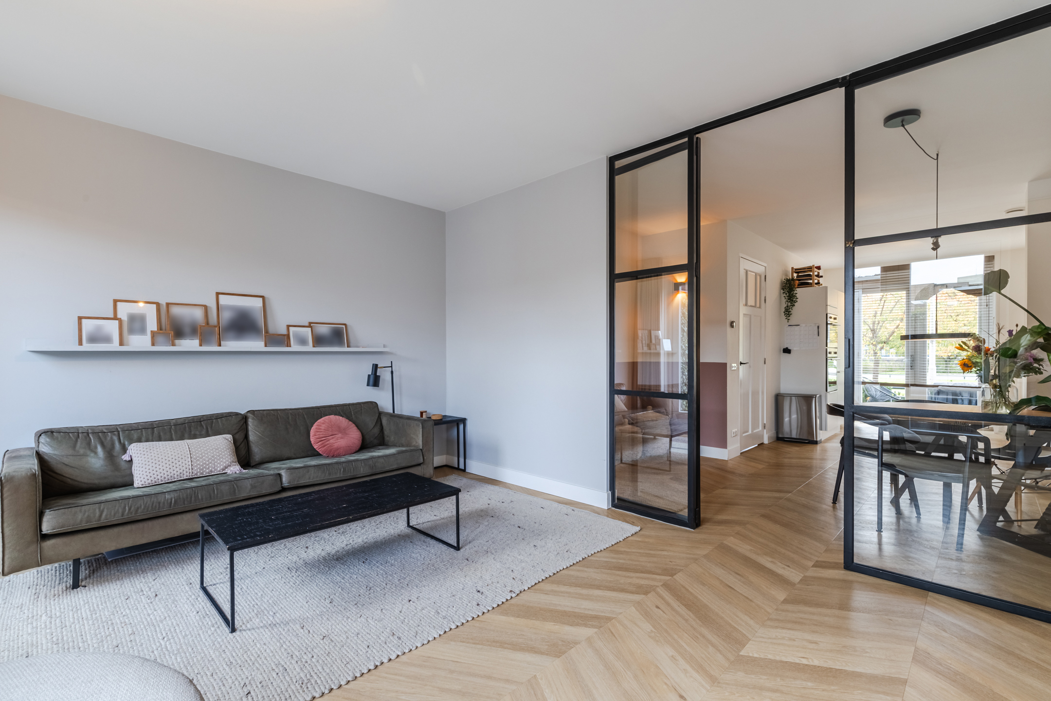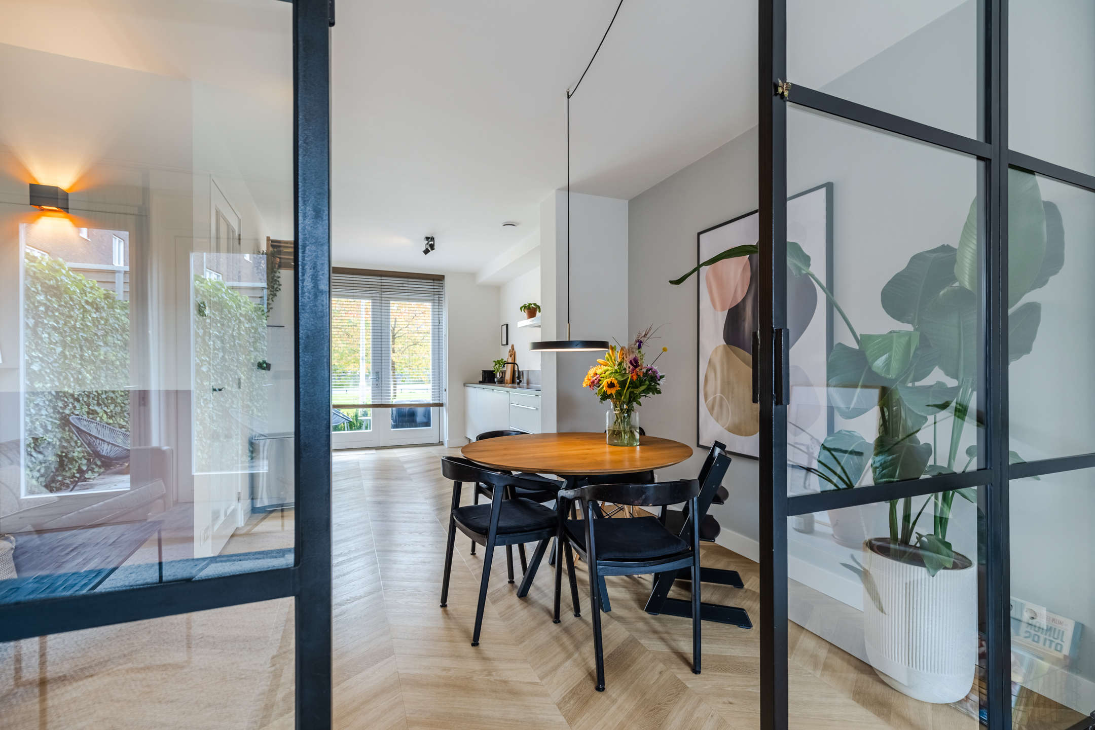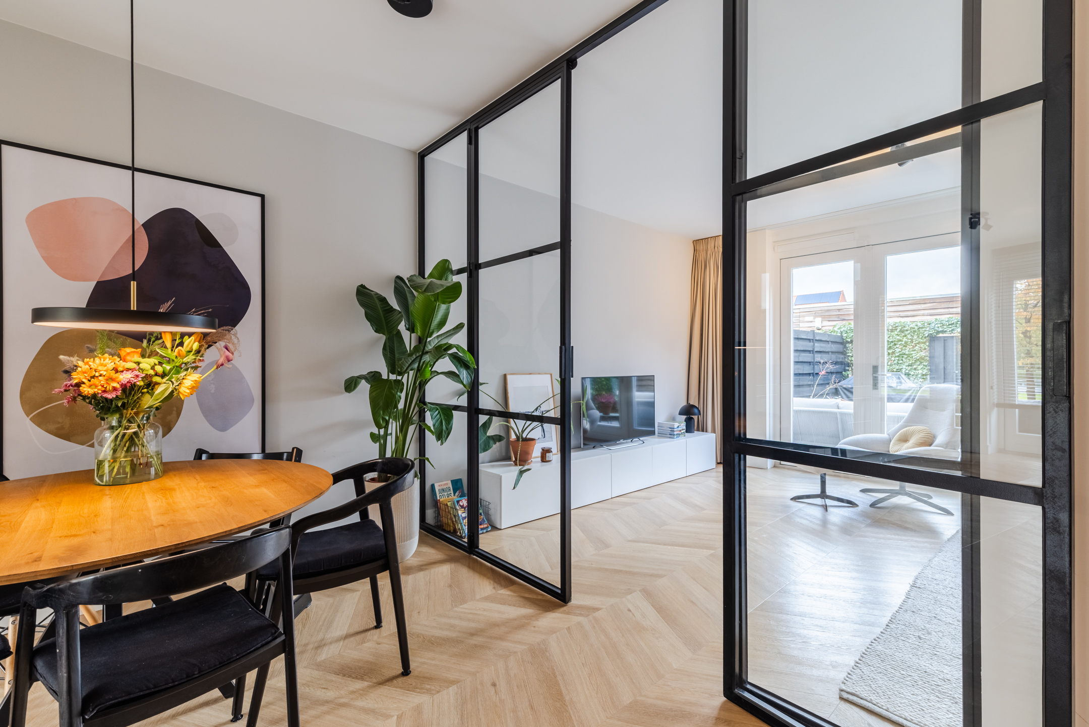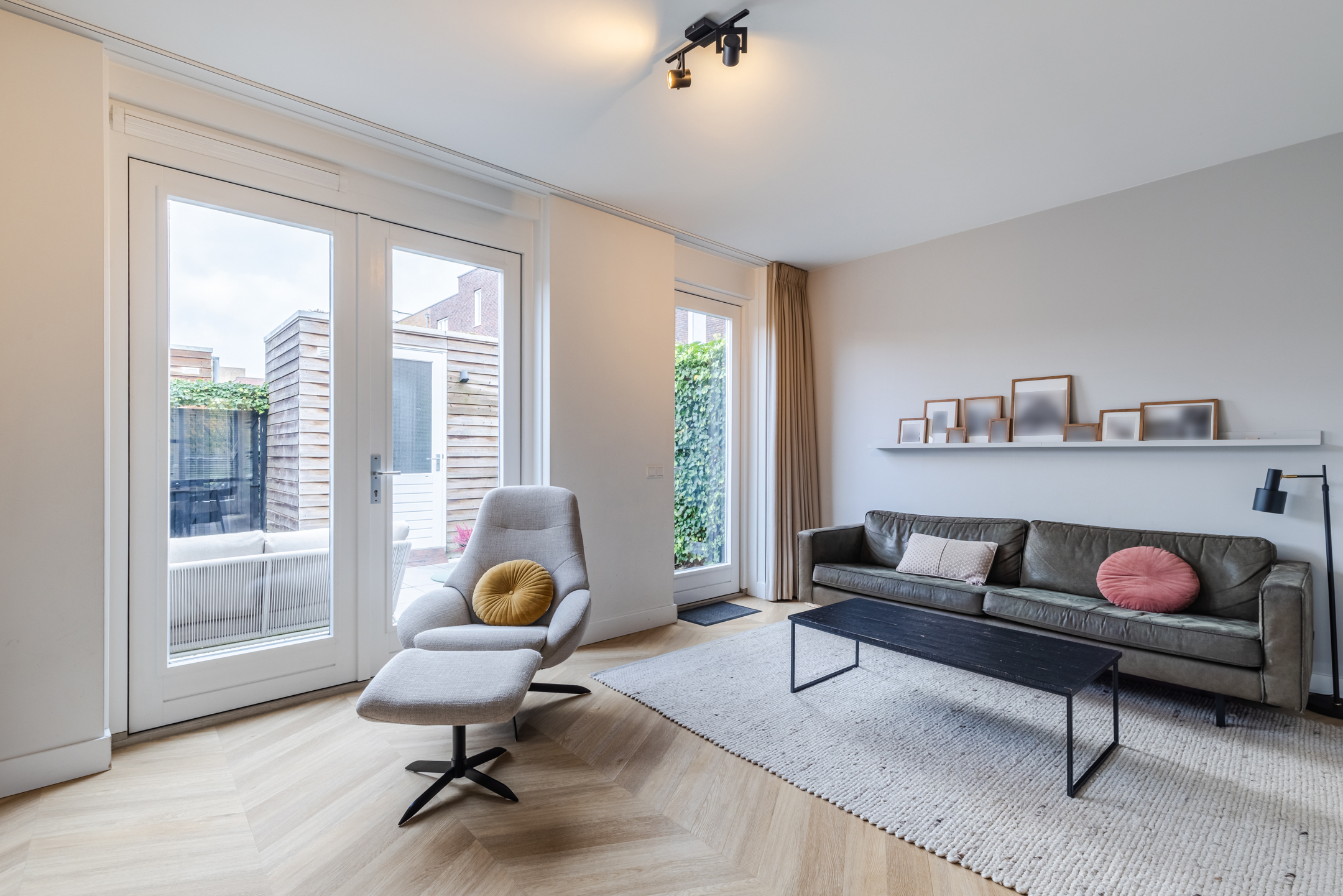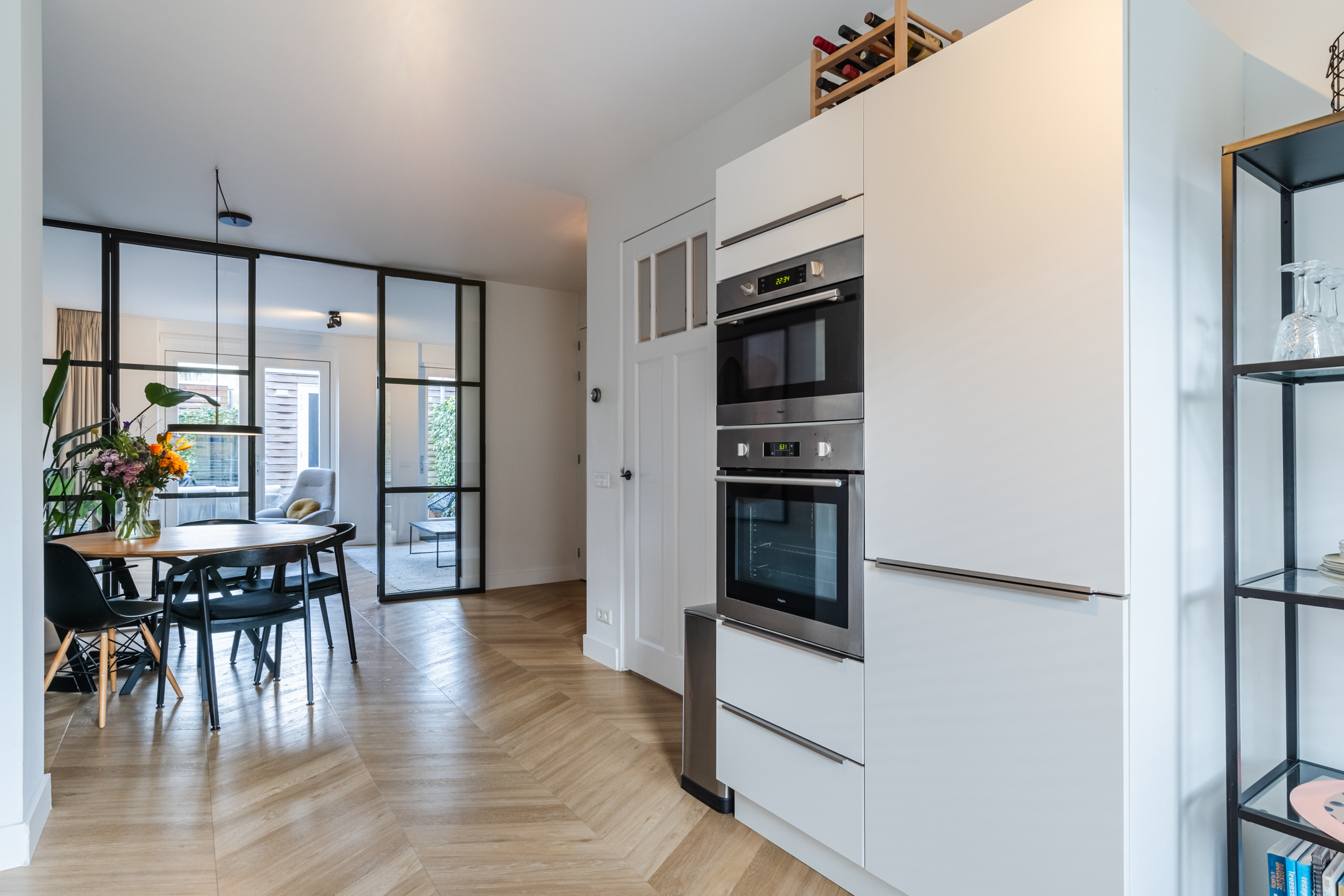 De gezellige zithoek bevindt zich aan de achterzijde van de woning en wordt subtiel, middels zwart stalen en-suite wand, van de keukenruimte gescheiden. Deze ruimte is eenvoudig op diverse manieren in te delen. Middels de openslaande deuren bereik je de achtertuin.