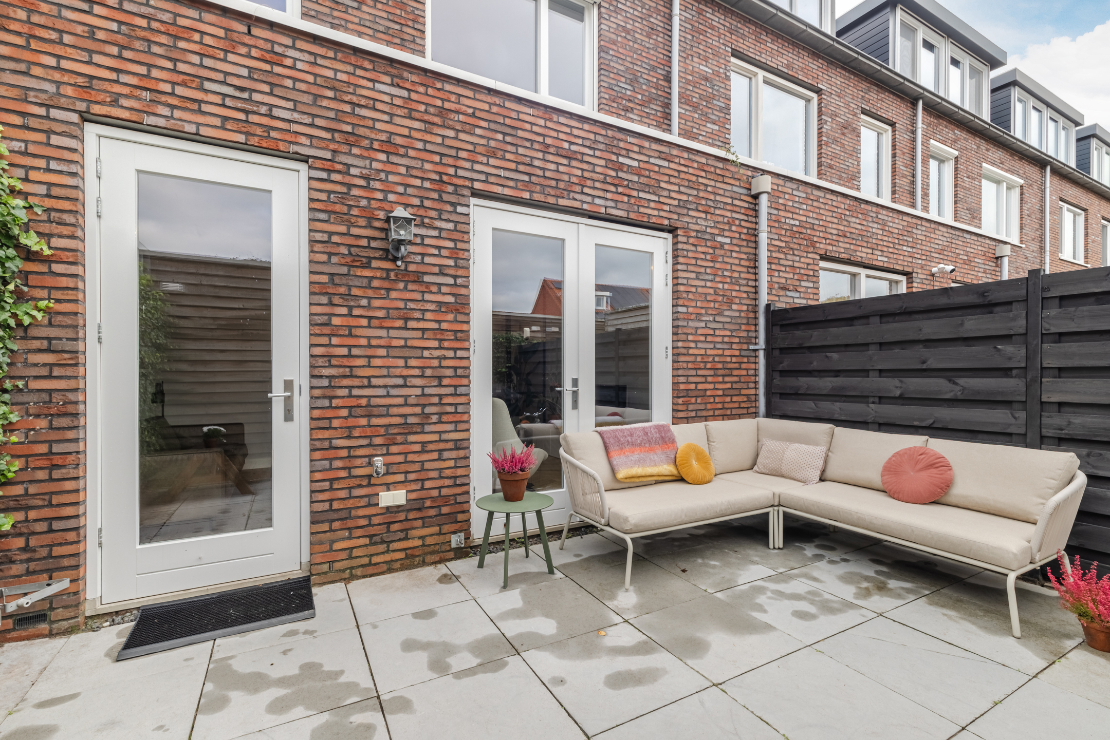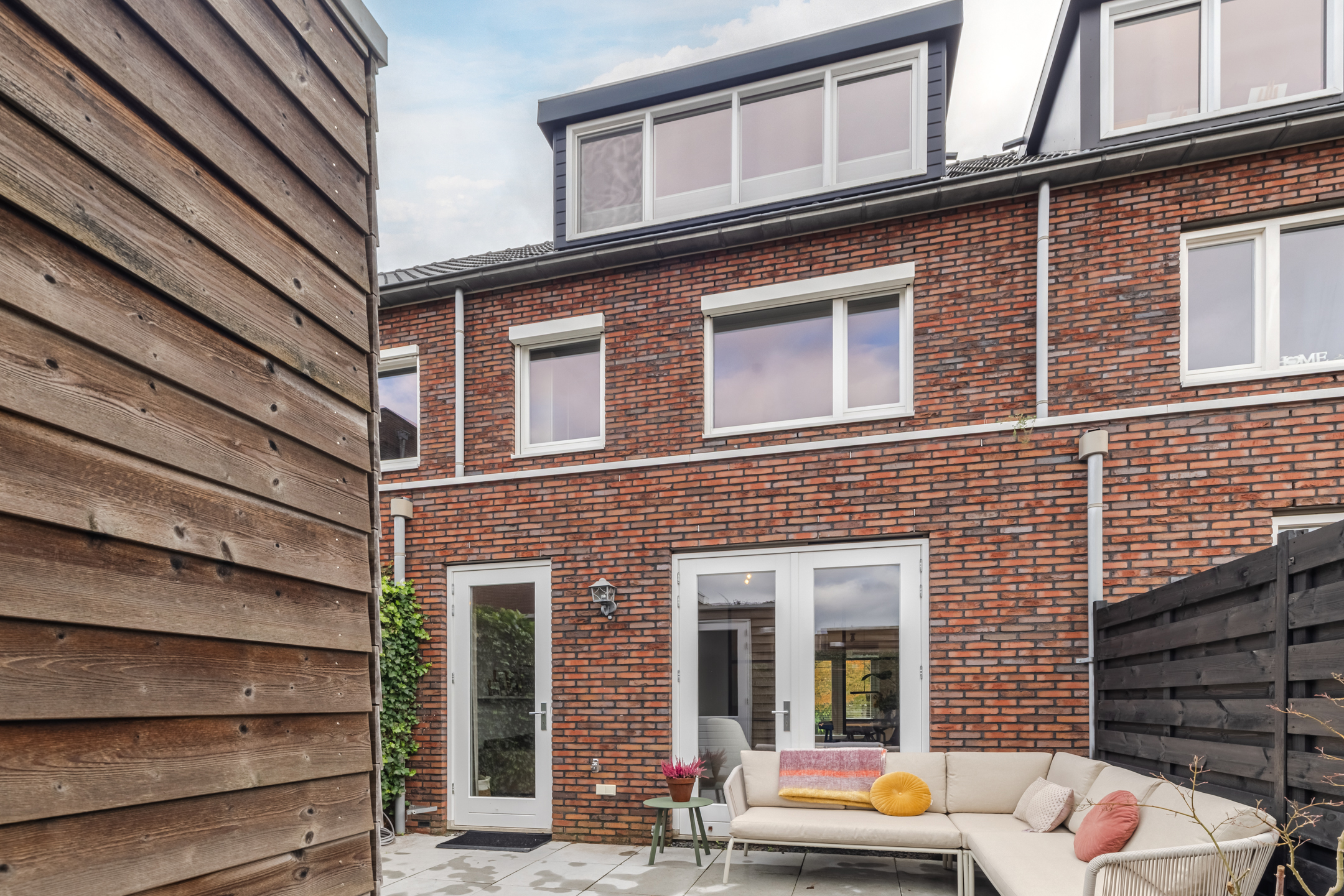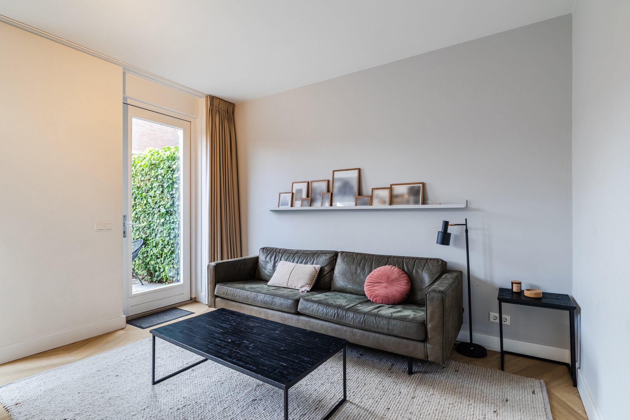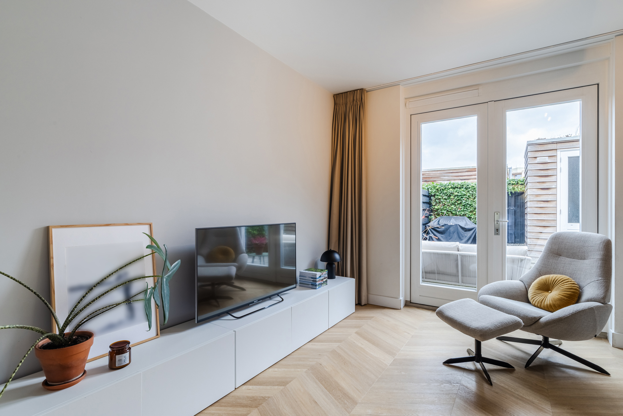 De gezellige zithoek bevindt zich aan de achterzijde van de woning en wordt subtiel, middels zwart stalen en-suite wand, van de keukenruimte gescheiden. Deze ruimte is eenvoudig op diverse manieren in te delen. Middels de openslaande deuren bereik je de achtertuin.