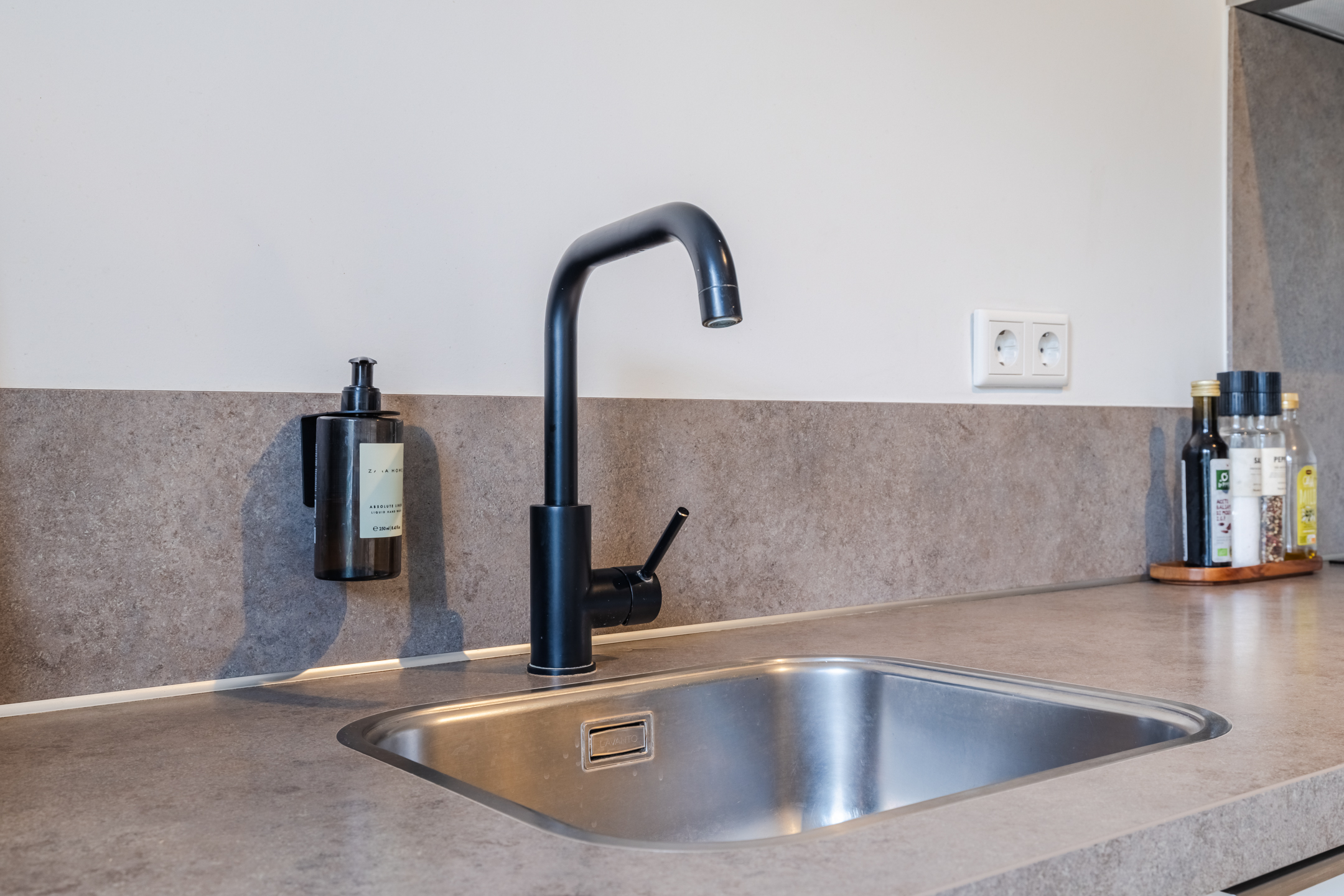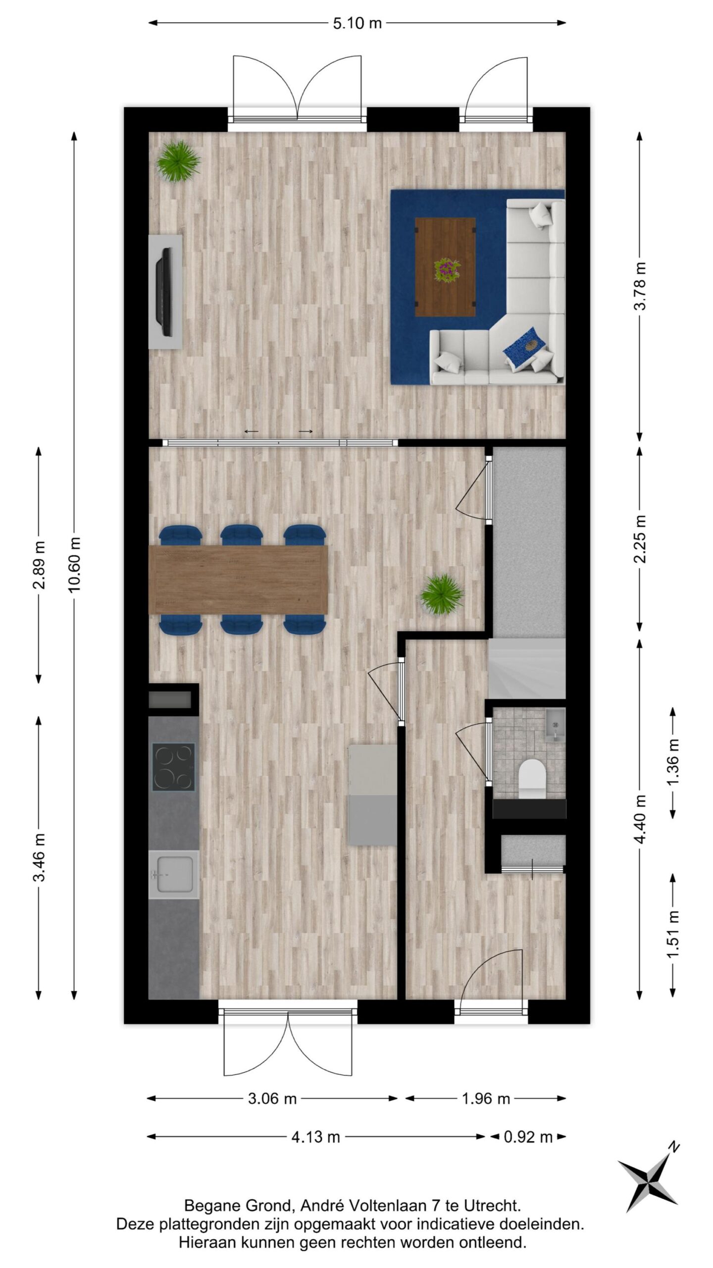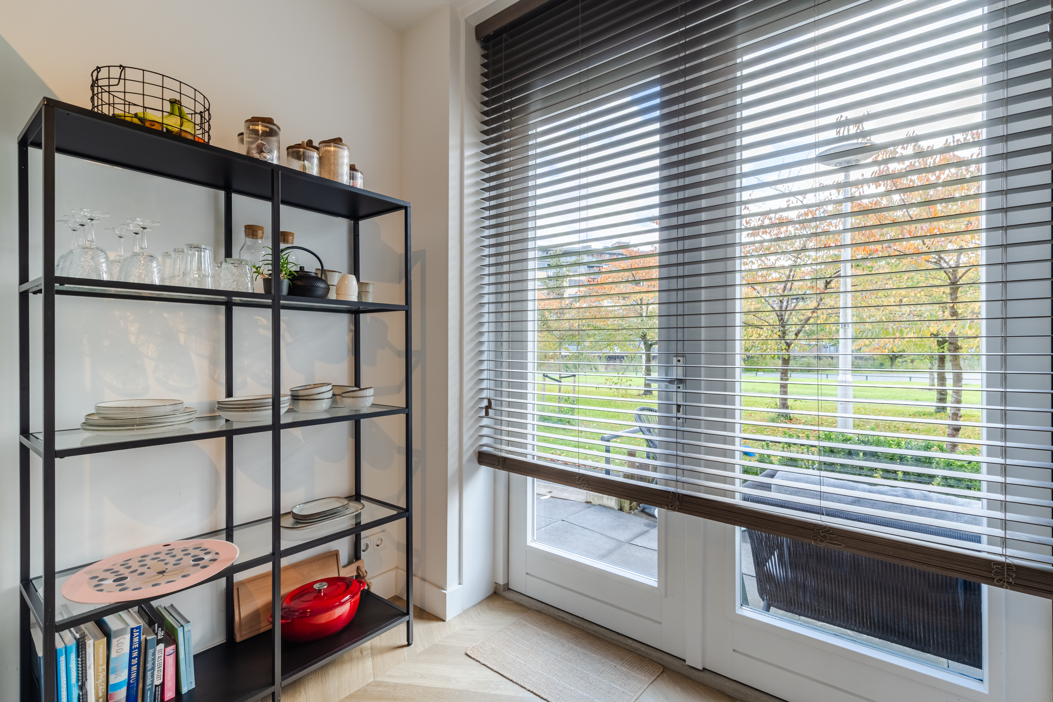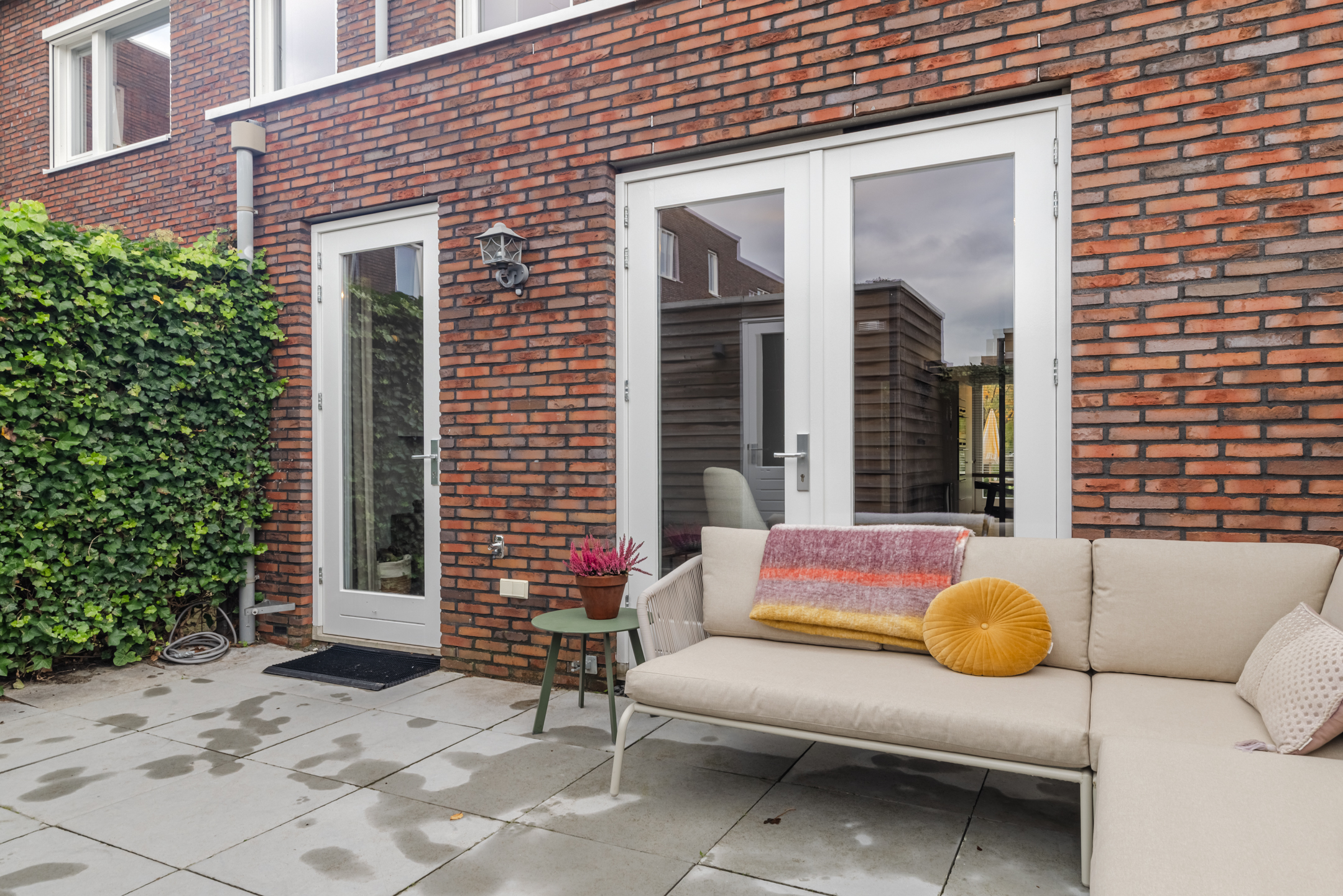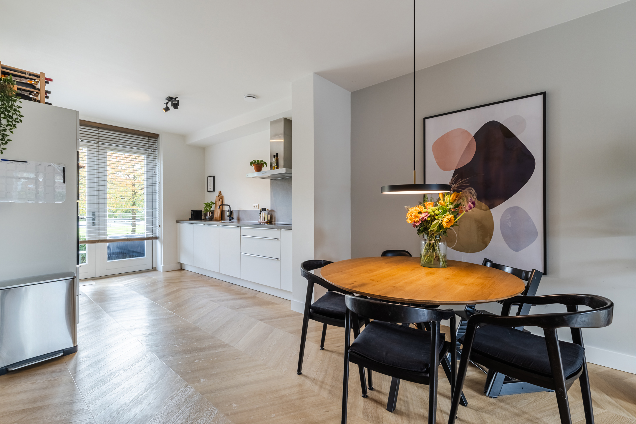 De gezellige zithoek bevindt zich aan de achterzijde van de woning en wordt subtiel, middels zwart stalen en-suite wand, van de keukenruimte gescheiden. Deze ruimte is eenvoudig op diverse manieren in te delen. Middels de openslaande deuren bereik je de achtertuin.