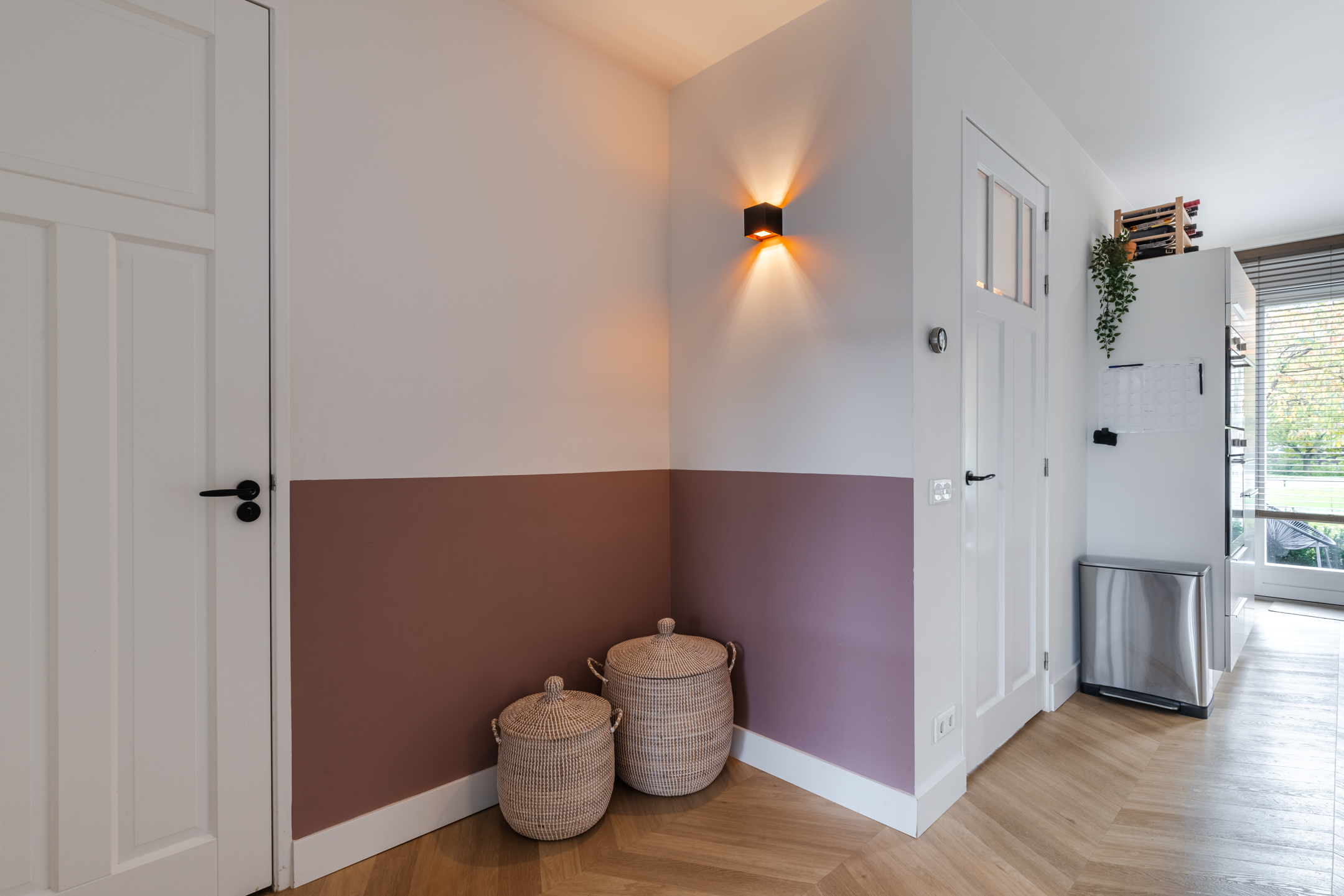 Entree, hal, toiletruimte v.v. hangend toilet en fontein, meterkast en de trapopgang naar de eerste verdieping. Via een houten paneeldeur met glas kom je in de woonkamer terecht. Wat direct opvalt is algehele strakke afwerking van de woonlaag, de prachtige PVC- houtlookvloer, gelegd in een mooie Hongaarse punt en voorzien van vloerverwarming, en de hoeveelheid licht die de woonkamer binnenkomt dankzij de grote raampartijen aan de voor-/ en achterzijde van de woning.