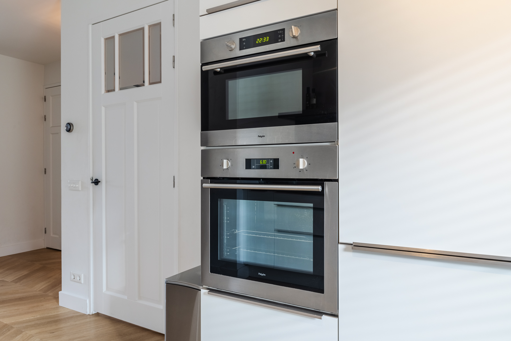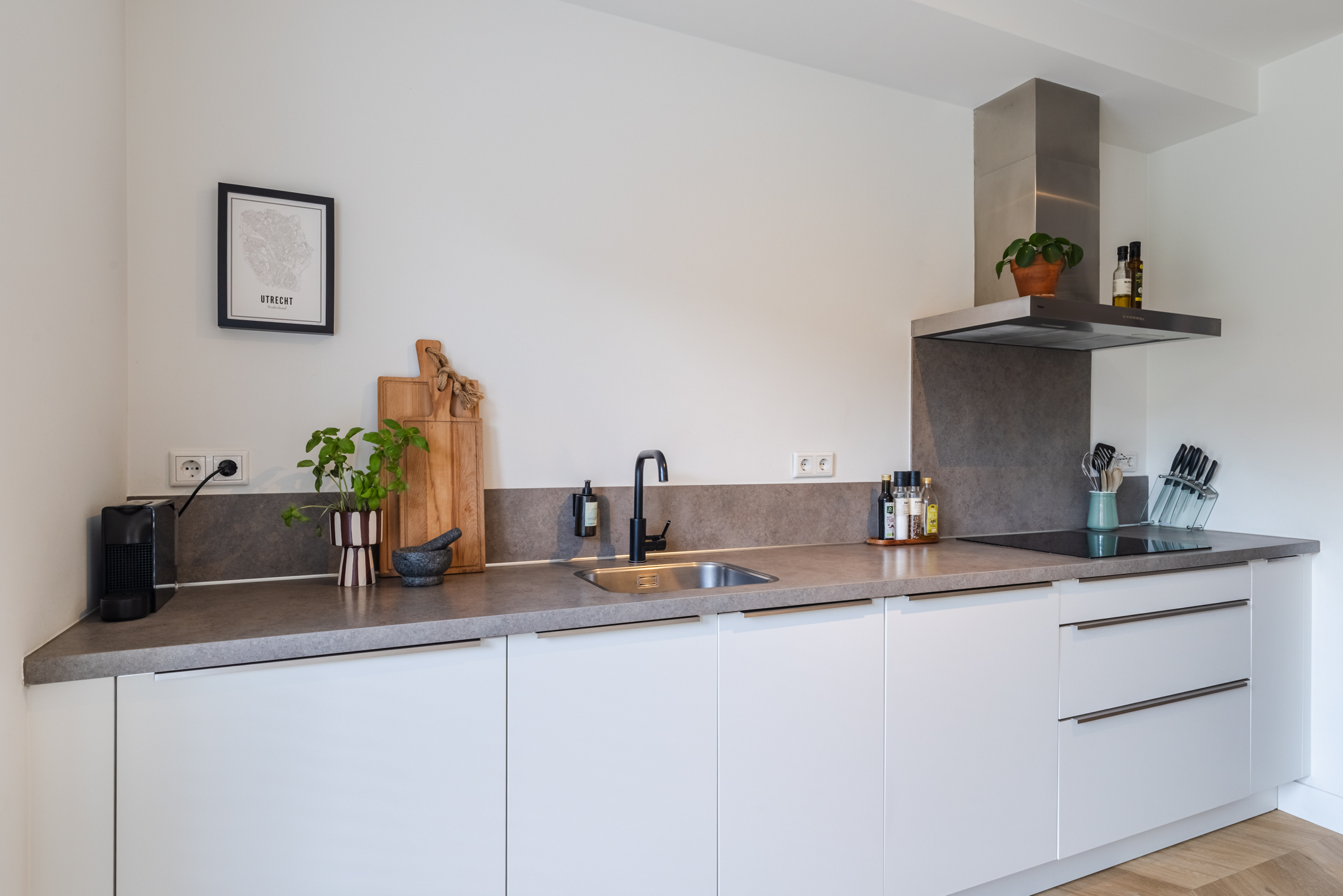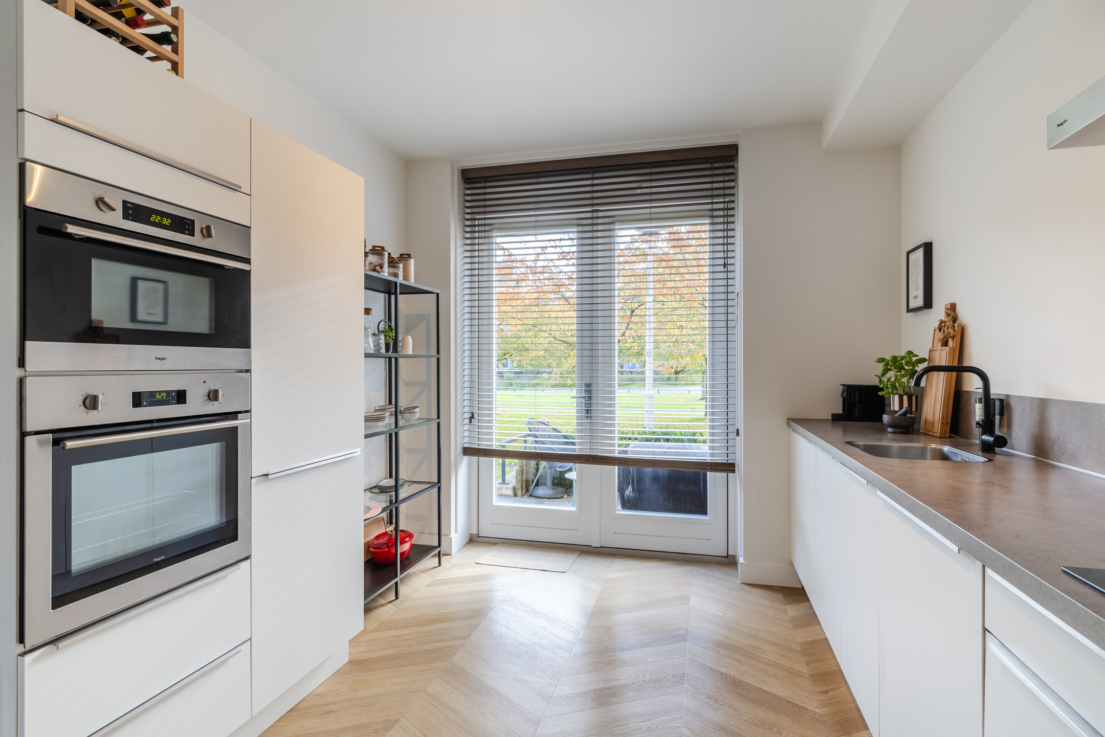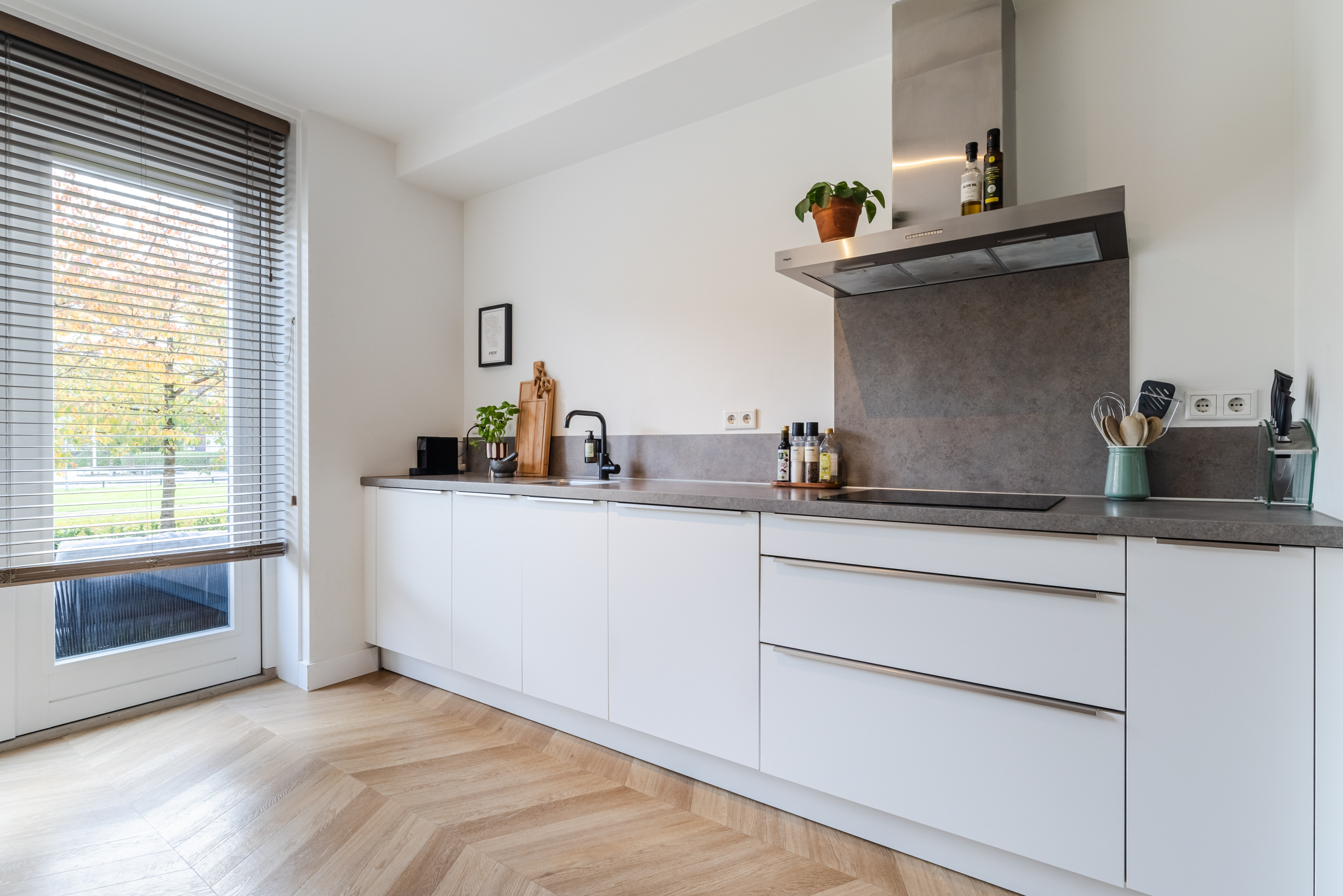 Aan de voorzijde van de woning bevindt zich de moderne, stijlvolle keuken. De keuken is opgesteld in een wandopstelling met een apparatenwand en uitgevoerd in een tijdloze witte kleurstelling. Verder is de keuken voorzien van diverse inbouwapparatuur zoals een inductie kookplaat, een rvs- afzuigkap, een vaatwasser, een koel-/ vriescombinatie, een oven en een combimagnetron. Via de grote raampartij aan de voorzijde kijk je heerlijk vrij weg over de groenstrook.