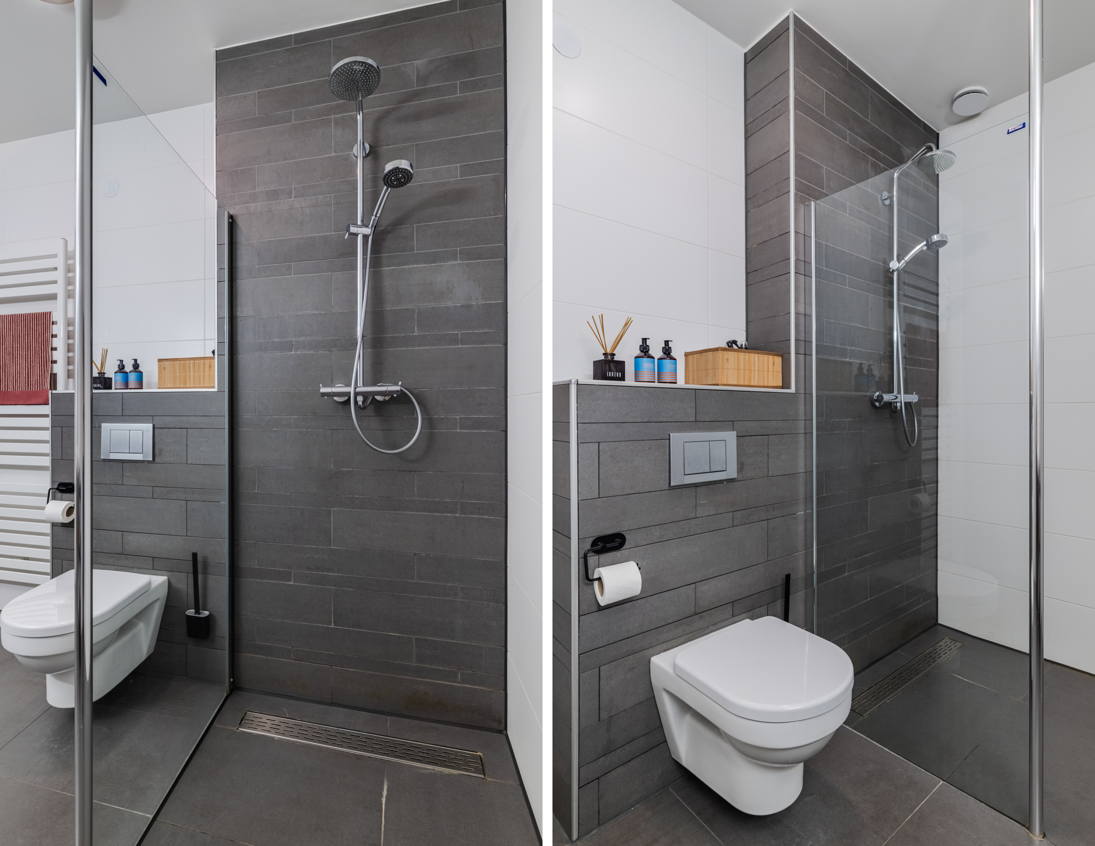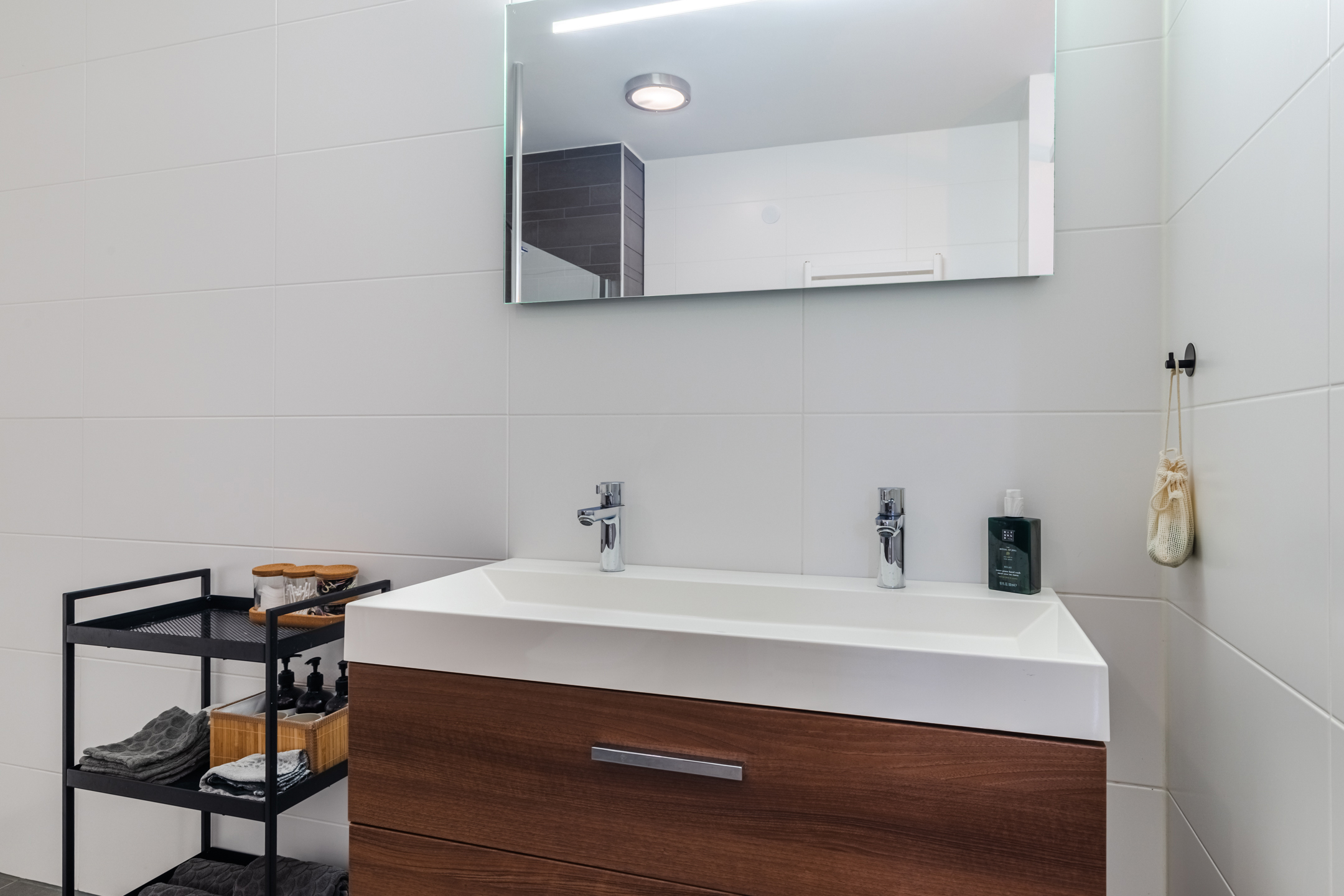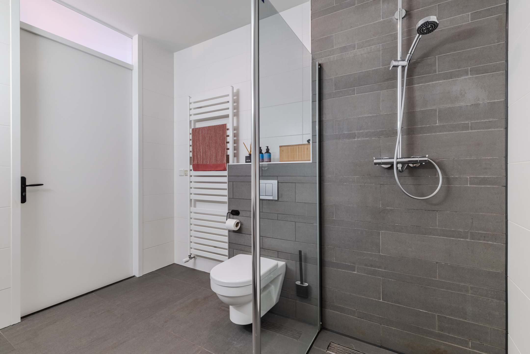 In het midden van deze verdieping is de moderne badkamer gesitueerd. Deze ruimte is geheel betegeld in een moderne wit/ donkergrijze betegeling en voorzien van een toilet, inloopdouche en dubbele wastafel met meubel en spiegel. De ruimte wordt op mechanische wijze geventileerd.