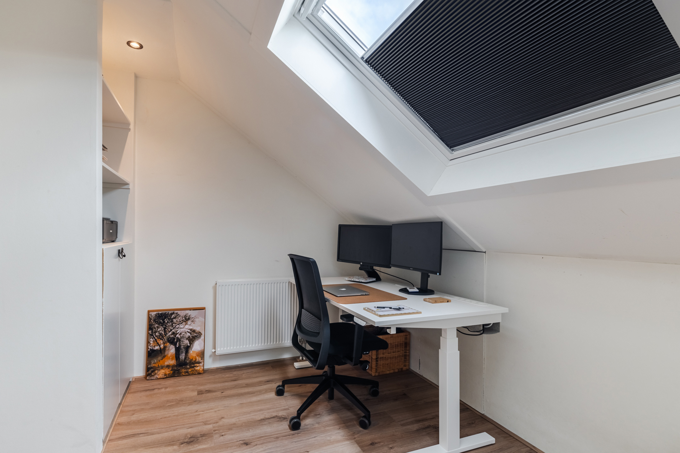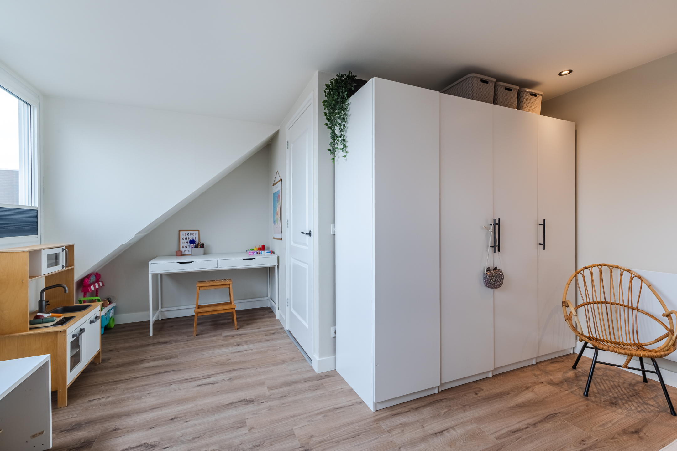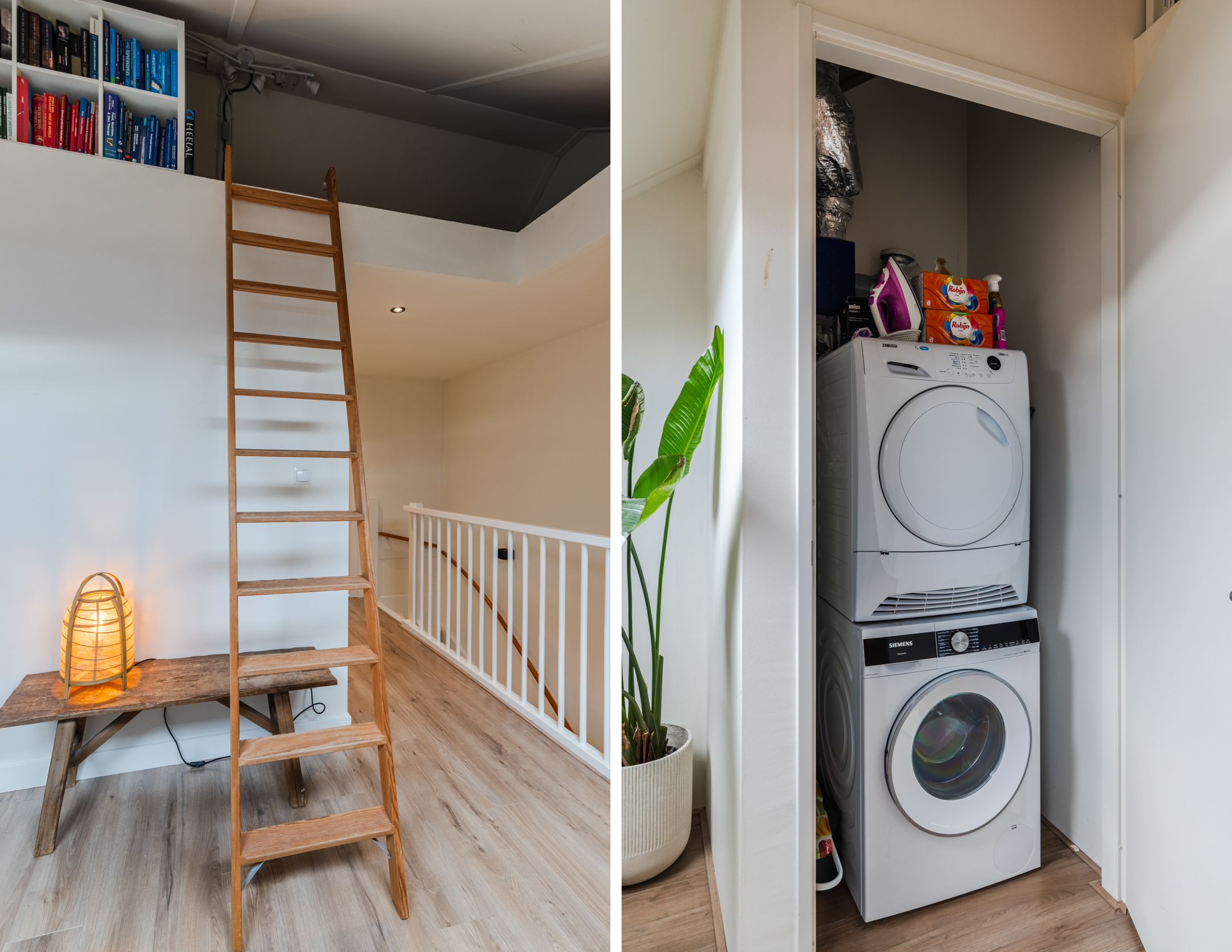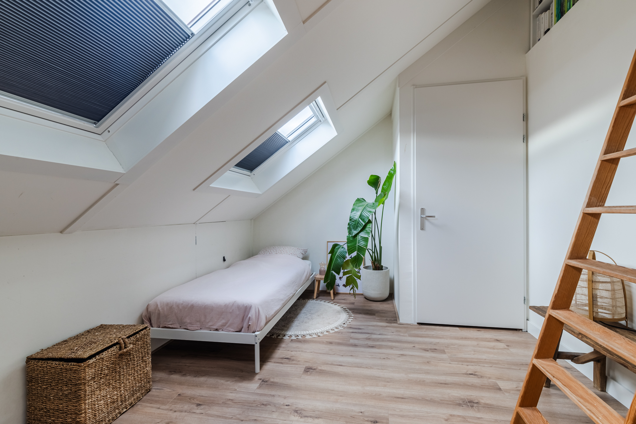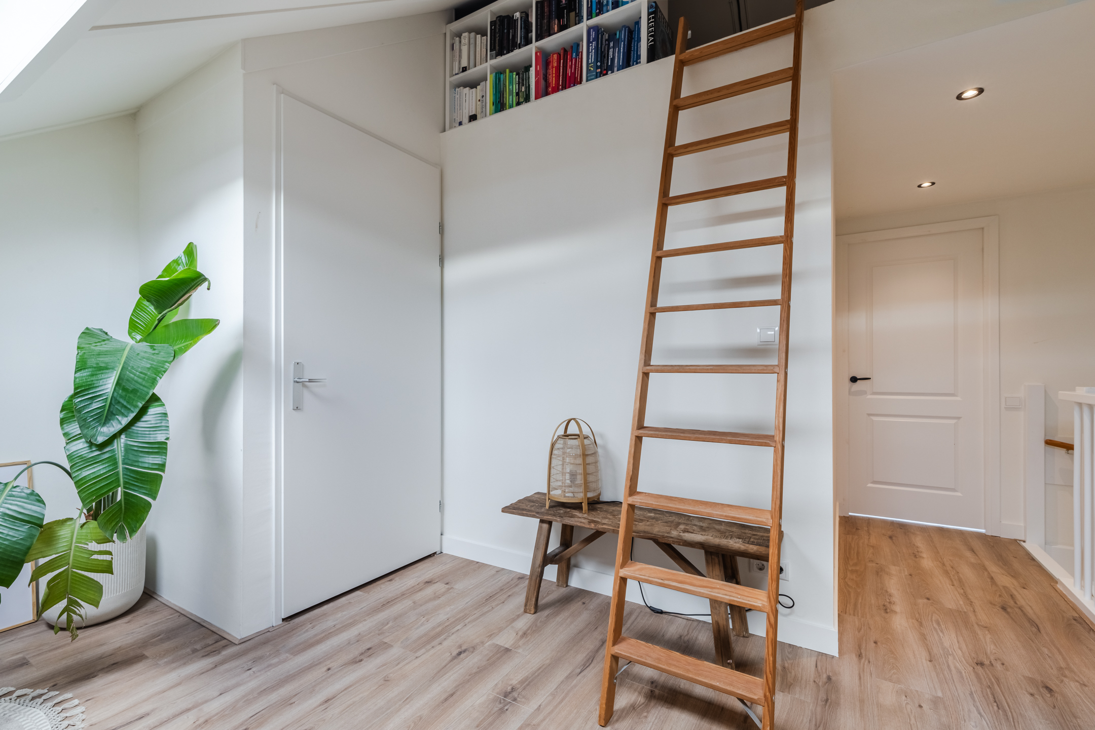 Riante overloop waar zich tevens de opstelplaats voor de wasmachine, droger en MV-box bevindt, keurig weggewerkt in een kast. De overloop is voorzien van twee grote dakramen en biedt voldoende plaats voor het creëren van een slaapkamer en/of fijne werk-/ of studeerplek. Middels een kleine ladder is de vliering te bereiken. Ideaal voor het opbergen van zaken die je niet dagelijks nodig hebt.