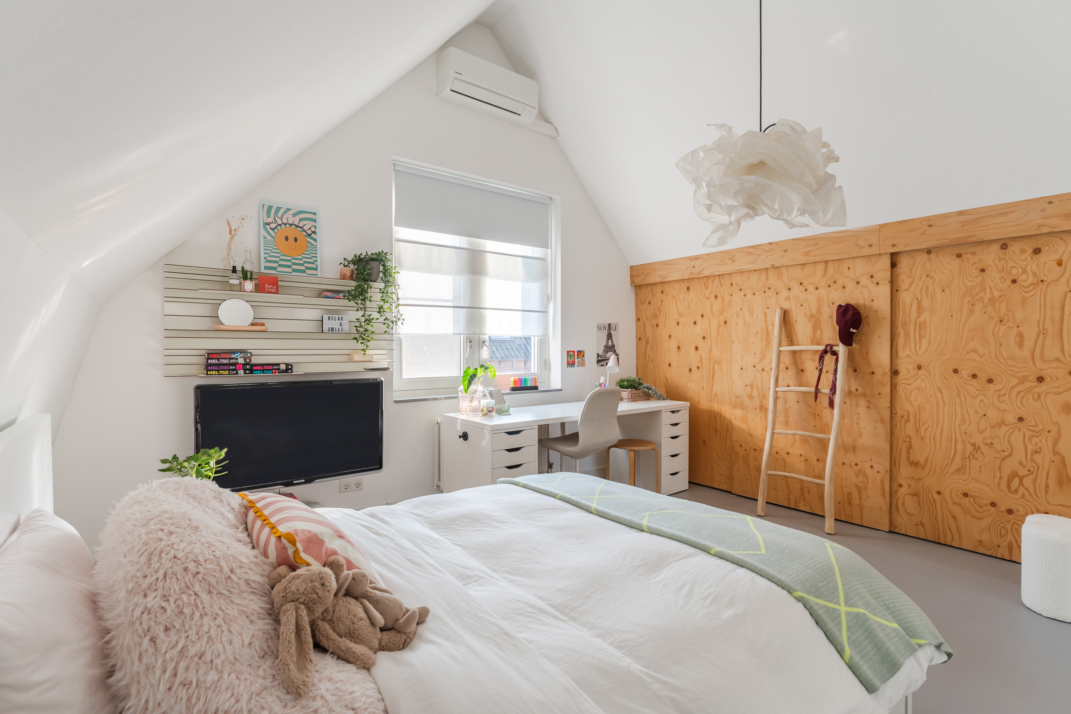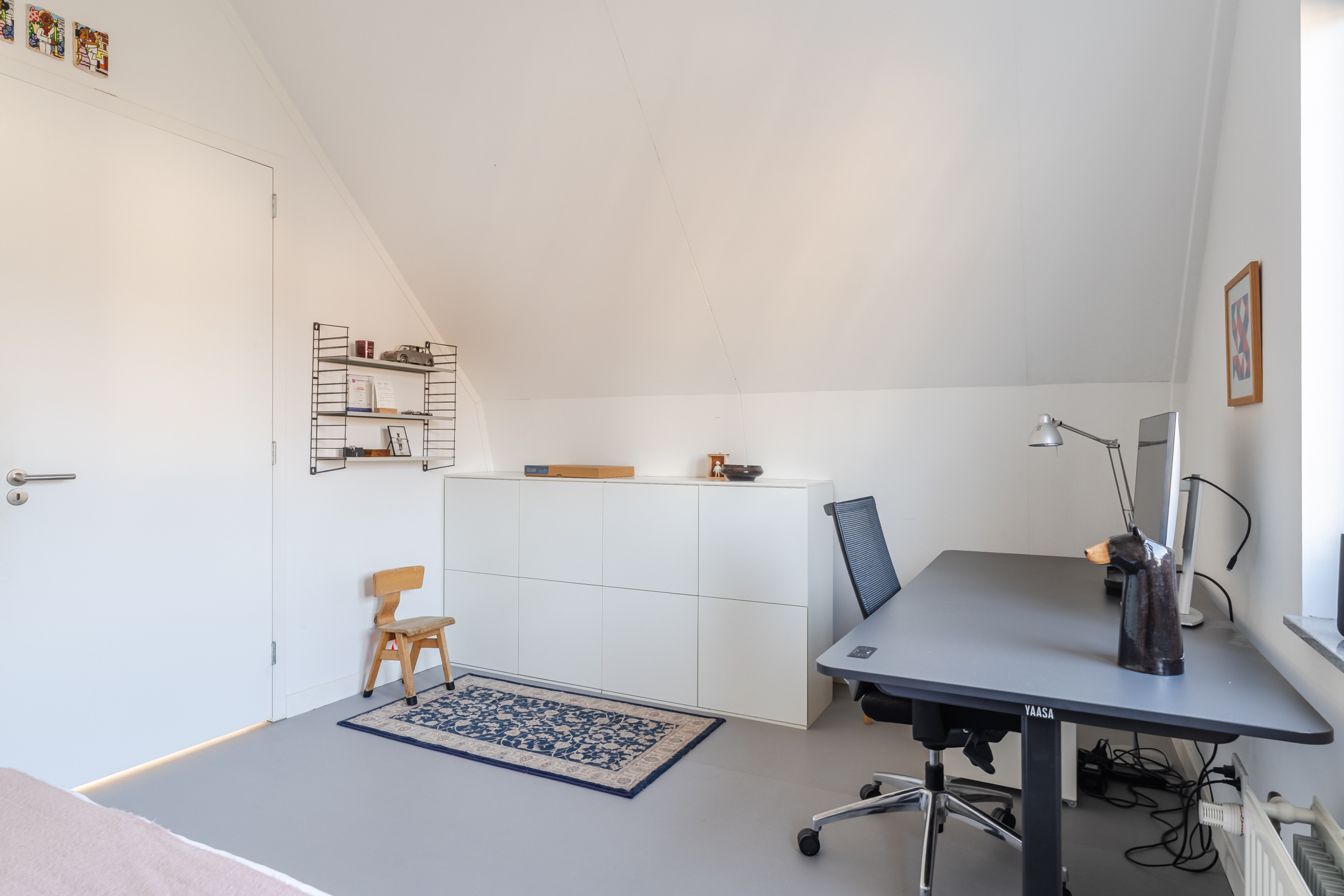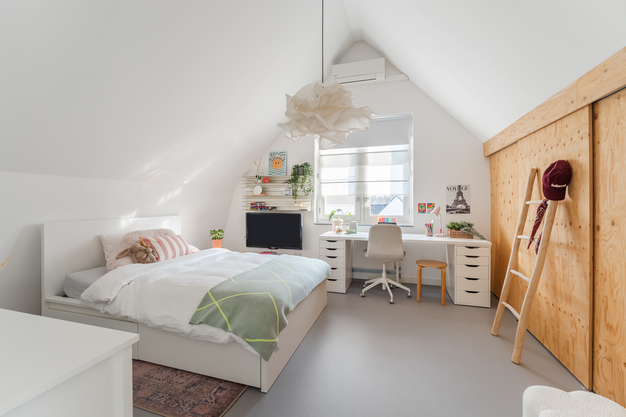Aan de westzijde van de woning bevindt zich de tweede slaapkamer (ca. 4.16 m x 4.47m) , eveneens gelegen over de diepte van de woning. Deze kamer beschikt over een airco, een schuifwand met bergruimte en een toegangsluik naar de vliering boven de badkamer en overloop.