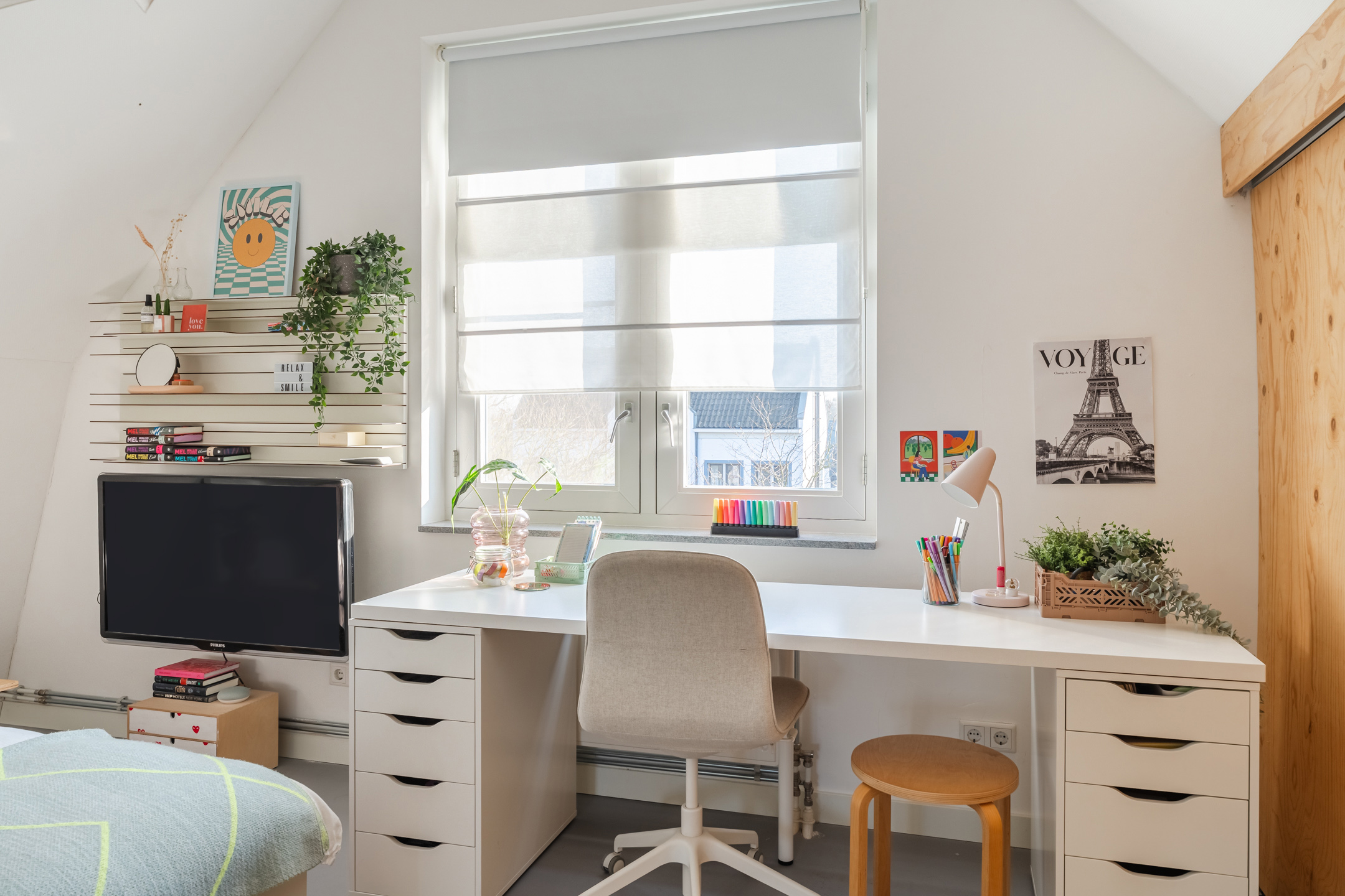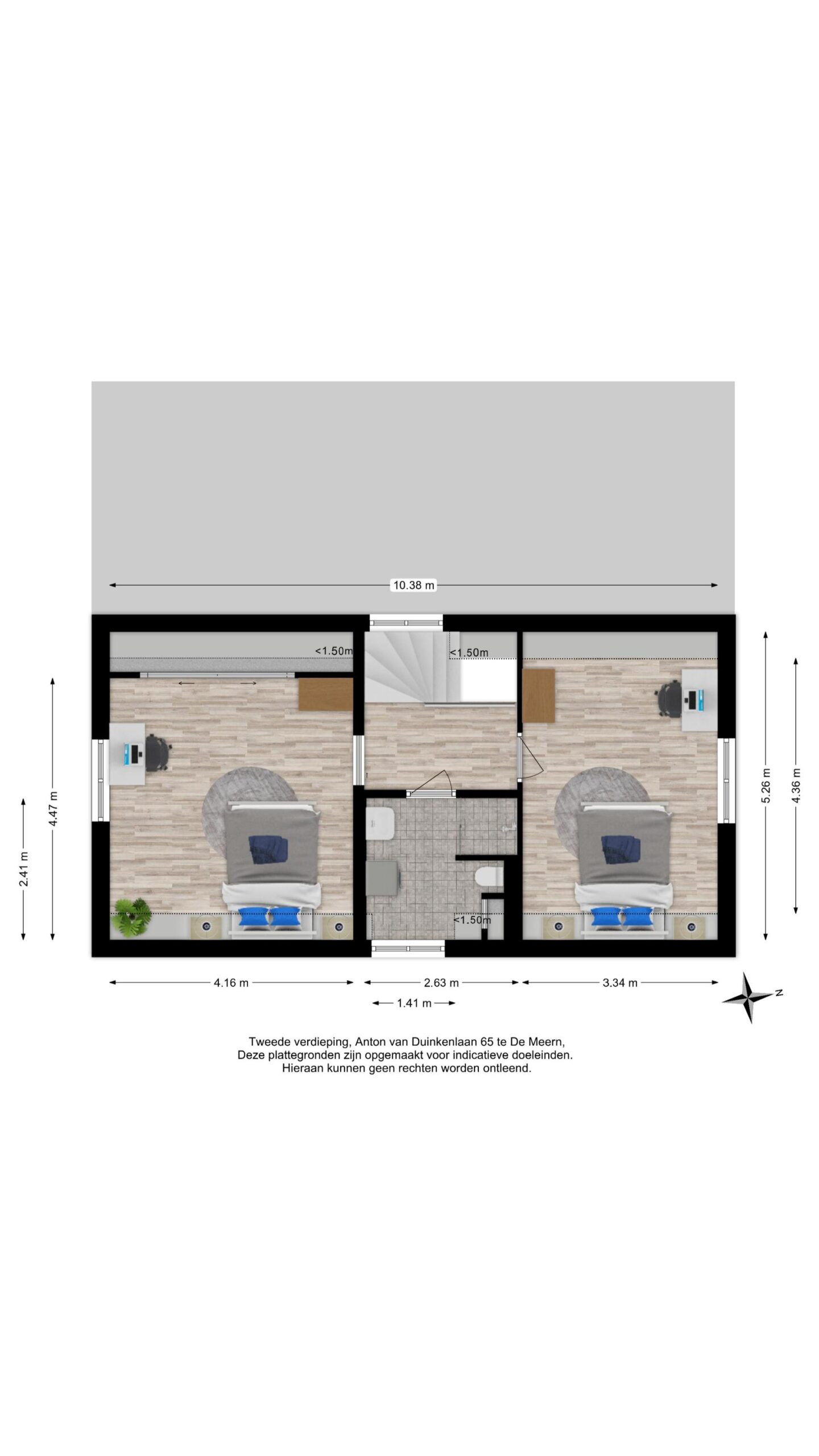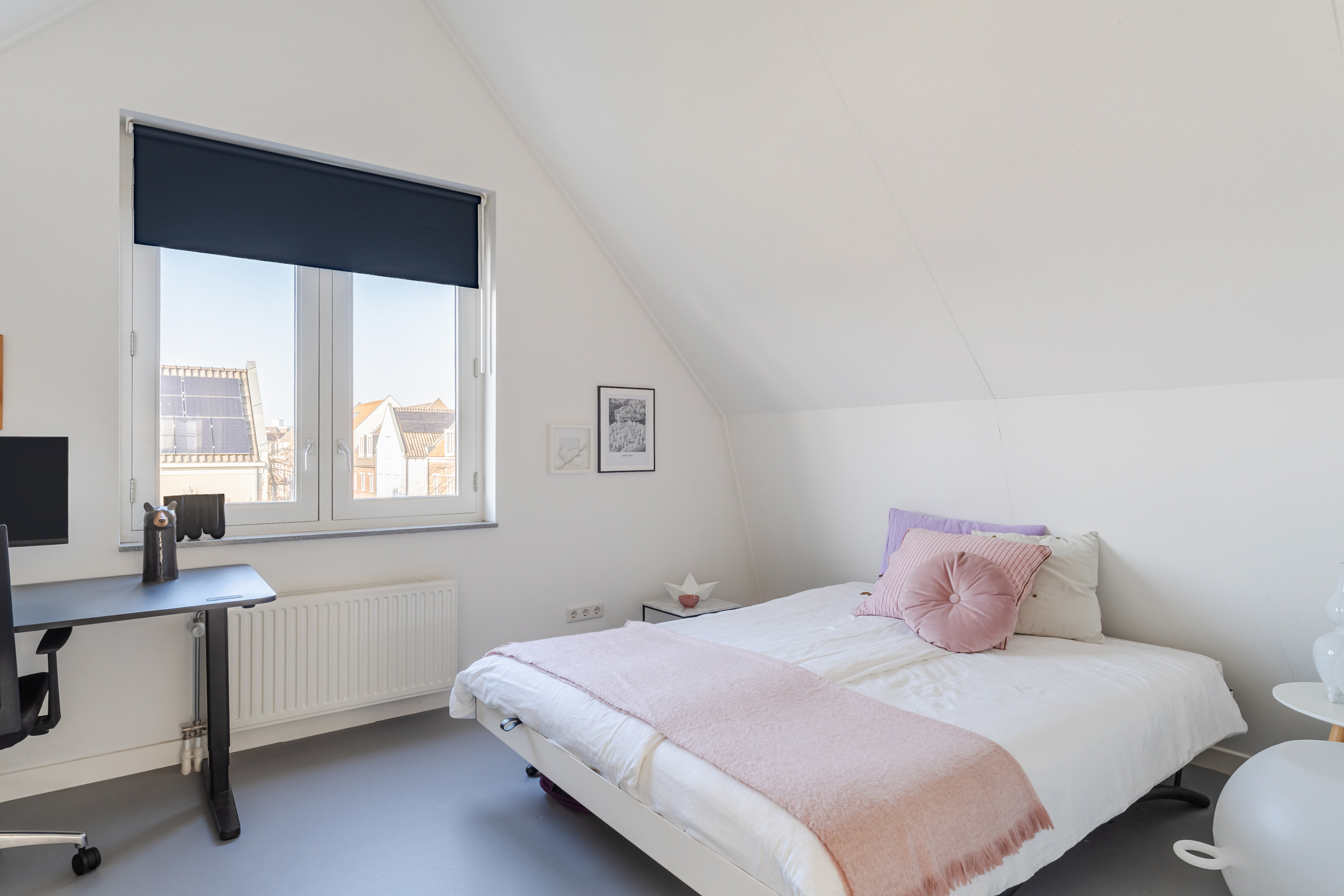 Aan de westzijde van de woning bevindt zich de tweede slaapkamer (ca. 4.16 m x 4.47m) , eveneens gelegen over de diepte van de woning. Deze kamer beschikt over een airco, een schuifwand met bergruimte en een toegangsluik naar de vliering boven de badkamer en overloop.