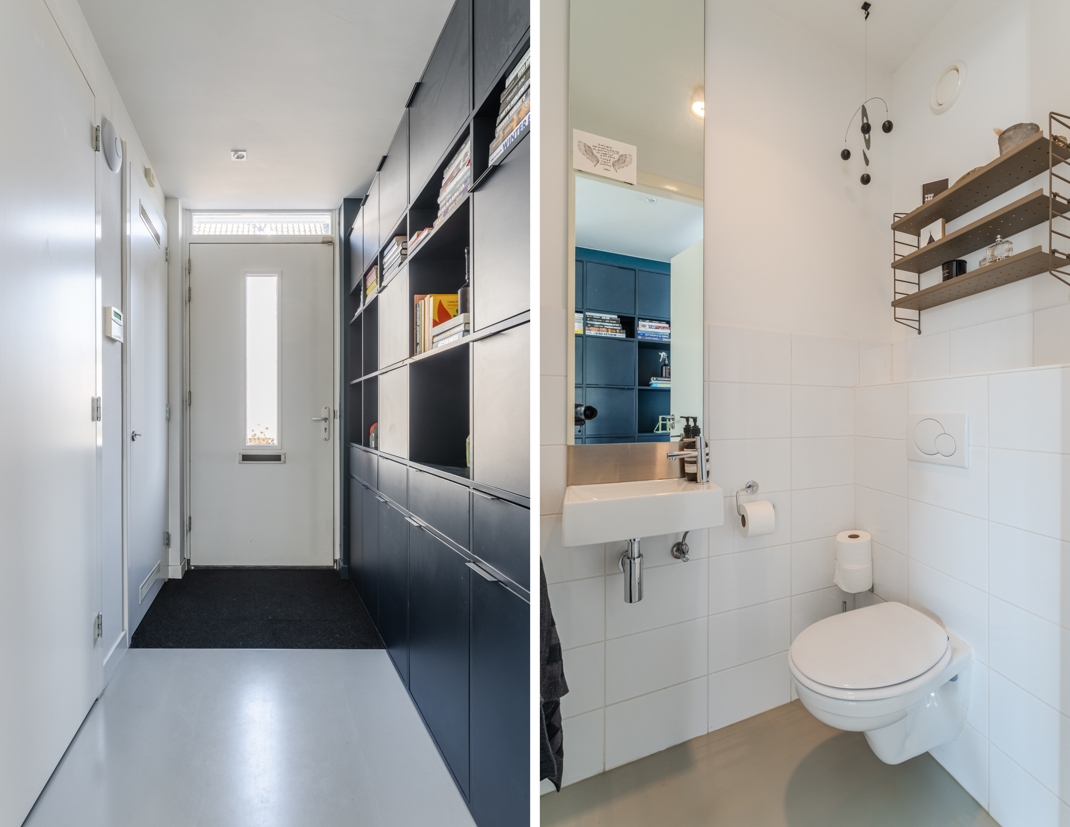Entree, ruime hal, garderobe, meterkast, toiletruimte (uitgevoerd in een moderne, neutrale betegeling) met hangend toilet en fontein. Vanuit de hal heb je toegang tot de woonkamer, de keuken, de kelder en de trapopgang naar de eerste verdieping.
