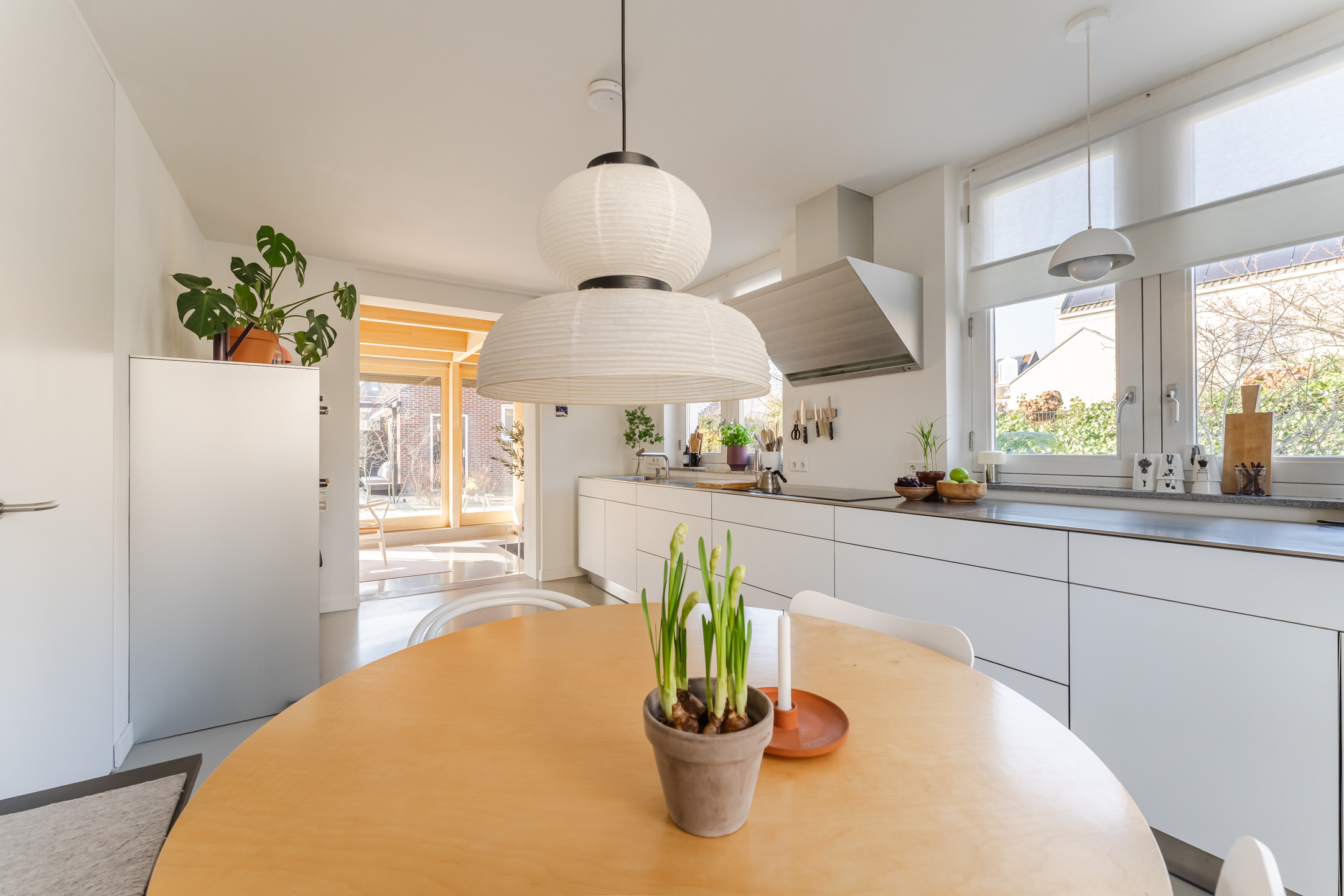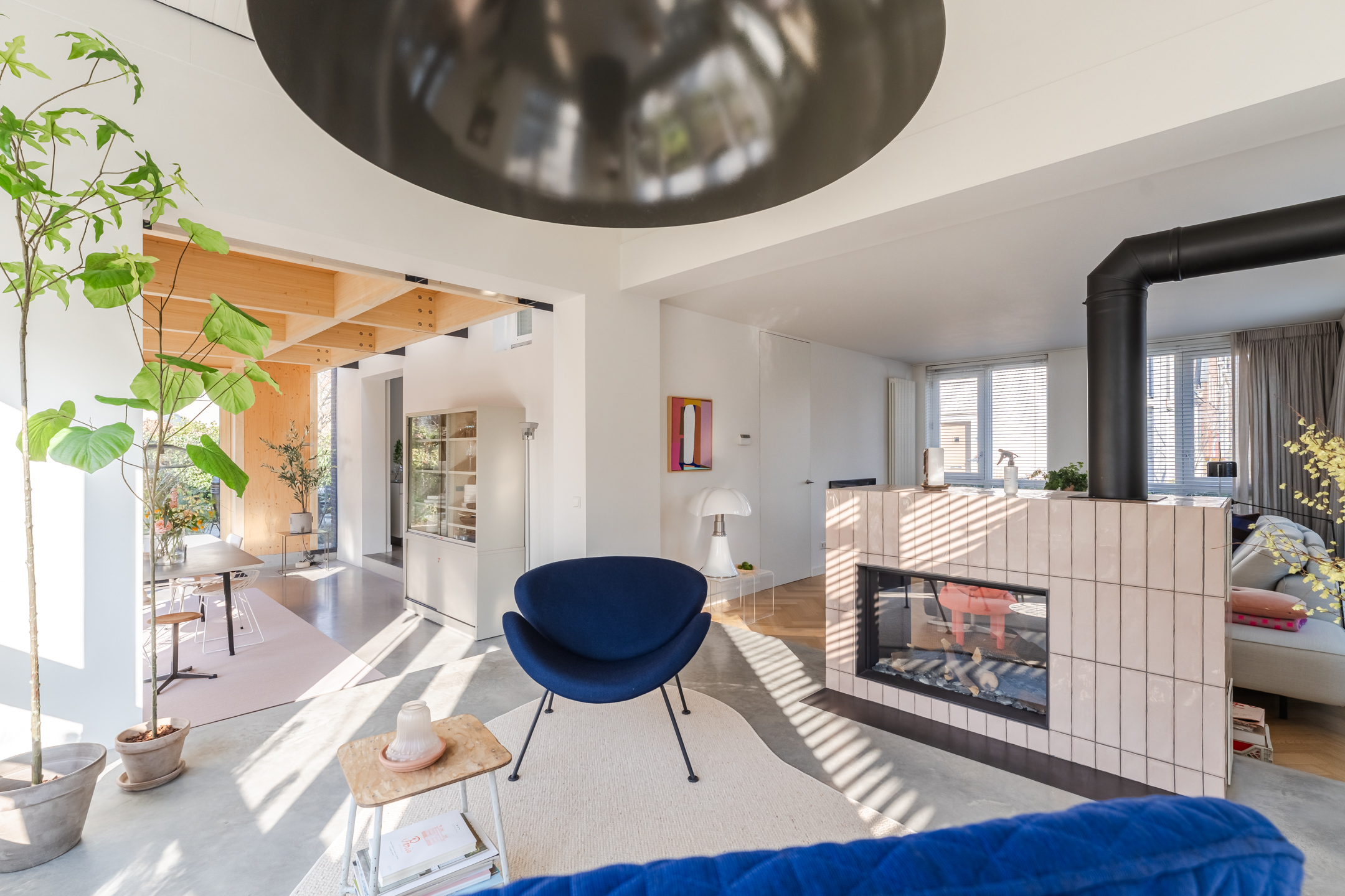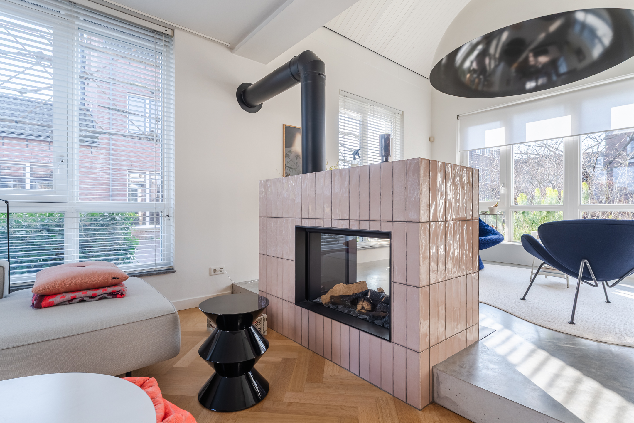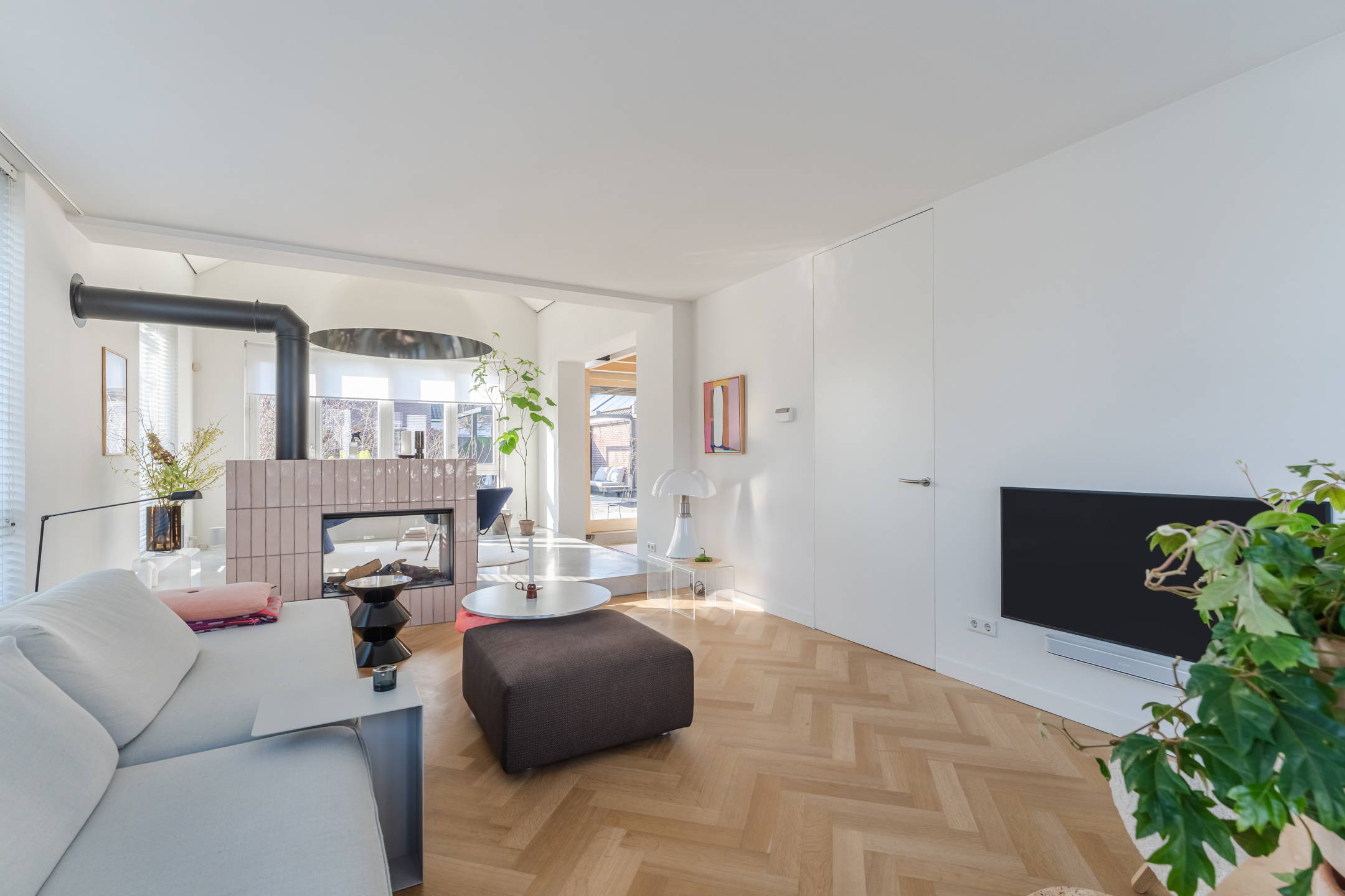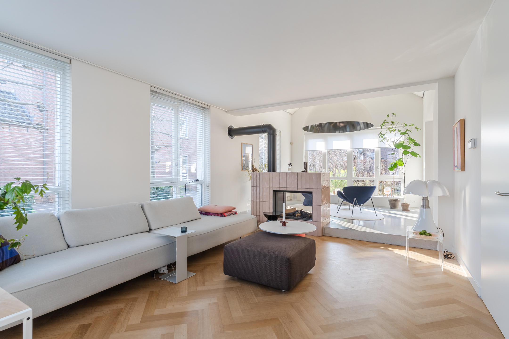 De woonkamer strekt zich uit over de volledige diepte van de woning en bevindt zich aan zowel de voor- als achterzijde. Dankzij de grote raampartijen is het hier heerlijk licht en ontstaat een prettige, open leefruimte. Aan de achterzijde bevindt zich de indrukwekkende, architectonisch ontworpen uitbouw met grote raampartijen, openslaande deuren en een loopdeur naar de tuin. Hierdoor ontstaat een prachtige verbinding tussen binnen en buiten. De eettafel is momenteel in de uitbouw gesitueerd, waardoor een royale leefruimte ontstaat die in directe verbinding staat met de keuken. Aan de achterzijde bevindt zich tevens een sfeervolle gashaard en een airco, wat bijdraagt aan extra comfort in zowel de zomer als de winter