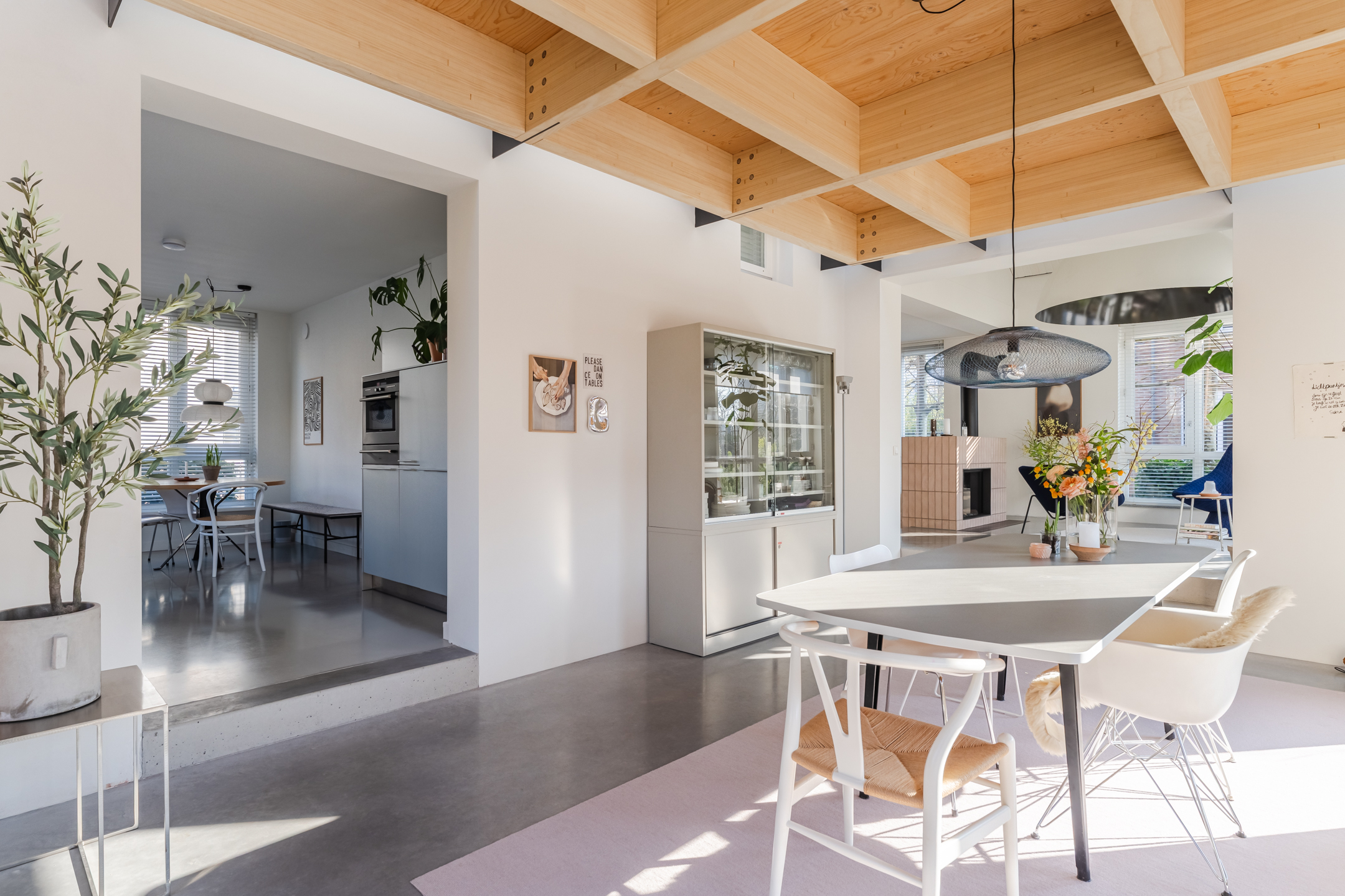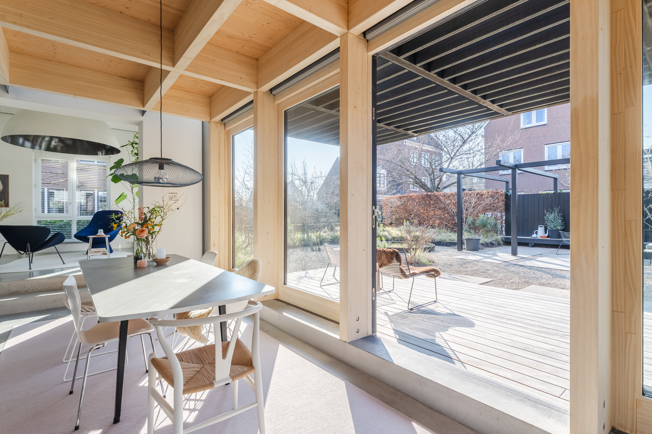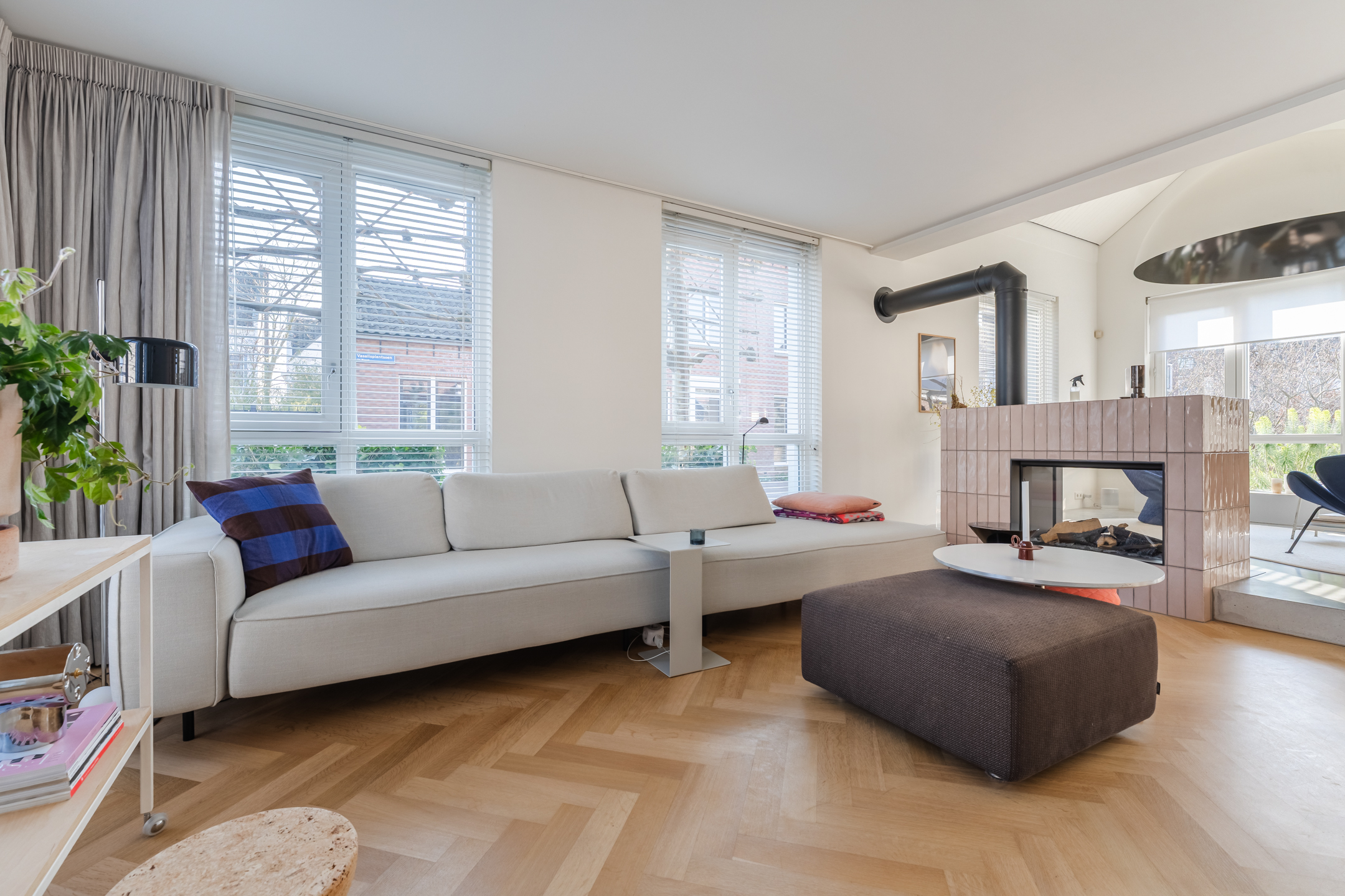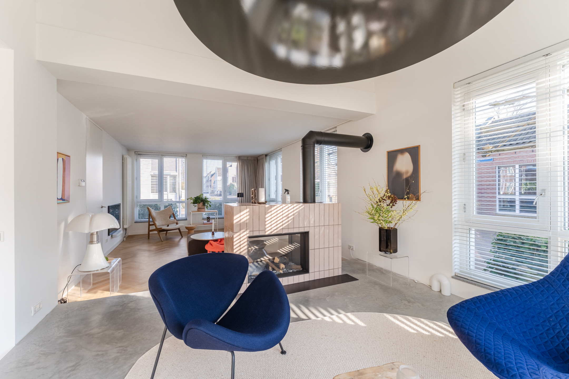 De woonkamer strekt zich uit over de volledige diepte van de woning en bevindt zich aan zowel de voor- als achterzijde. Dankzij de grote raampartijen is het hier heerlijk licht en ontstaat een prettige, open leefruimte. Aan de achterzijde bevindt zich de indrukwekkende, architectonisch ontworpen uitbouw met grote raampartijen, openslaande deuren en een loopdeur naar de tuin. Hierdoor ontstaat een prachtige verbinding tussen binnen en buiten. De eettafel is momenteel in de uitbouw gesitueerd, waardoor een royale leefruimte ontstaat die in directe verbinding staat met de keuken. Aan de achterzijde bevindt zich tevens een sfeervolle gashaard en een airco, wat bijdraagt aan extra comfort in zowel de zomer als de winter
