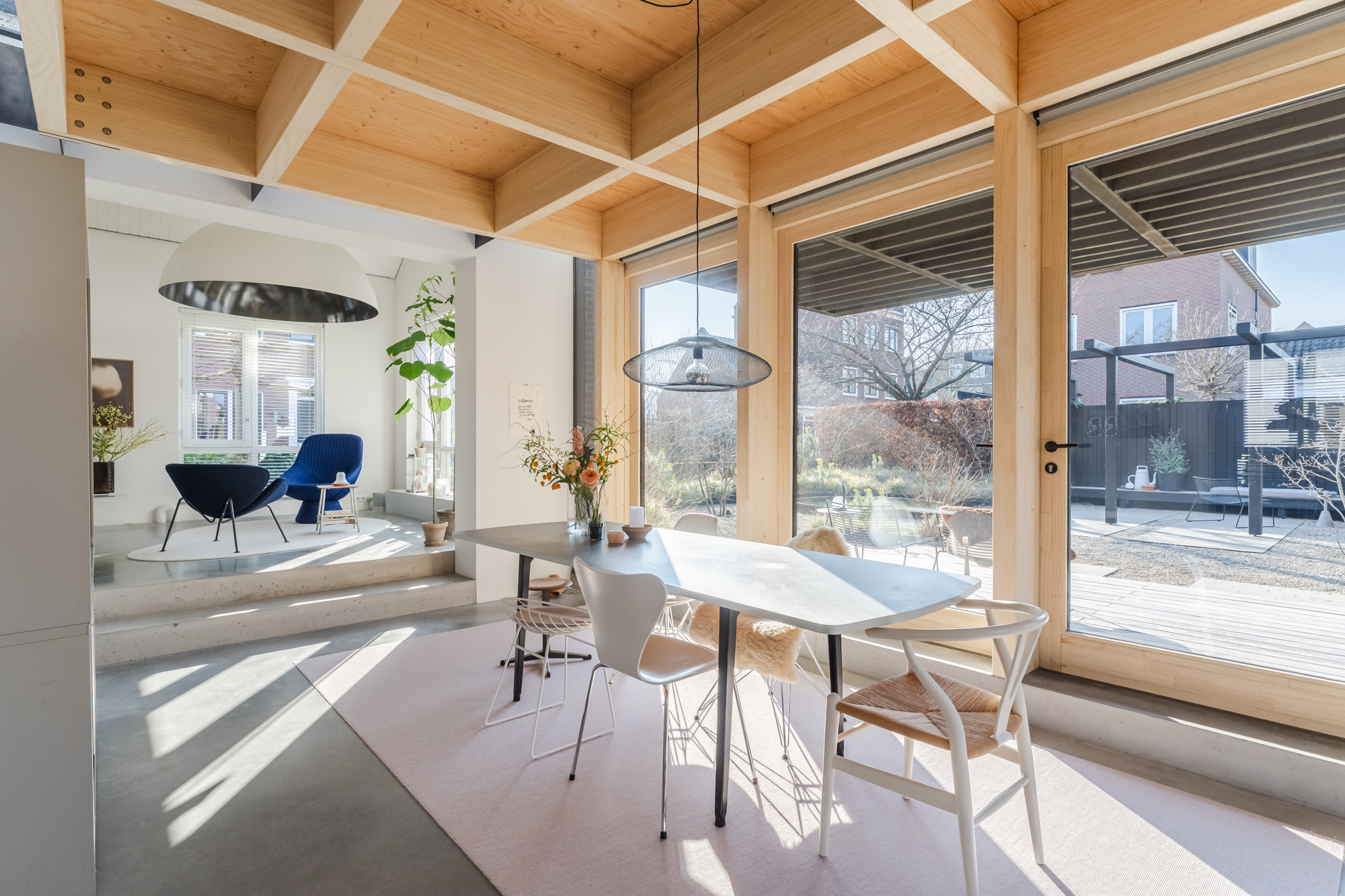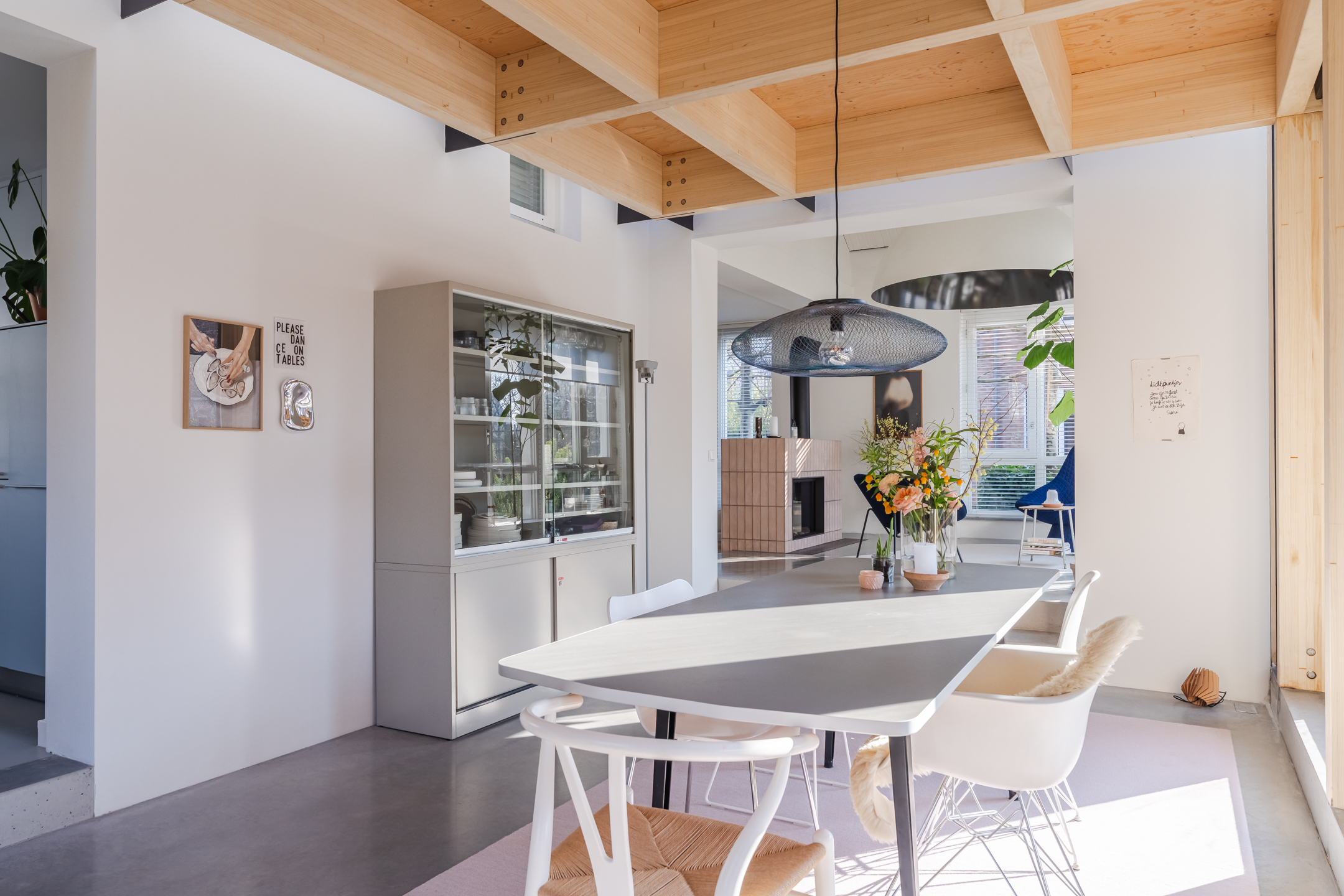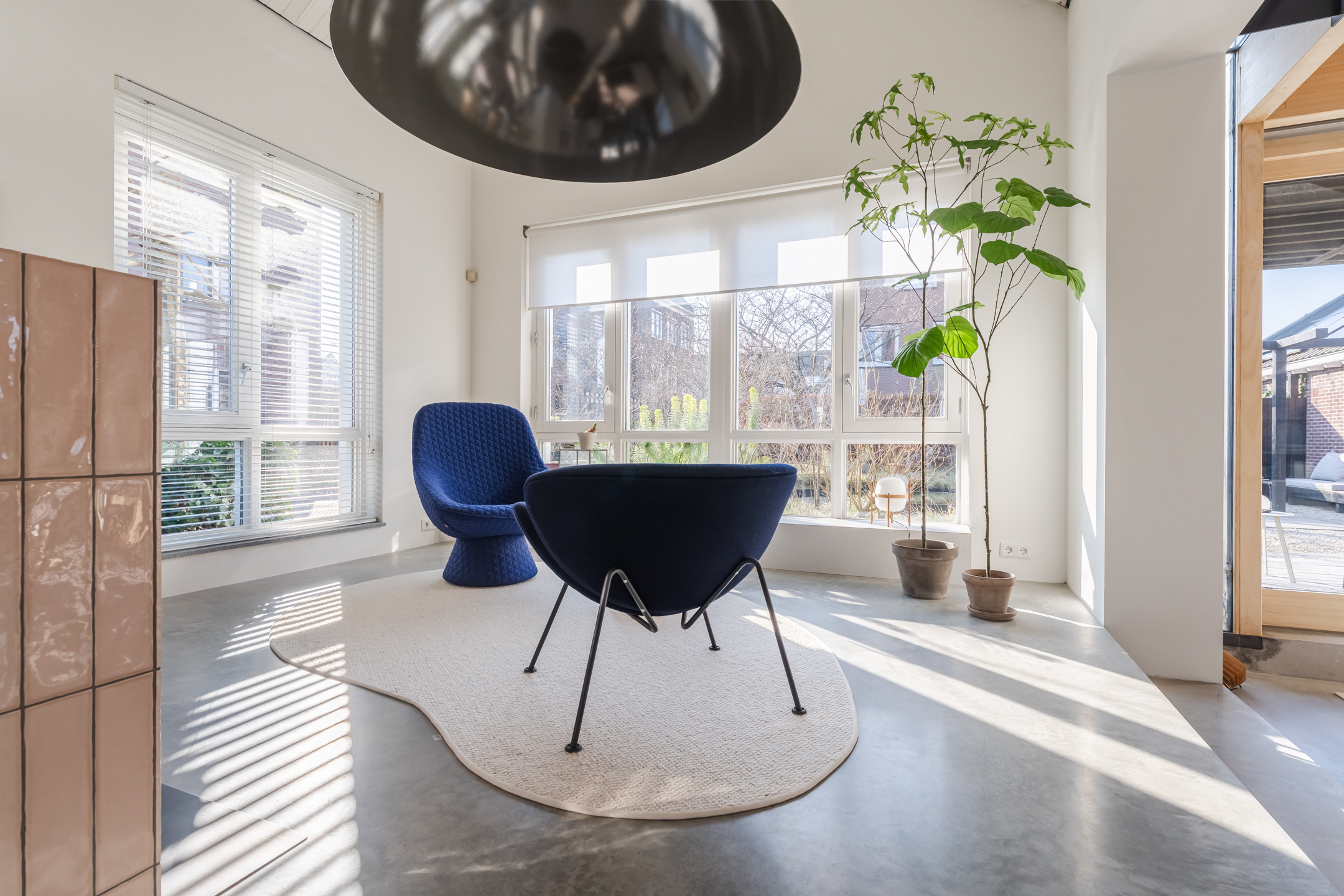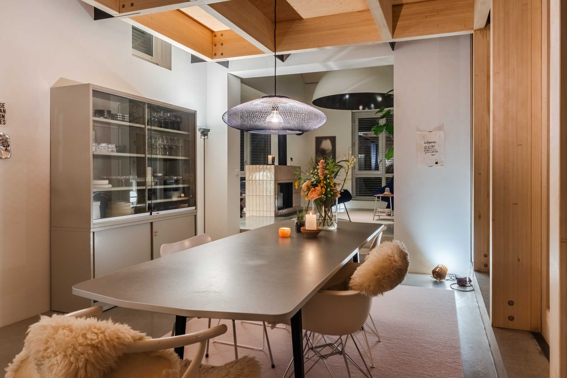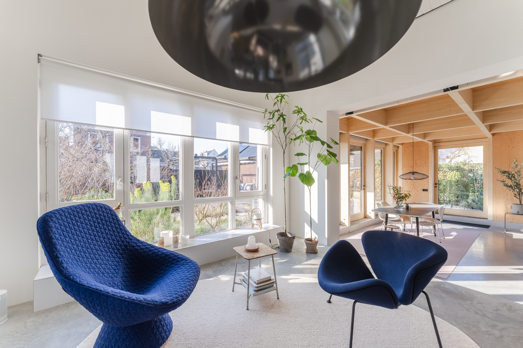 De woonkamer strekt zich uit over de volledige diepte van de woning en bevindt zich aan zowel de voor- als achterzijde. Dankzij de grote raampartijen is het hier heerlijk licht en ontstaat een prettige, open leefruimte. Aan de achterzijde bevindt zich de indrukwekkende, architectonisch ontworpen uitbouw met grote raampartijen, openslaande deuren en een loopdeur naar de tuin. Hierdoor ontstaat een prachtige verbinding tussen binnen en buiten. De eettafel is momenteel in de uitbouw gesitueerd, waardoor een royale leefruimte ontstaat die in directe verbinding staat met de keuken. Aan de achterzijde bevindt zich tevens een sfeervolle gashaard en een airco, wat bijdraagt aan extra comfort in zowel de zomer als de winter