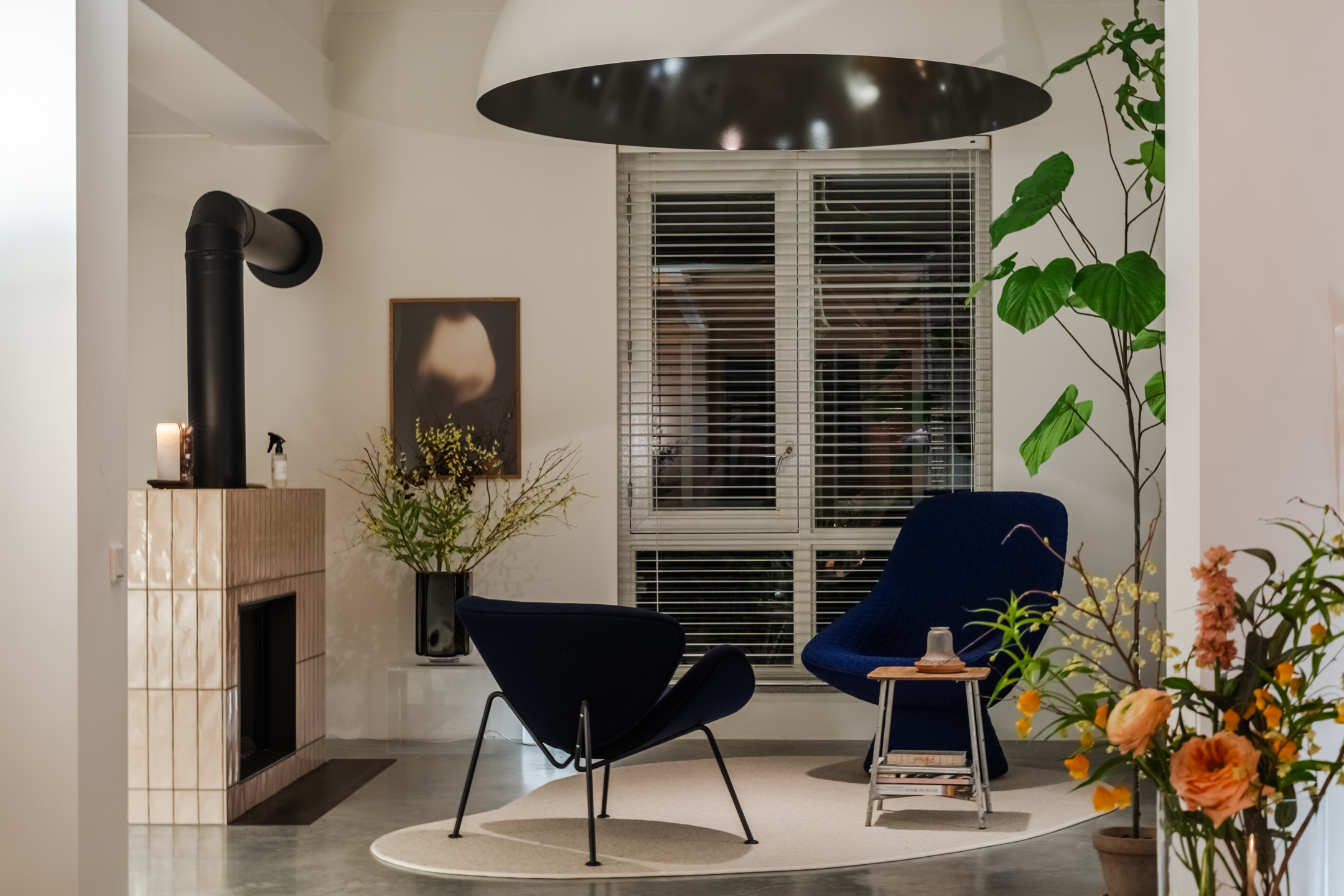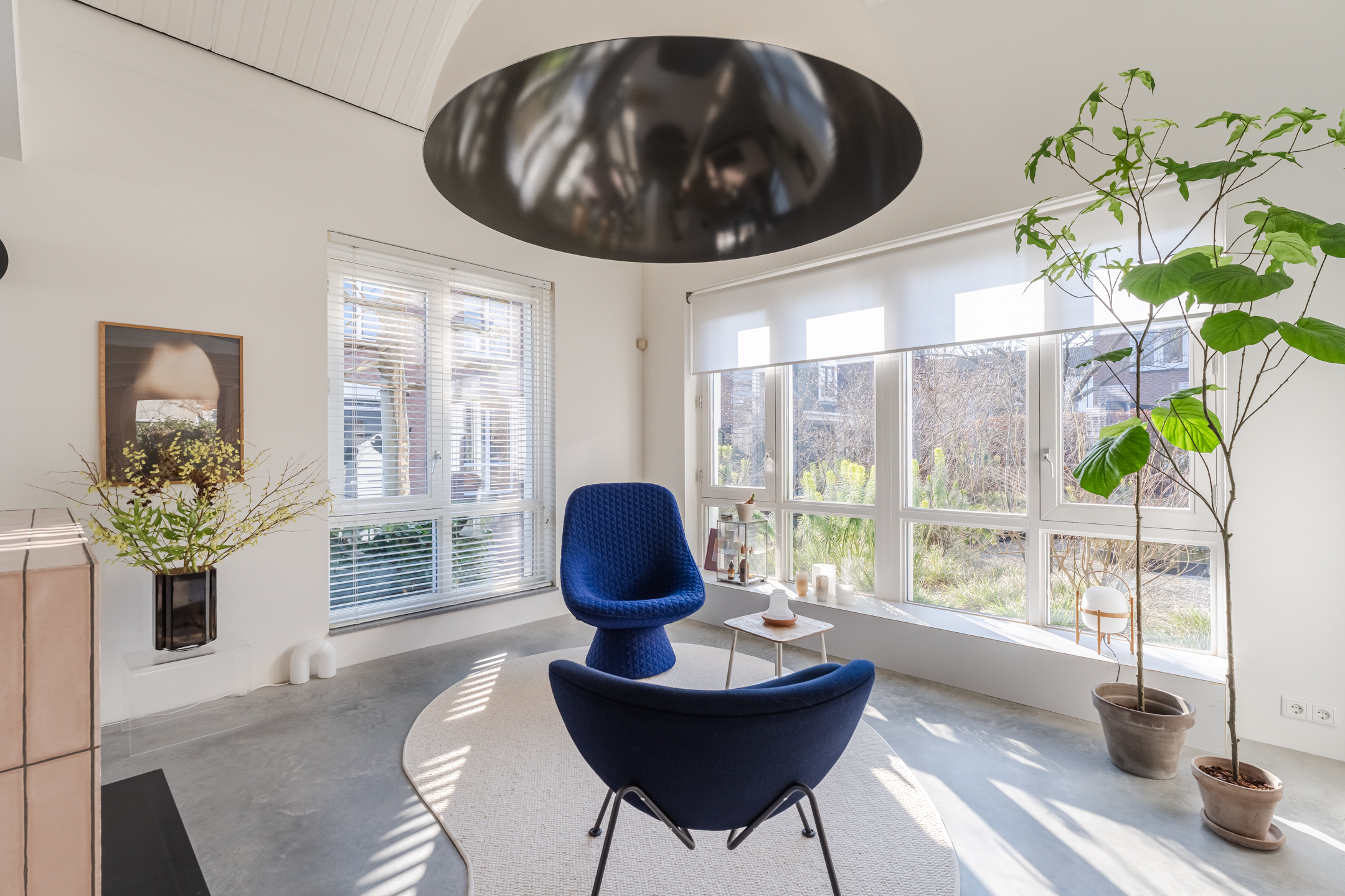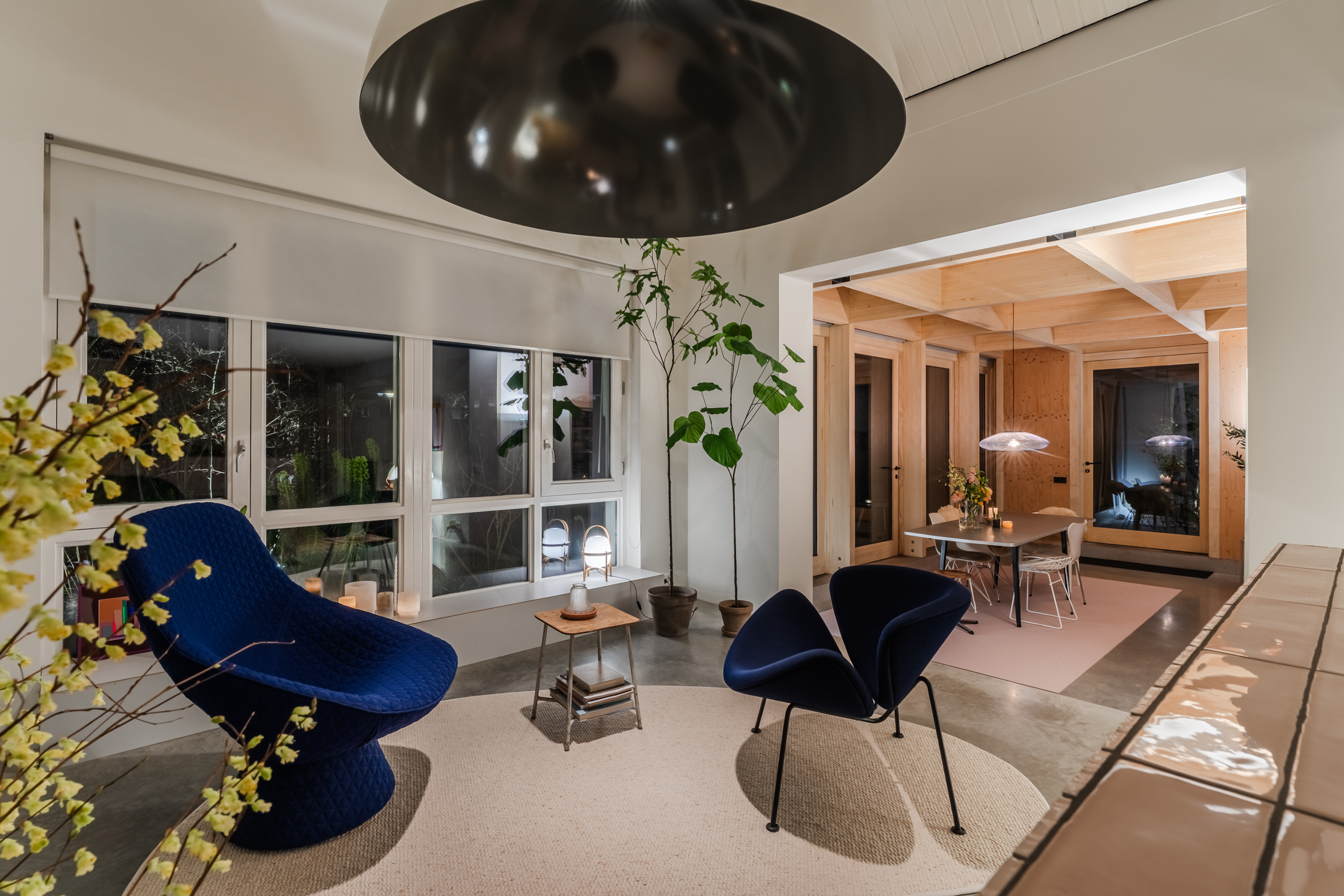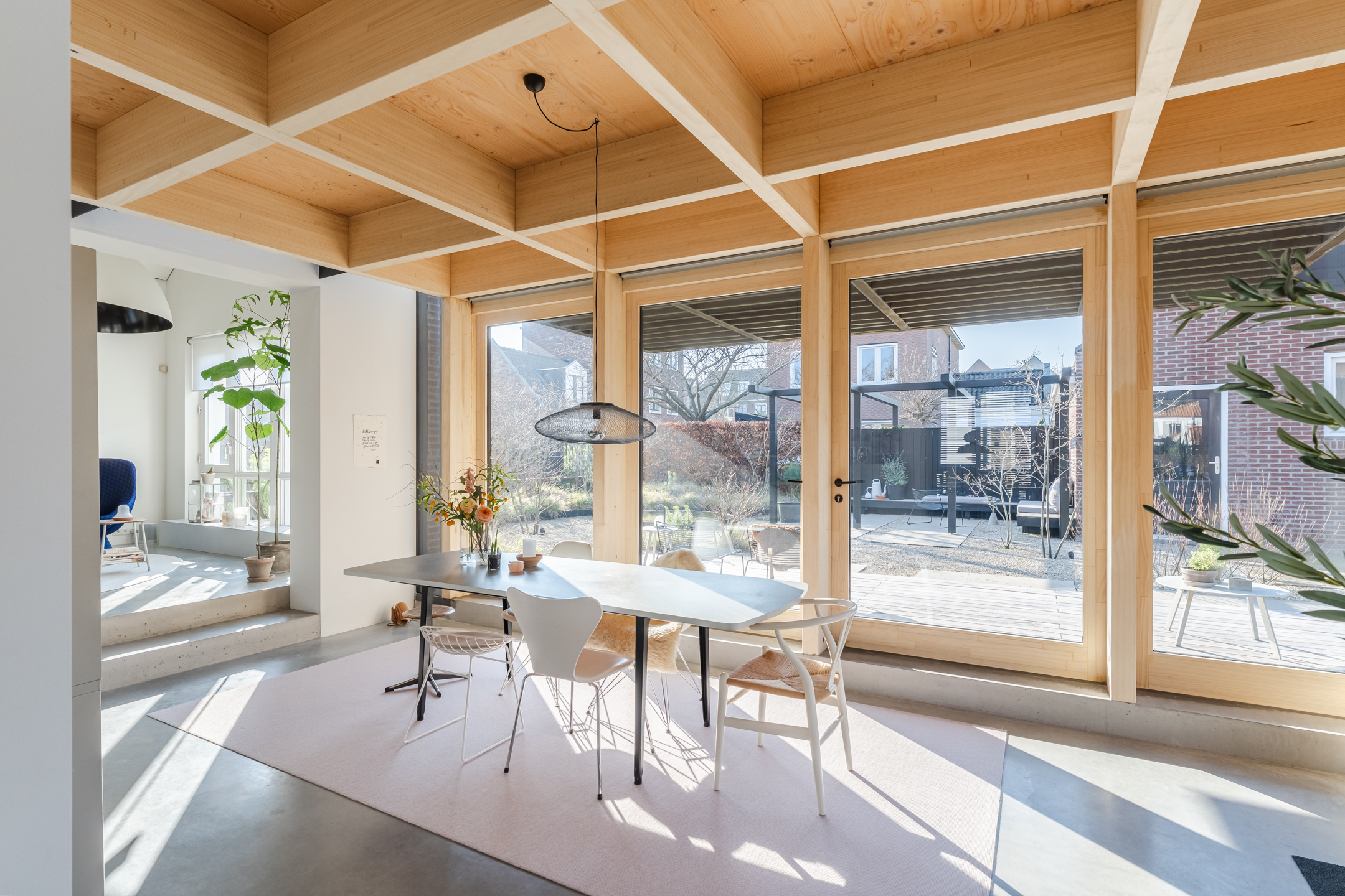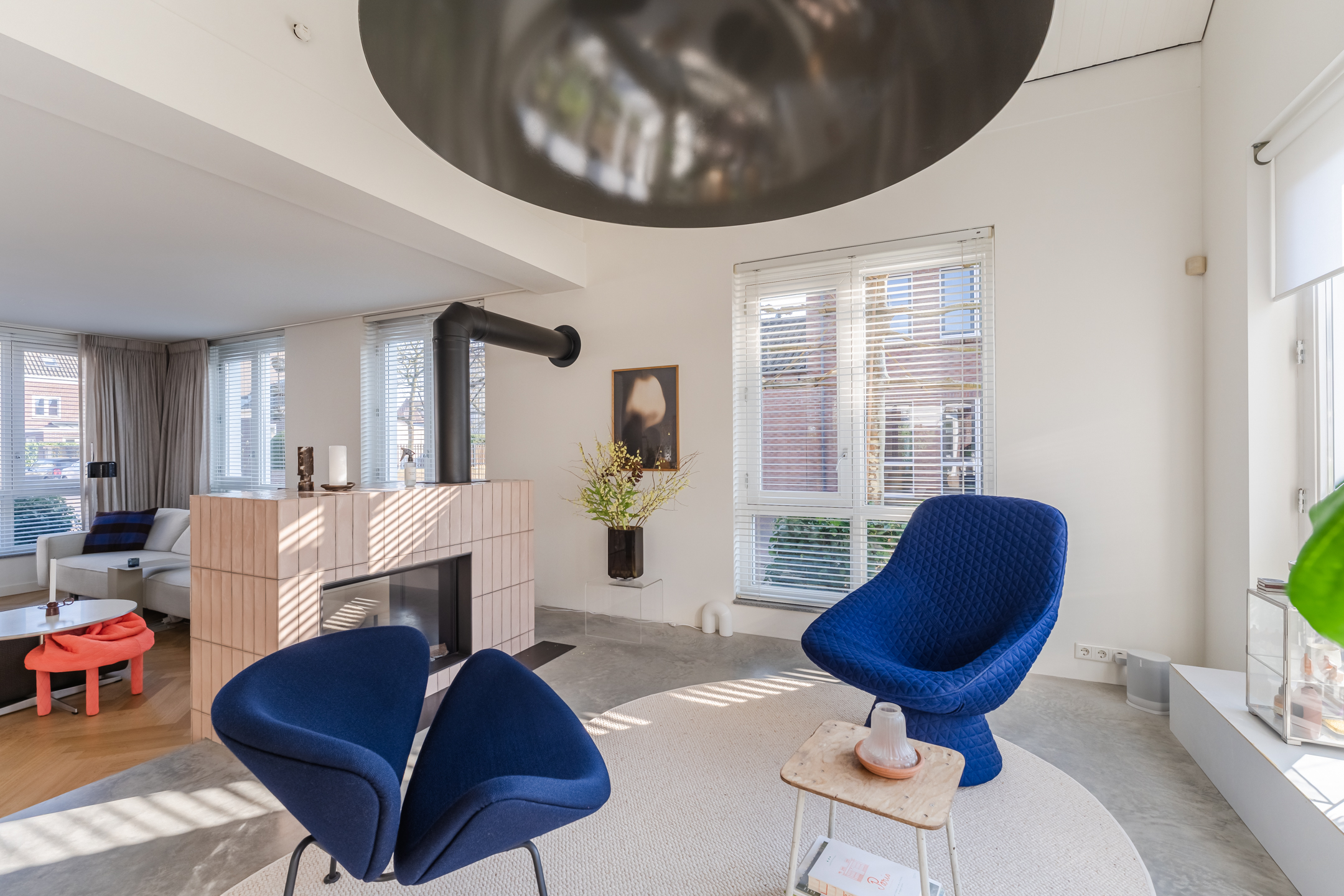 De woonkamer strekt zich uit over de volledige diepte van de woning en bevindt zich aan zowel de voor- als achterzijde. Dankzij de grote raampartijen is het hier heerlijk licht en ontstaat een prettige, open leefruimte. Aan de achterzijde bevindt zich de indrukwekkende, architectonisch ontworpen uitbouw met grote raampartijen, openslaande deuren en een loopdeur naar de tuin. Hierdoor ontstaat een prachtige verbinding tussen binnen en buiten. De eettafel is momenteel in de uitbouw gesitueerd, waardoor een royale leefruimte ontstaat die in directe verbinding staat met de keuken. Aan de achterzijde bevindt zich tevens een sfeervolle gashaard en een airco, wat bijdraagt aan extra comfort in zowel de zomer als de winter