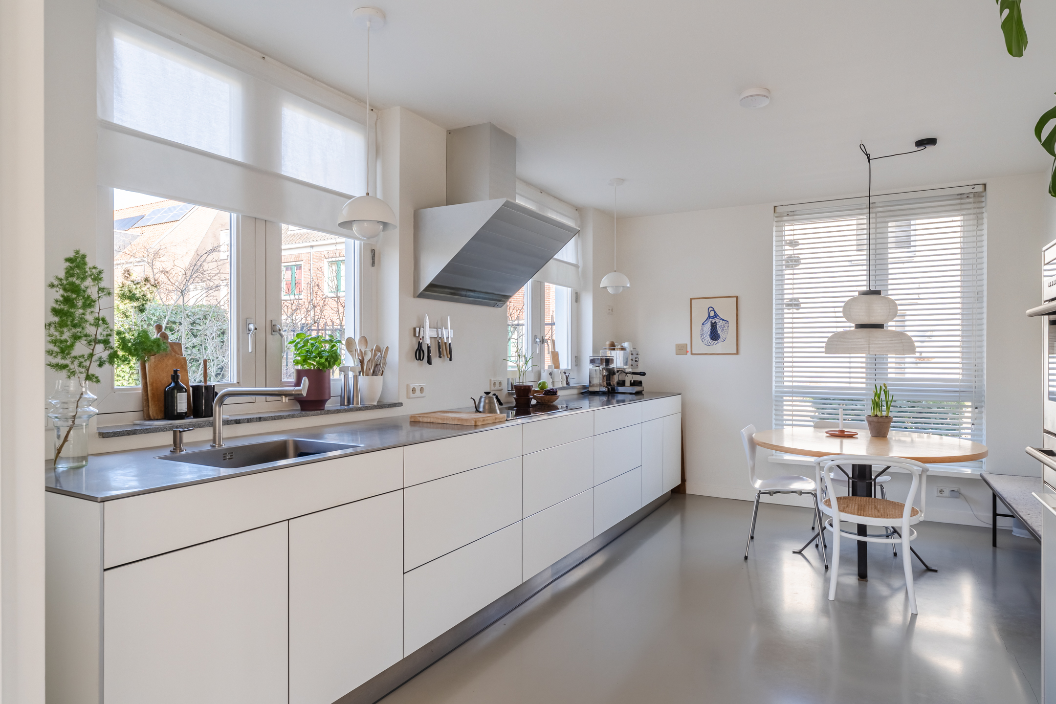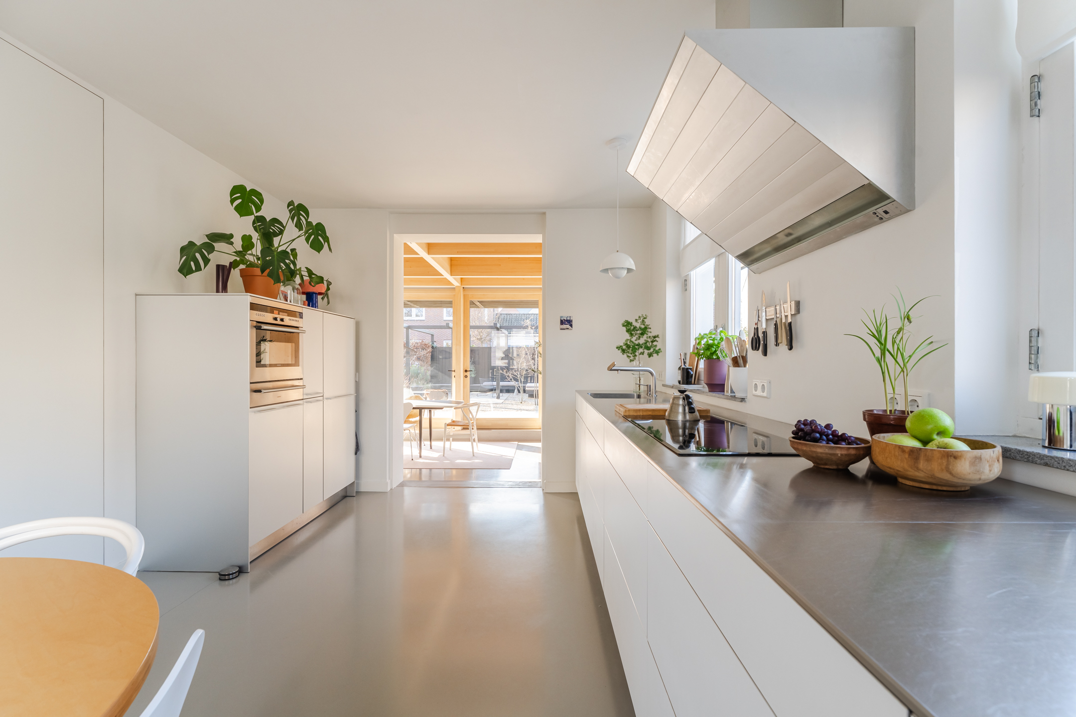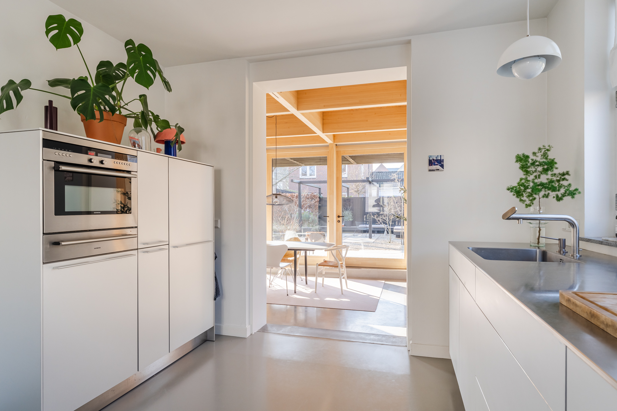 De halfopen keuken van het topmerk Bulthaup, is geplaatst in een praktische wandopstelling met een apparatenwandkast en uitgevoerd in een moderne kleurstelling met witte fronten en lichtgrijze fronten voor de apparatenwandkast. Het werkblad is uitgevoerd in RVS, wat zorgt voor een strakke en eigentijdse uitstraling. De keuken beschikt over diverse inbouwapparatuur (merk: Miele, Gaggenau en Siemens), waaronder een inductiekookplaat, combi-oven/magnetron, warmtelade, koelkast, vaatwasser en afzuigkap. Dankzij de meerdere ramen geniet je hier van een prettig uitzicht over de zijtuin en de straat en is in de keuken is zelfs nog ruimte voor een extra eetplek.
