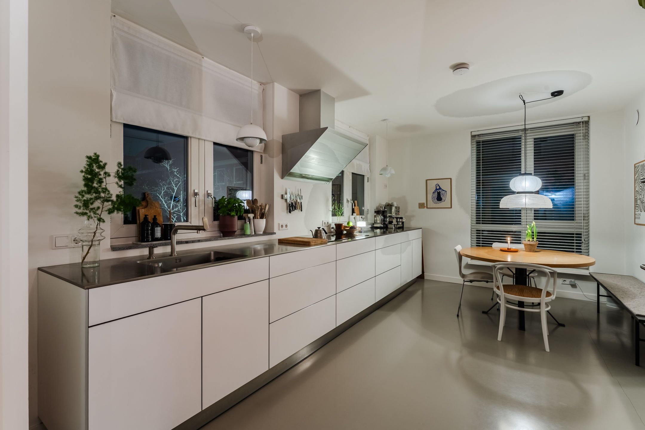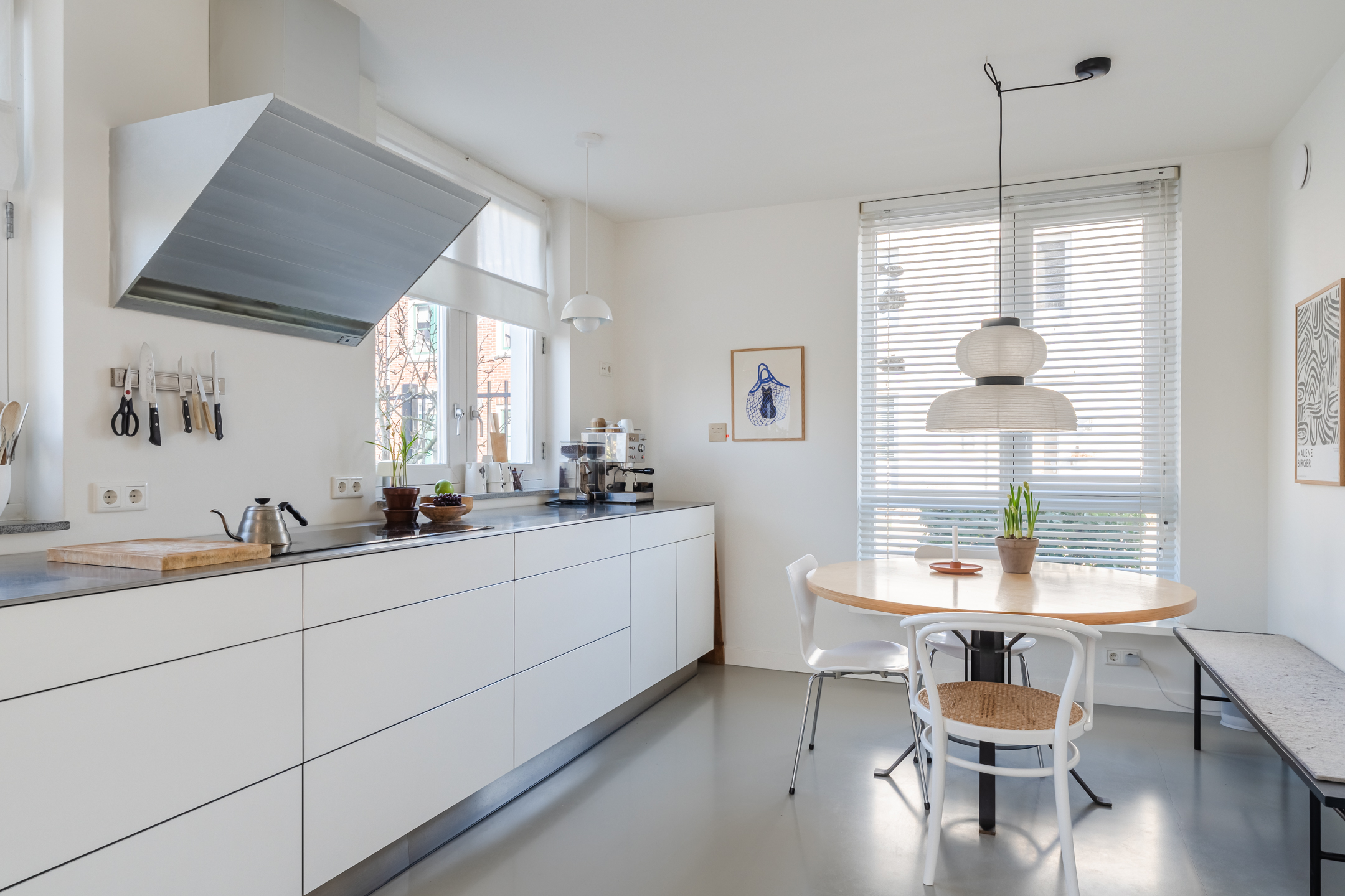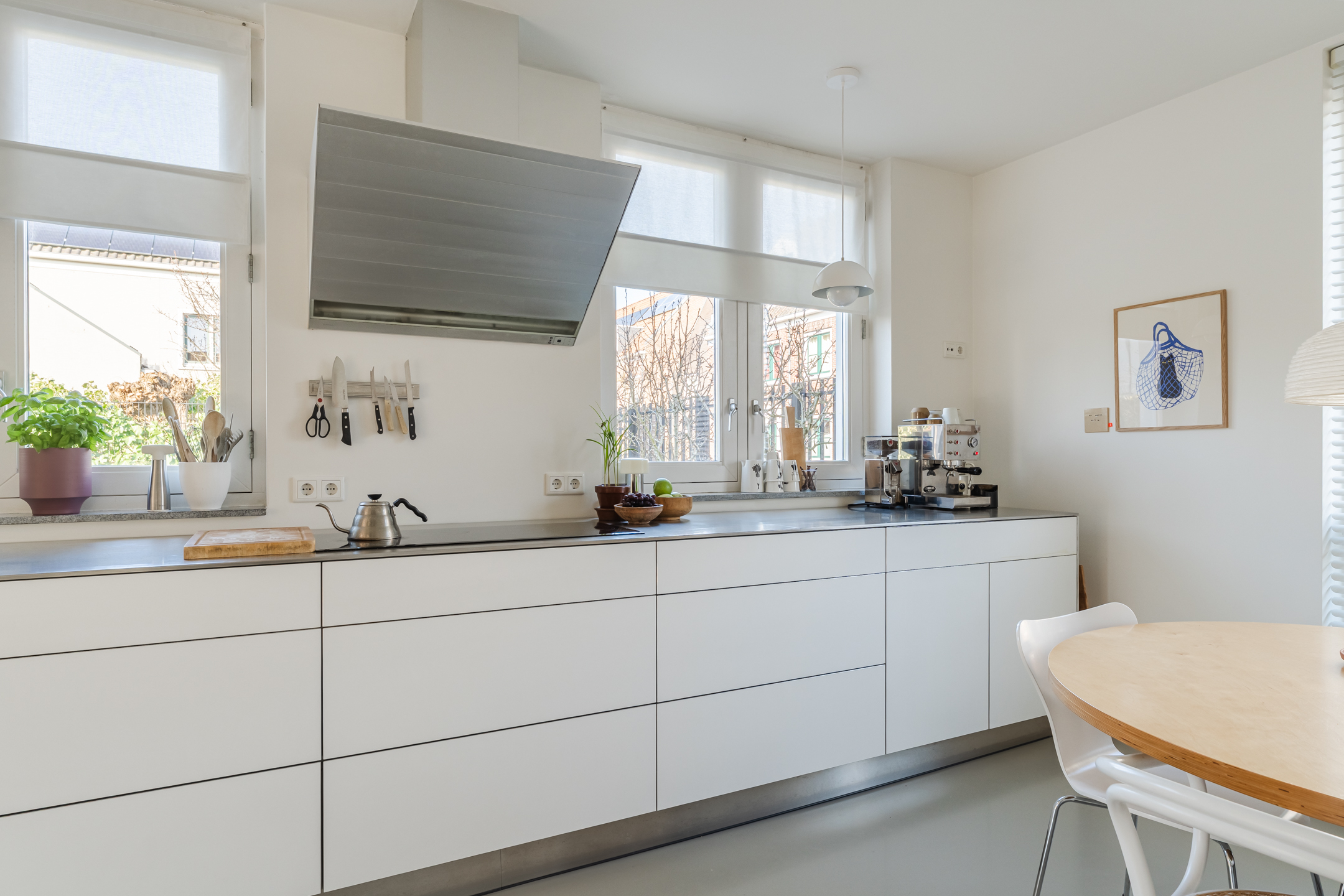 De halfopen keuken van het topmerk Bulthaup, is geplaatst in een praktische wandopstelling met een apparatenwandkast en uitgevoerd in een moderne kleurstelling met witte fronten en lichtgrijze fronten voor de apparatenwandkast. Het werkblad is uitgevoerd in RVS, wat zorgt voor een strakke en eigentijdse uitstraling. De keuken beschikt over diverse inbouwapparatuur (merk: Miele, Gaggenau en Siemens), waaronder een inductiekookplaat, combi-oven/magnetron, warmtelade, koelkast, vaatwasser en afzuigkap. Dankzij de meerdere ramen geniet je hier van een prettig uitzicht over de zijtuin en de straat en is in de keuken is zelfs nog ruimte voor een extra eetplek.