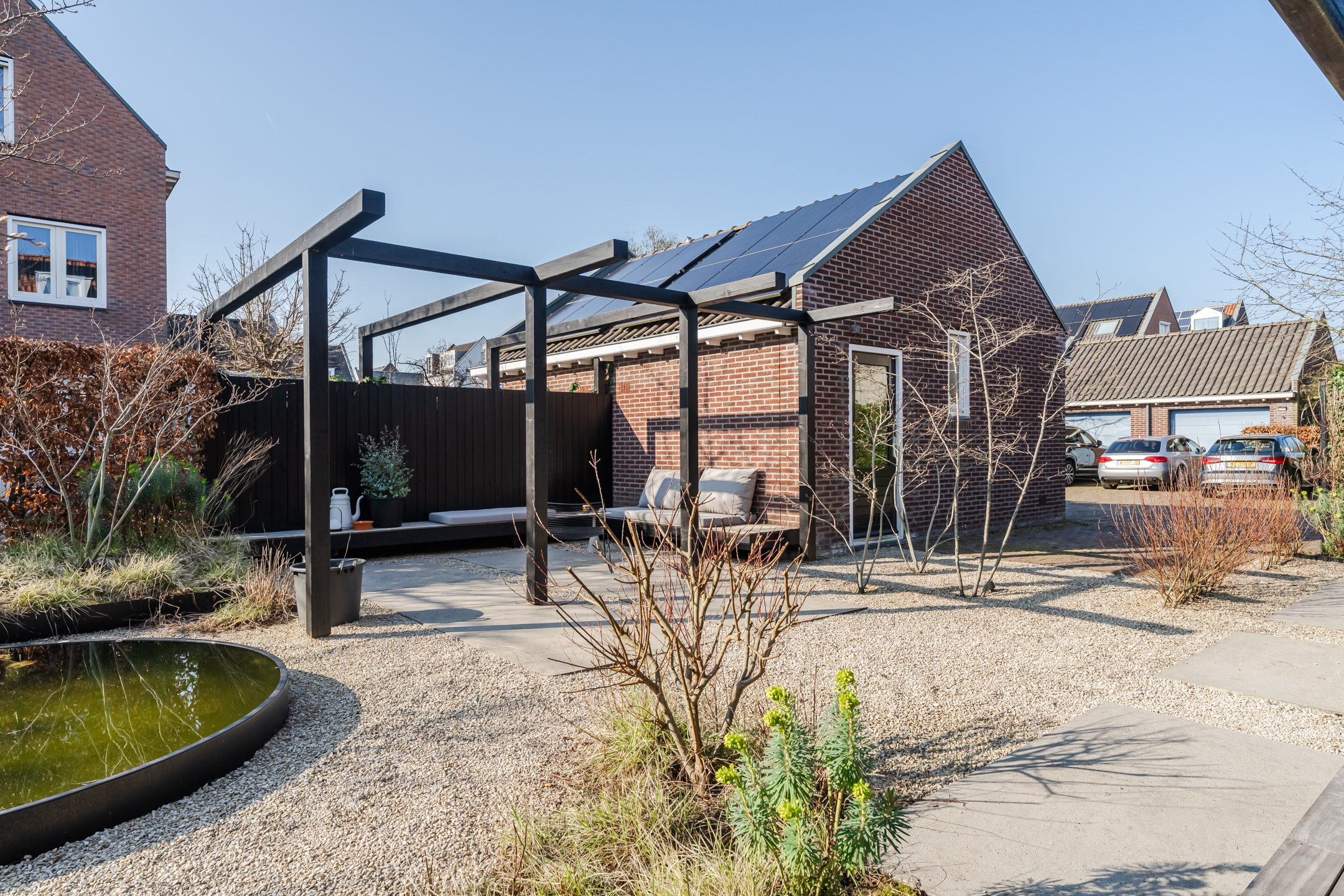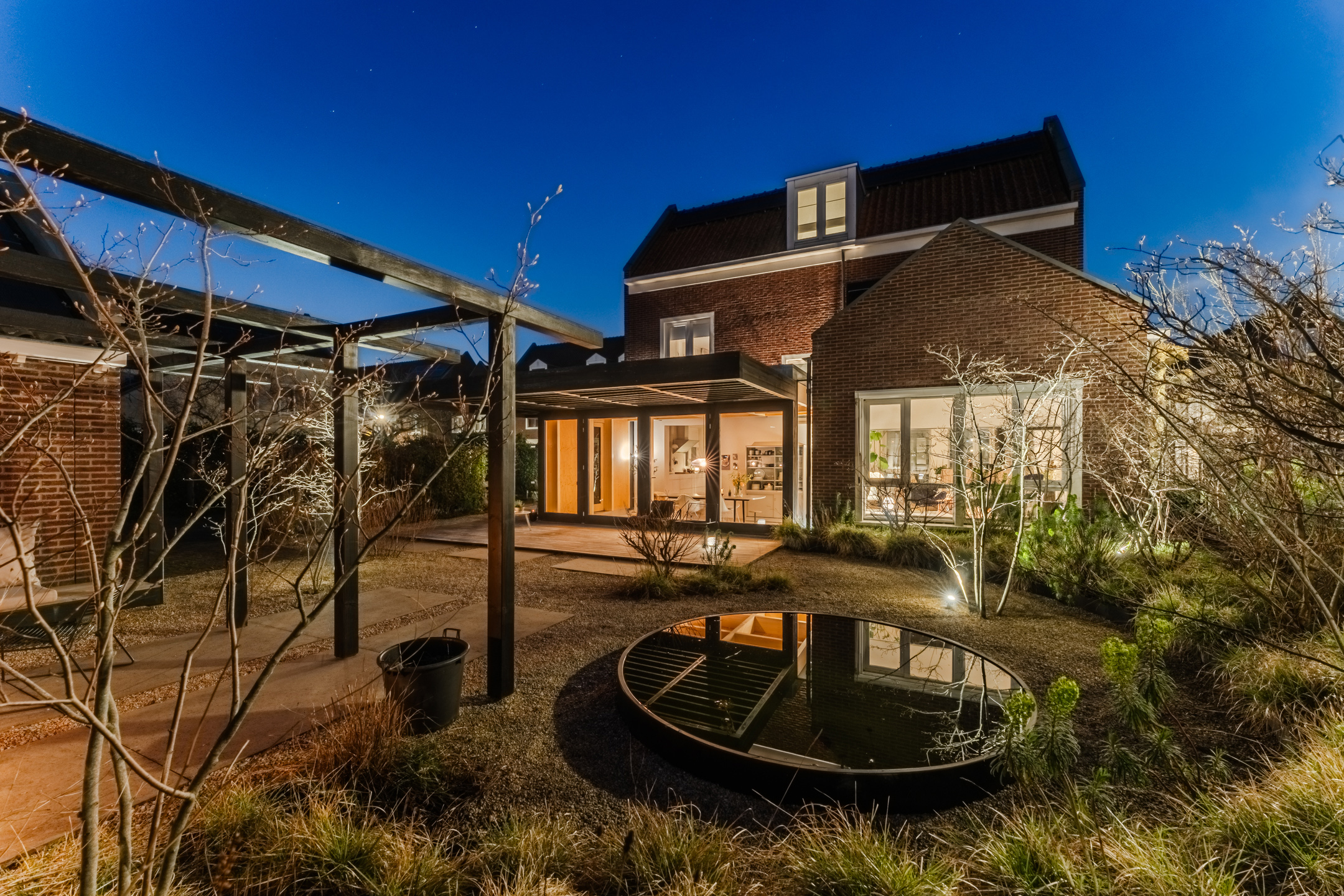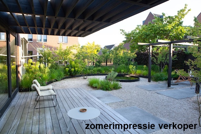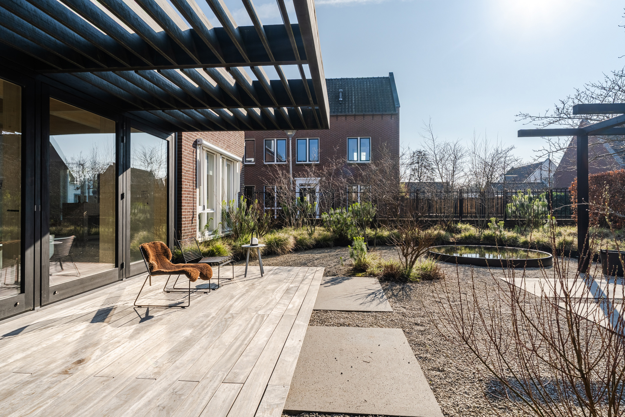 Via de openslaande deuren en een loopdeur vanuit de uitbouw is de tuin eenvoudig bereikbaar. De onder architectuur ontworpen achtertuin is strak en verzorgd aangelegd (gerealiseerd in najaar 2020) en bevindt zich op het zuiden en het westen. De tuin beschikt over grote terrastegels, groene borders en een sfeervolle ronde vijver.