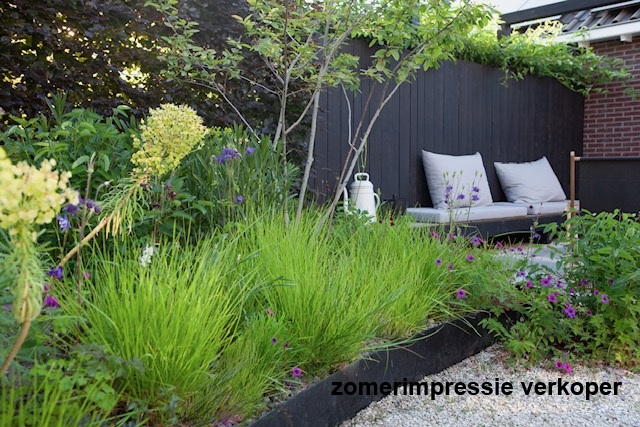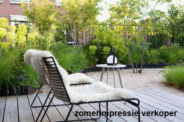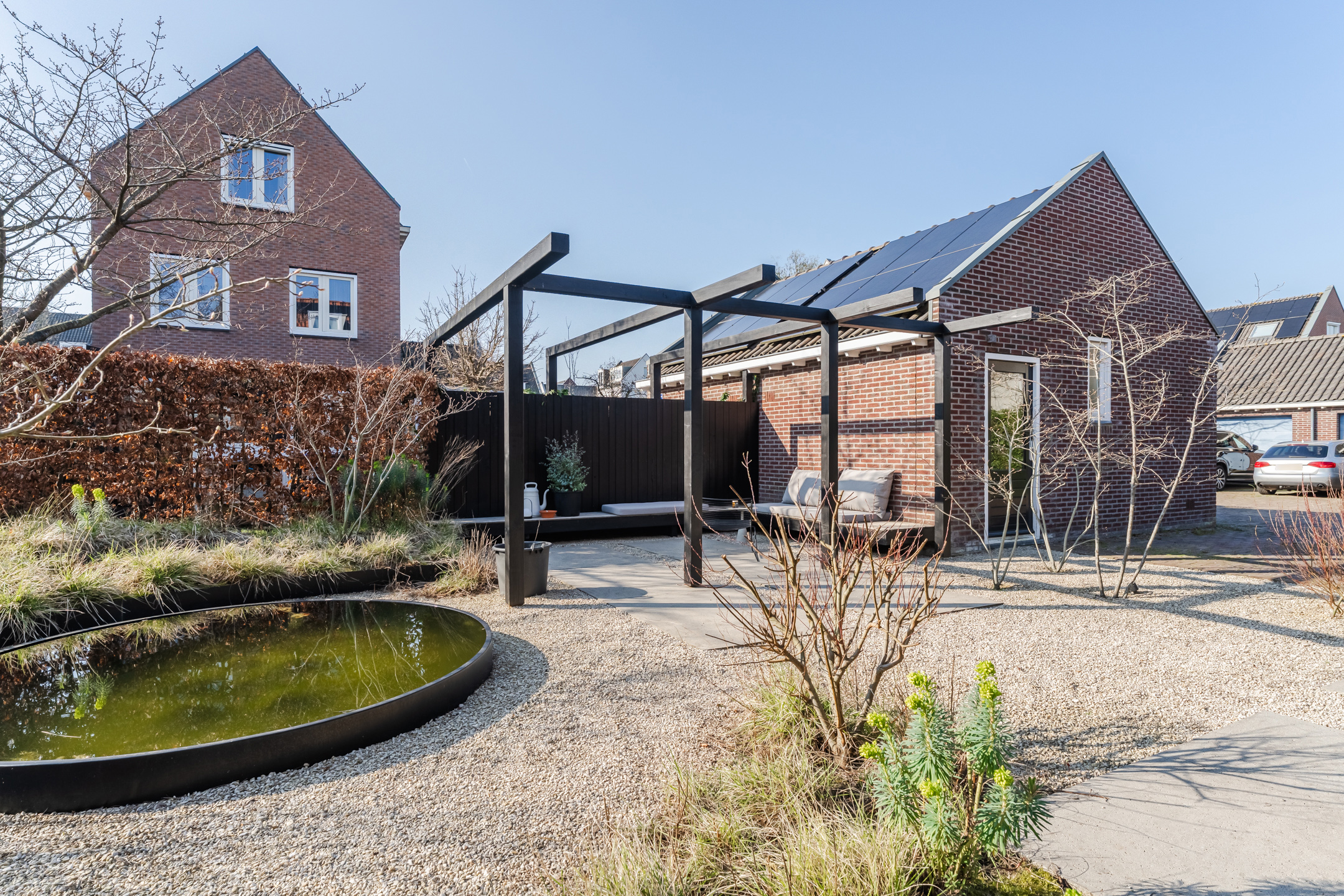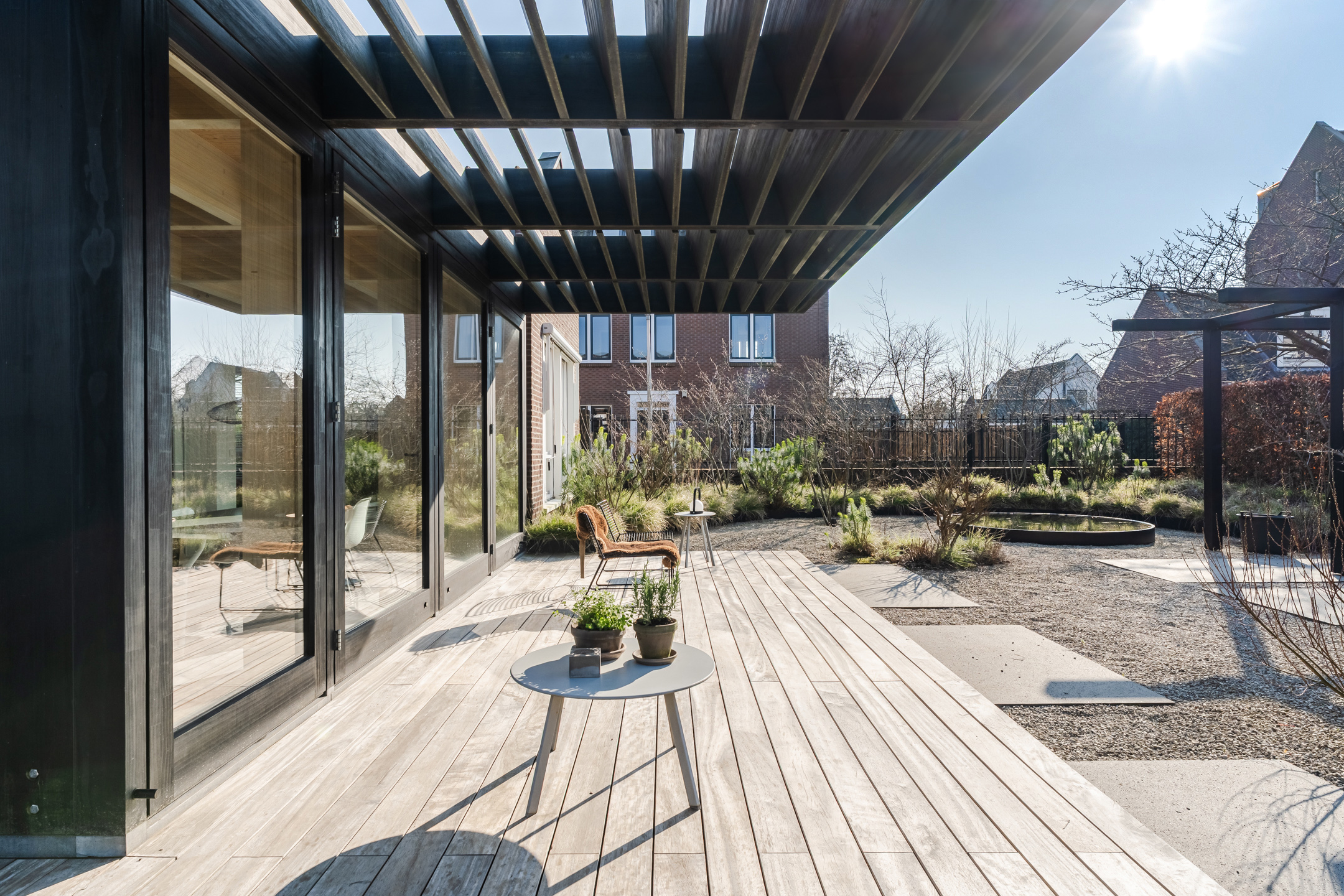 Via de openslaande deuren en een loopdeur vanuit de uitbouw is de tuin eenvoudig bereikbaar. De onder architectuur ontworpen achtertuin is strak en verzorgd aangelegd (gerealiseerd in najaar 2020) en bevindt zich op het zuiden en het westen. De tuin beschikt over grote terrastegels, groene borders en een sfeervolle ronde vijver.