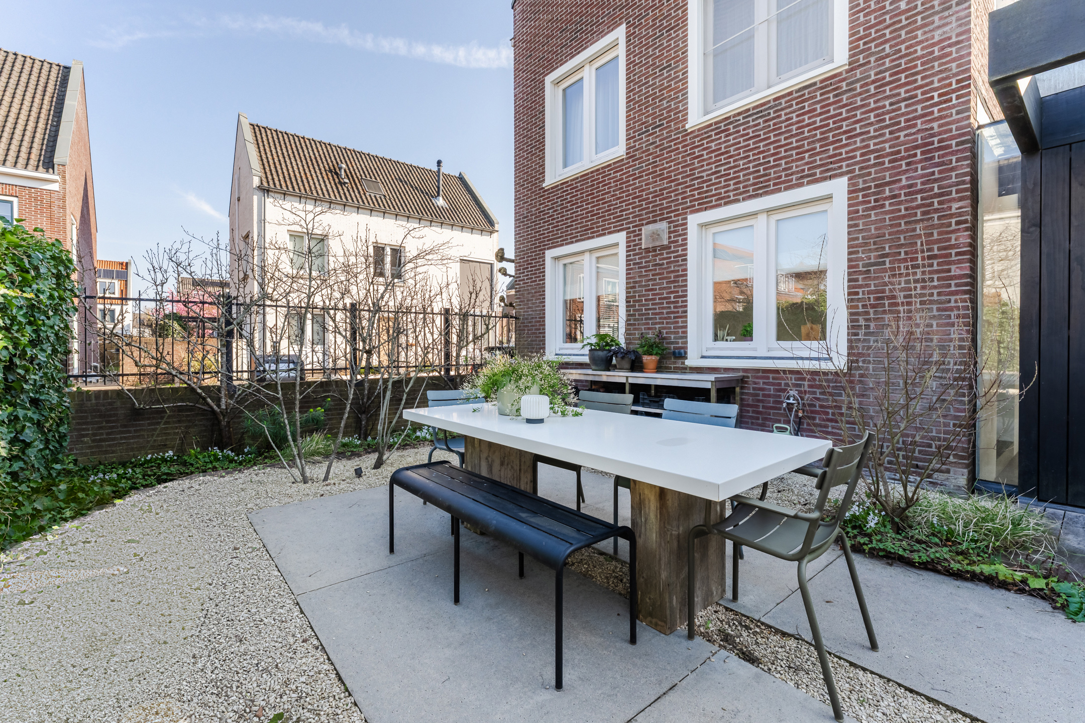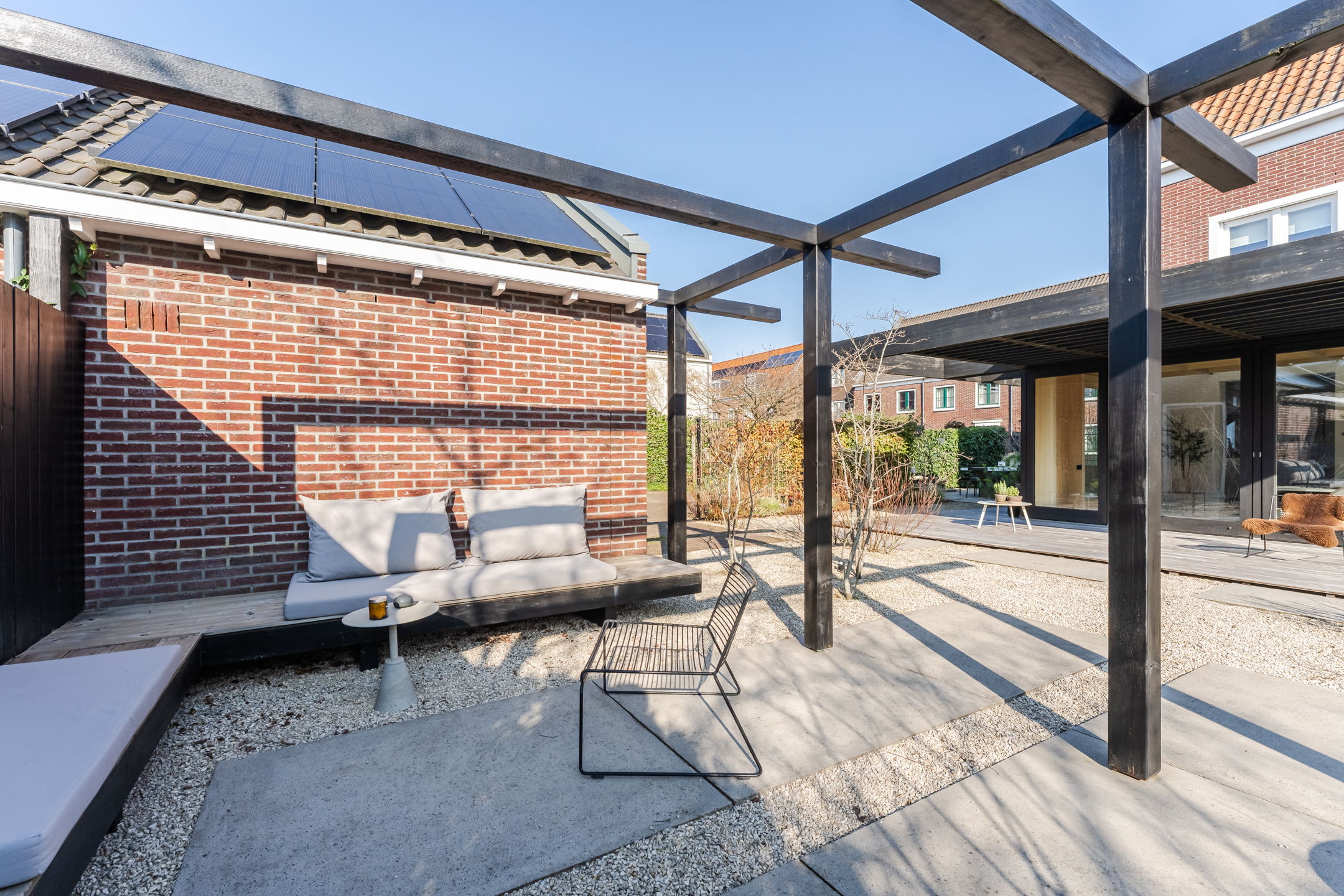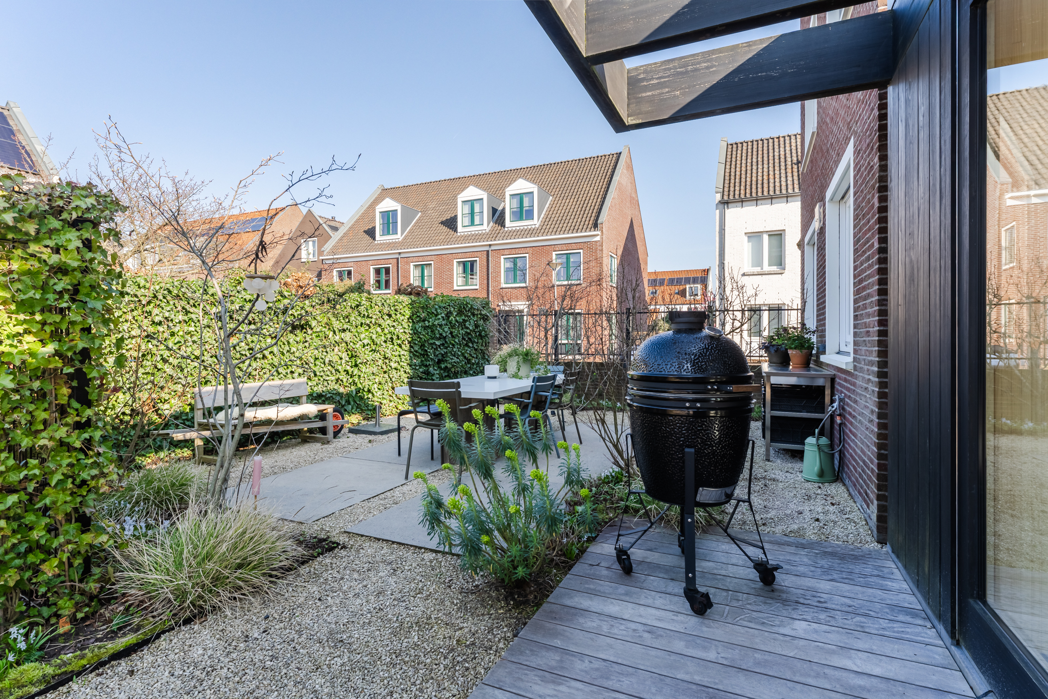 Dankzij de doordachte indeling zijn er meerdere fijne plekken gecreëerd om te genieten van het buitenleven, waaronder een zonnige zithoek met een comfortabele hoekbank. Daarnaast beschikt de woning over een zijtuin die zich uitstekend leent voor een buitenkeuken om op warme zomerdagen samen te komen met vrienden en familie voor een gezellige barbecue.