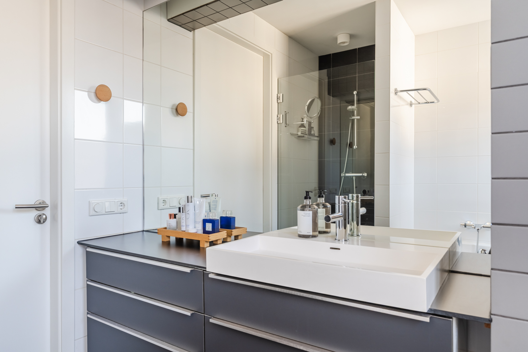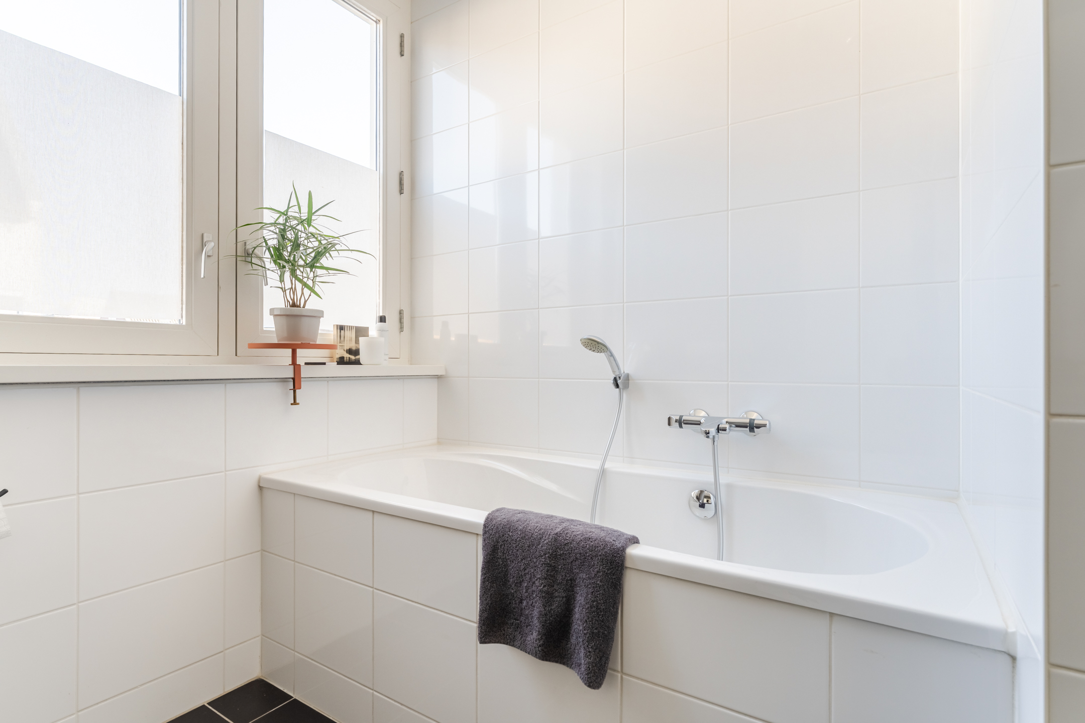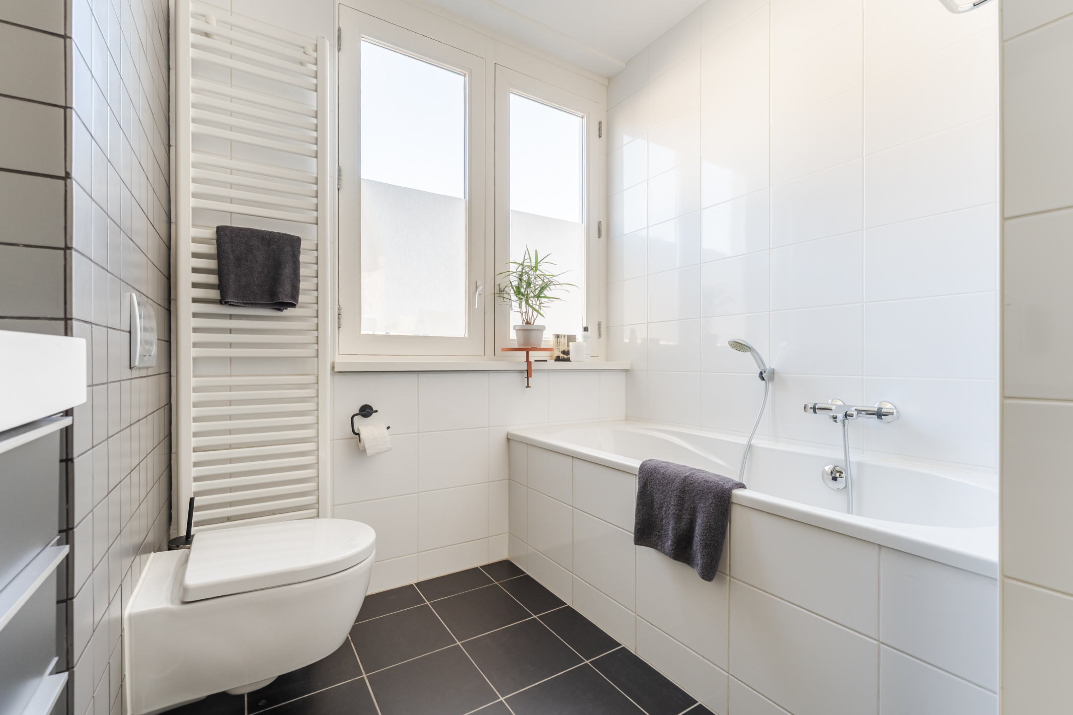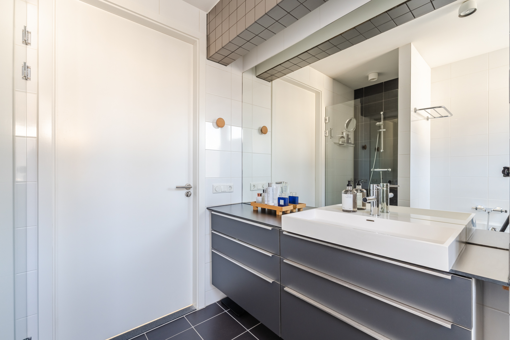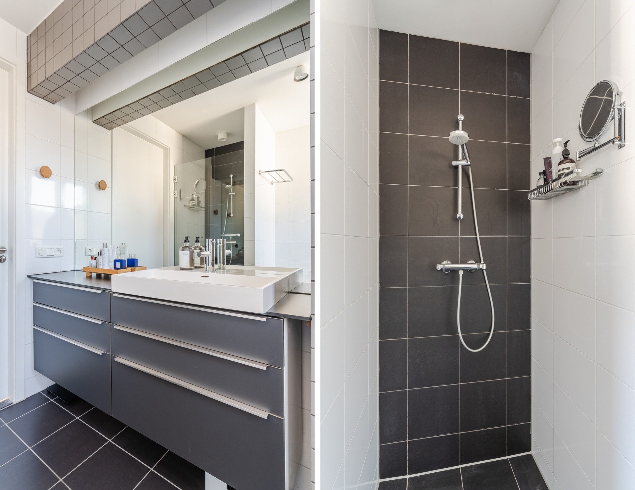 De badkamer bevindt zich aan de voorzijde van de woning en is uitgevoerd met zwarte vloertegels en witte wandtegels, waarbij de achterwand van de inloopdouche eveneens is uitgevoerd in zwarte tegels. De badkamer beschikt over een inloopdouche, een wastafel met meubel, een tweede toilet, mechanische ventilatie en een raam voor natuurlijke ventilatie en daglicht. Het brede badkamermeubel biedt daarnaast veel opbergruimte.