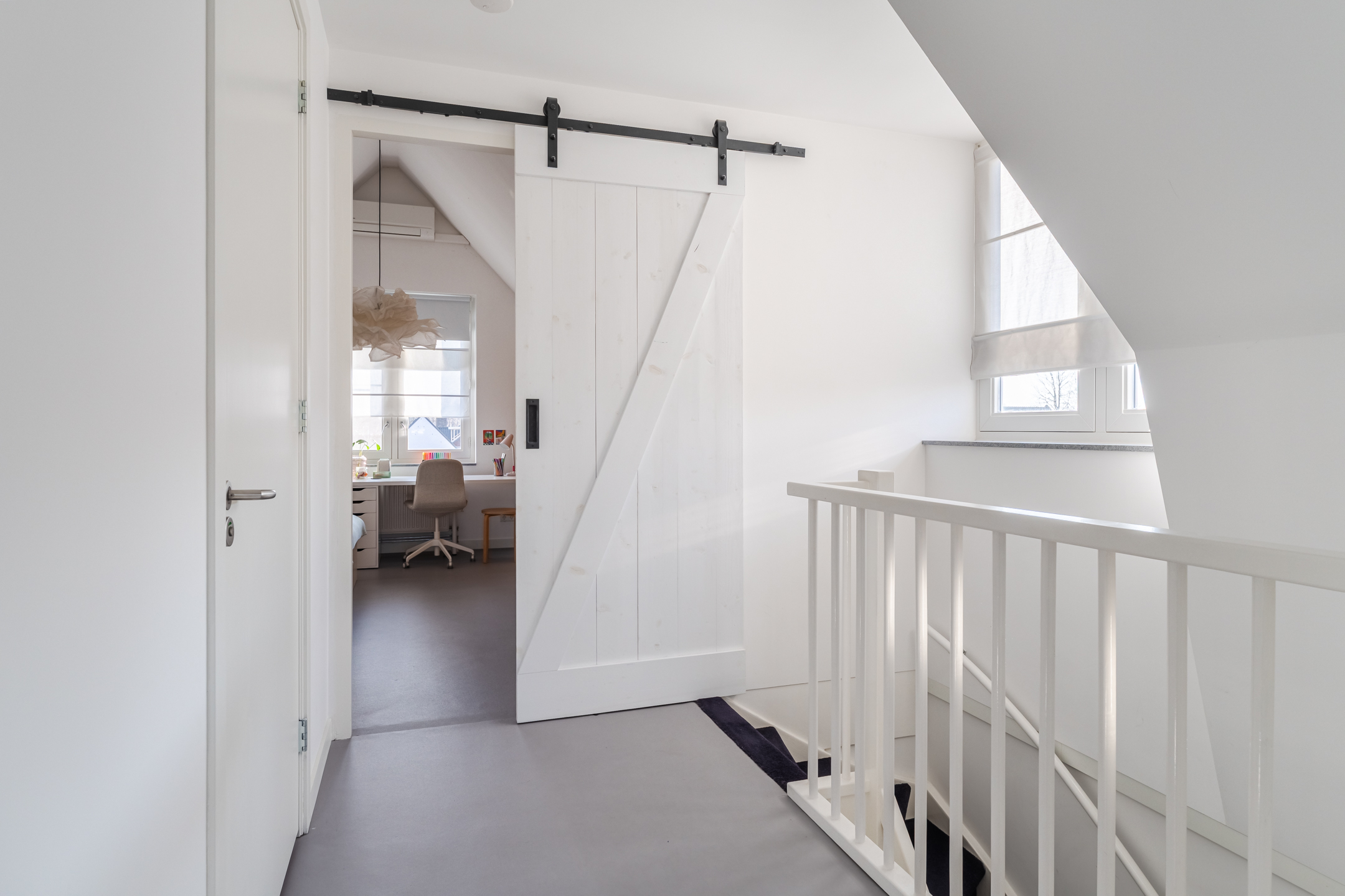 De eerste verdieping is afgewerkt met een gietvloer en strak gestucte wanden en plafonds, waarbij de overloop is voorzien van een airco.