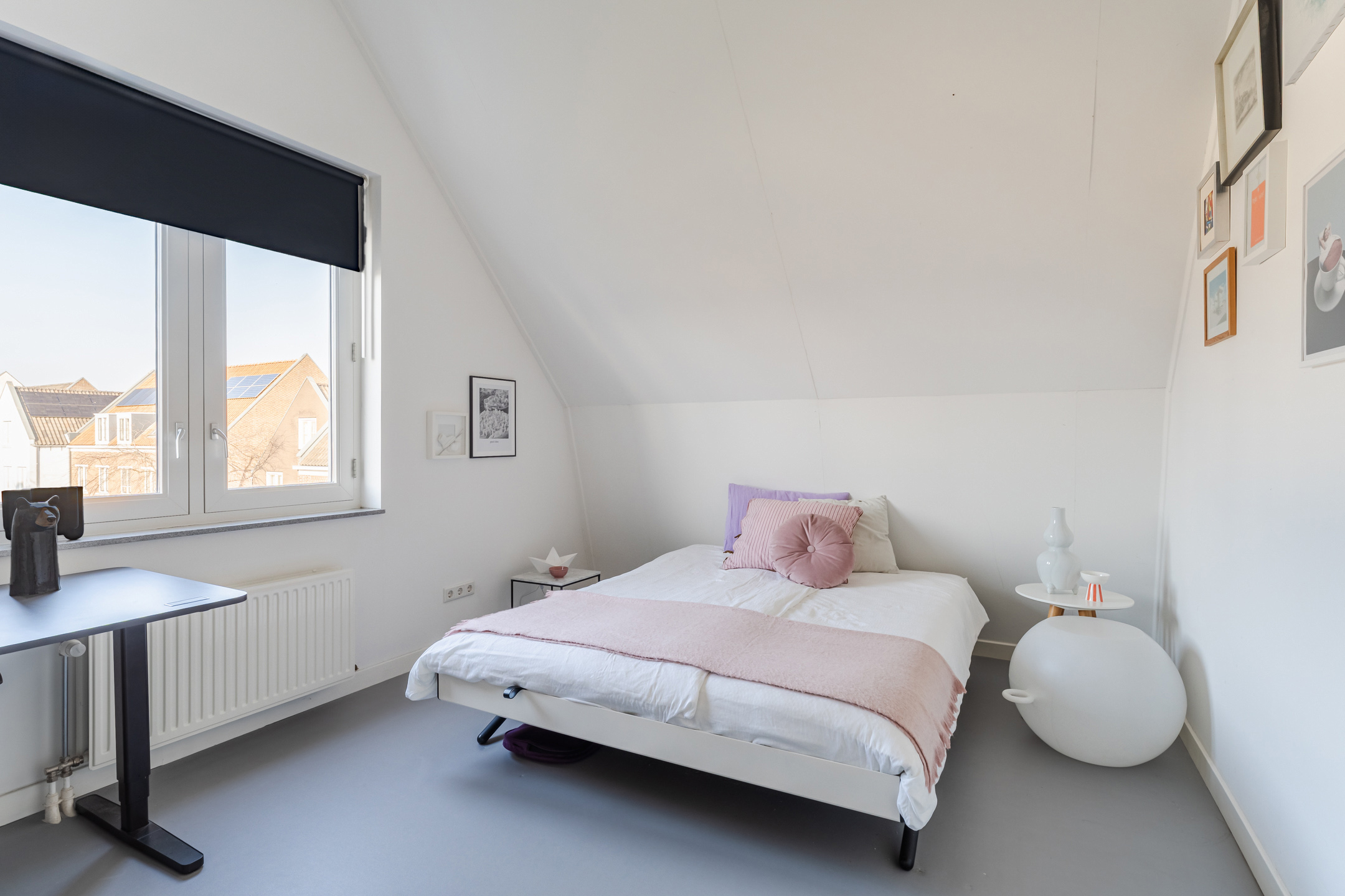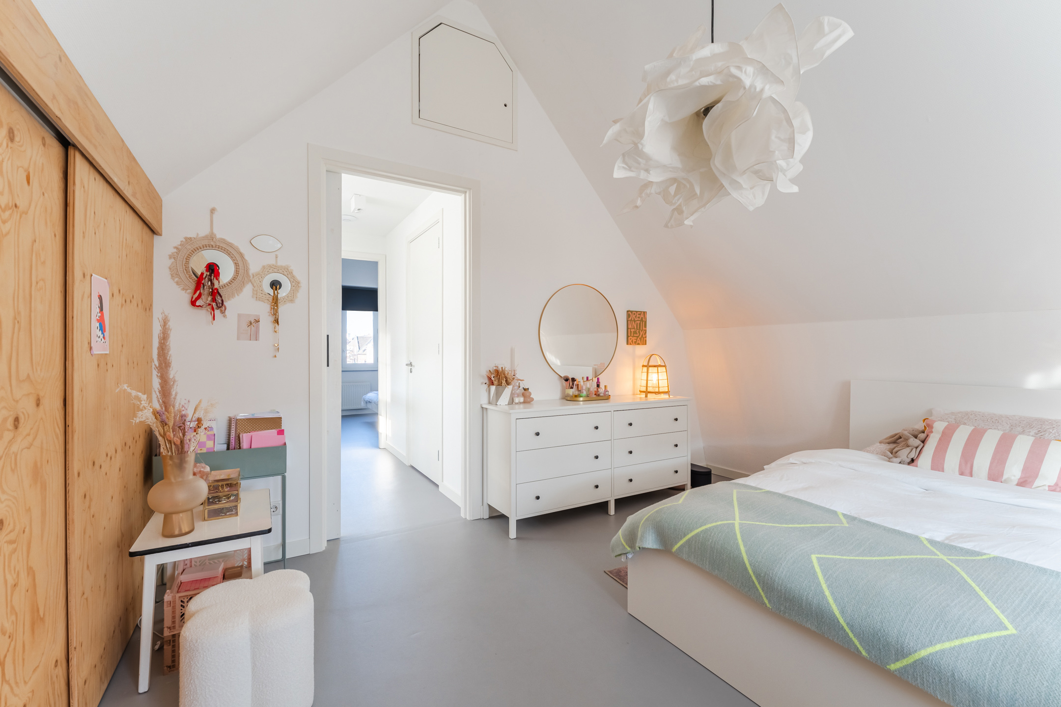 Aan de oostzijde van de woning bevindt zich een ruime slaapkamer (ca. 3.34 m x 5.26 m) die zich uitstrekt over de diepte van de woning en is voorzien van een hoog plafond tot in de nok, wat zorgt voor een prettig ruimtelijk gevoel.