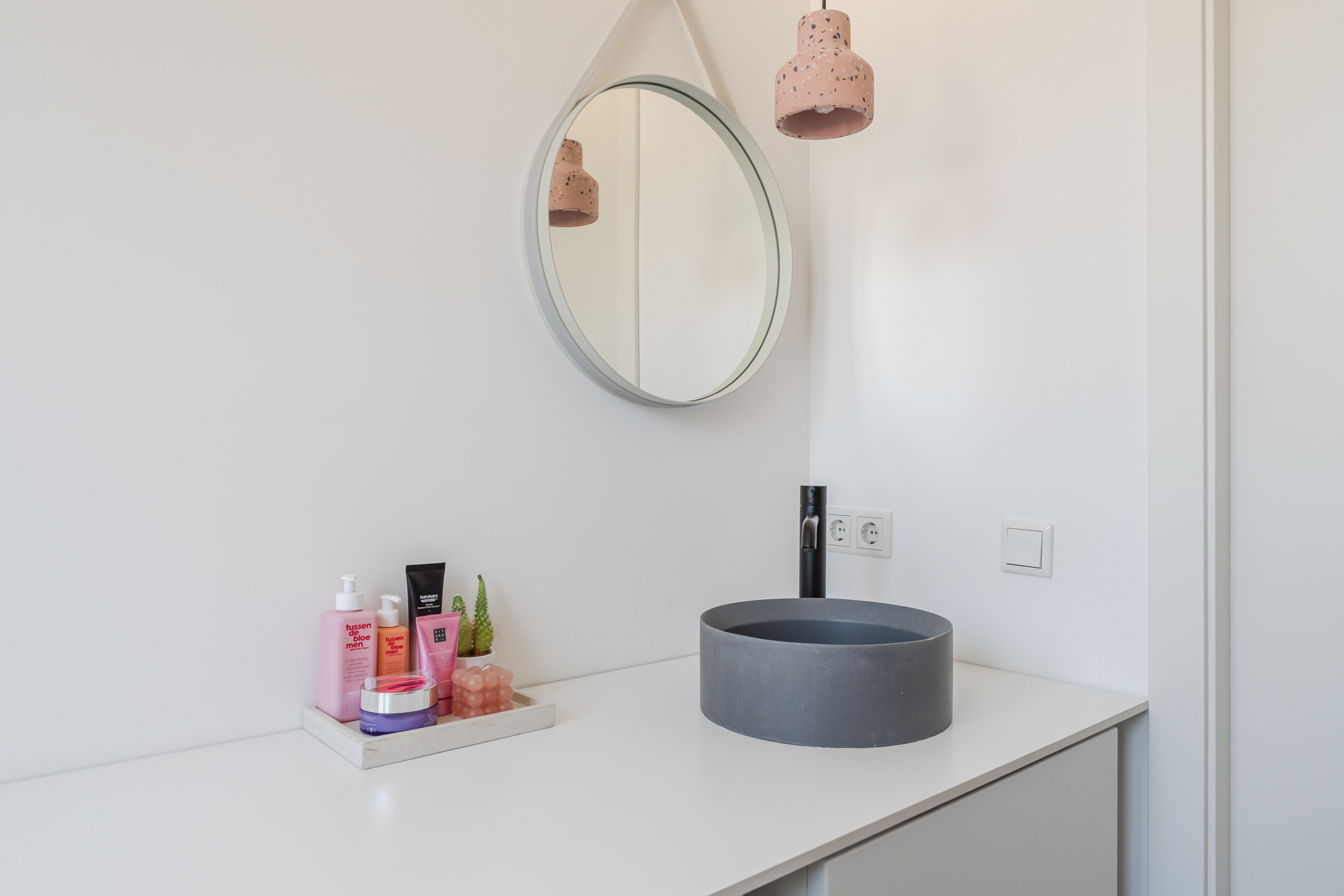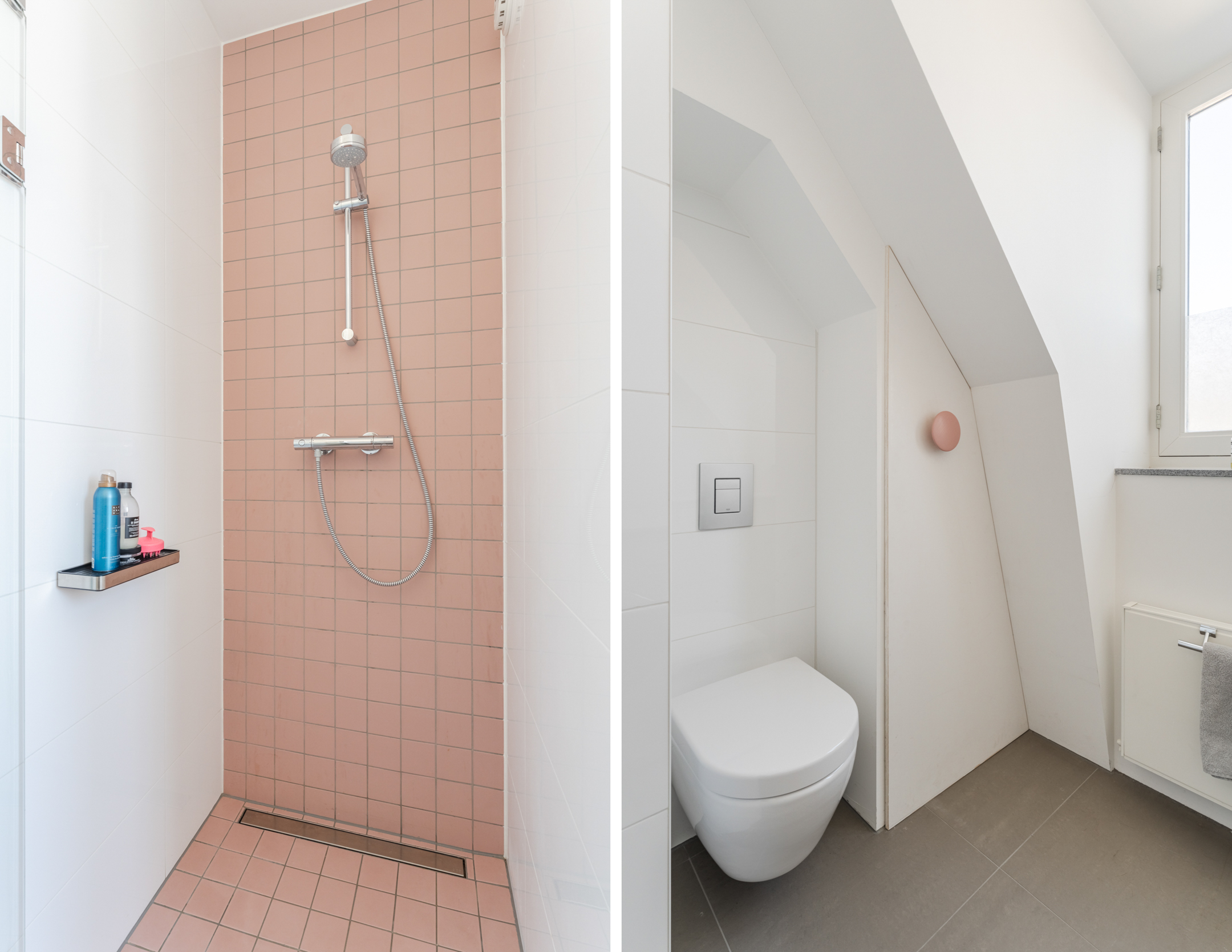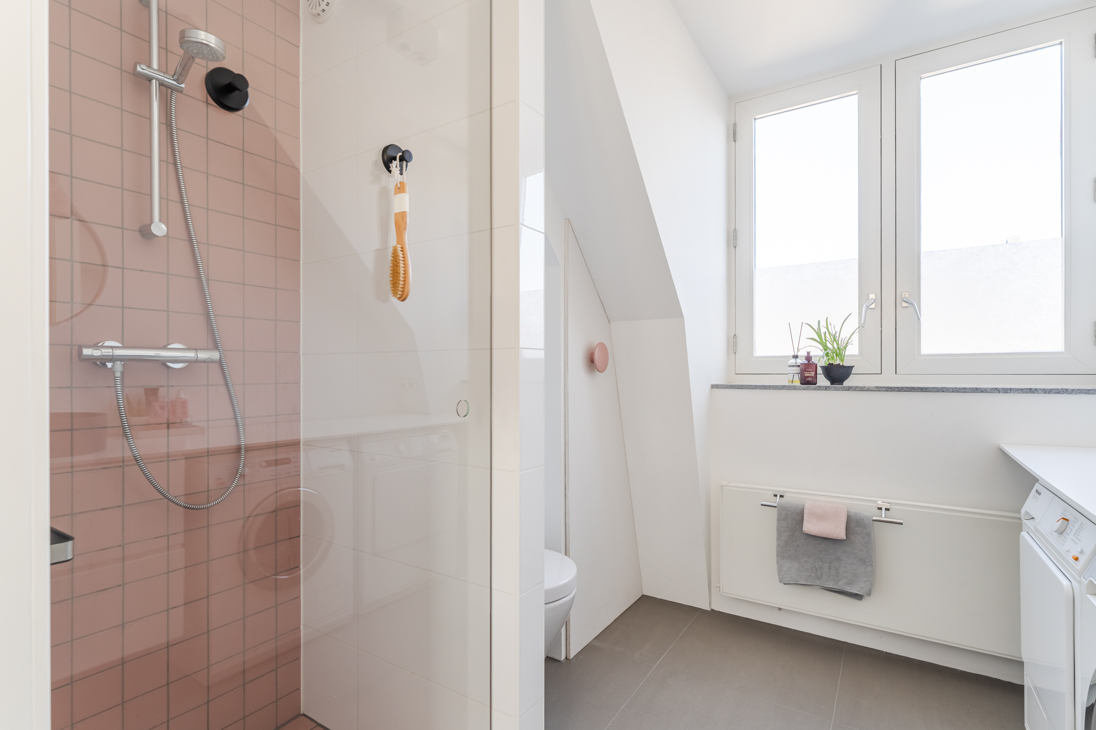 De badkamer bevindt zich aan de voorzijde van de woning en is afgewerkt met lichtgrijze vloertegels en een combinatie van witte wandtegels en deels gestucte wanden. De inloopdouche heeft een lichtroze achterwand en vloerafwerking, wat zorgt voor een speels accent in de ruimte. De badkamer beschikt over een inloopdouche, een wastafel met meubel, een derde toilet, mechanische ventilatie en een raam voor natuurlijke ventilatie en daglicht. Tevens bevinden zich hier de aansluitingen voor de wasmachine en droger.