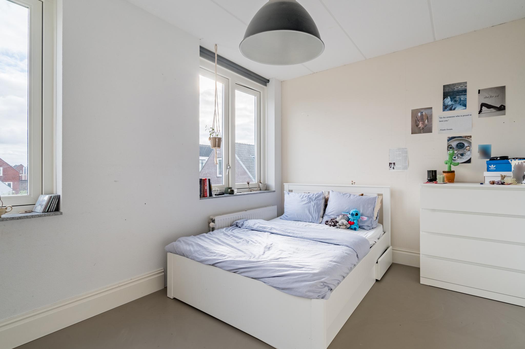 Overloop, trapopgang naar de tweede verdieping. Aan de voorzijde van de woning is over de volle breedte een woningbrede slaapkamer (ca. 4.45×2.53) gesitueerd welke uitzicht biedt op de straat en de directe omgeving.