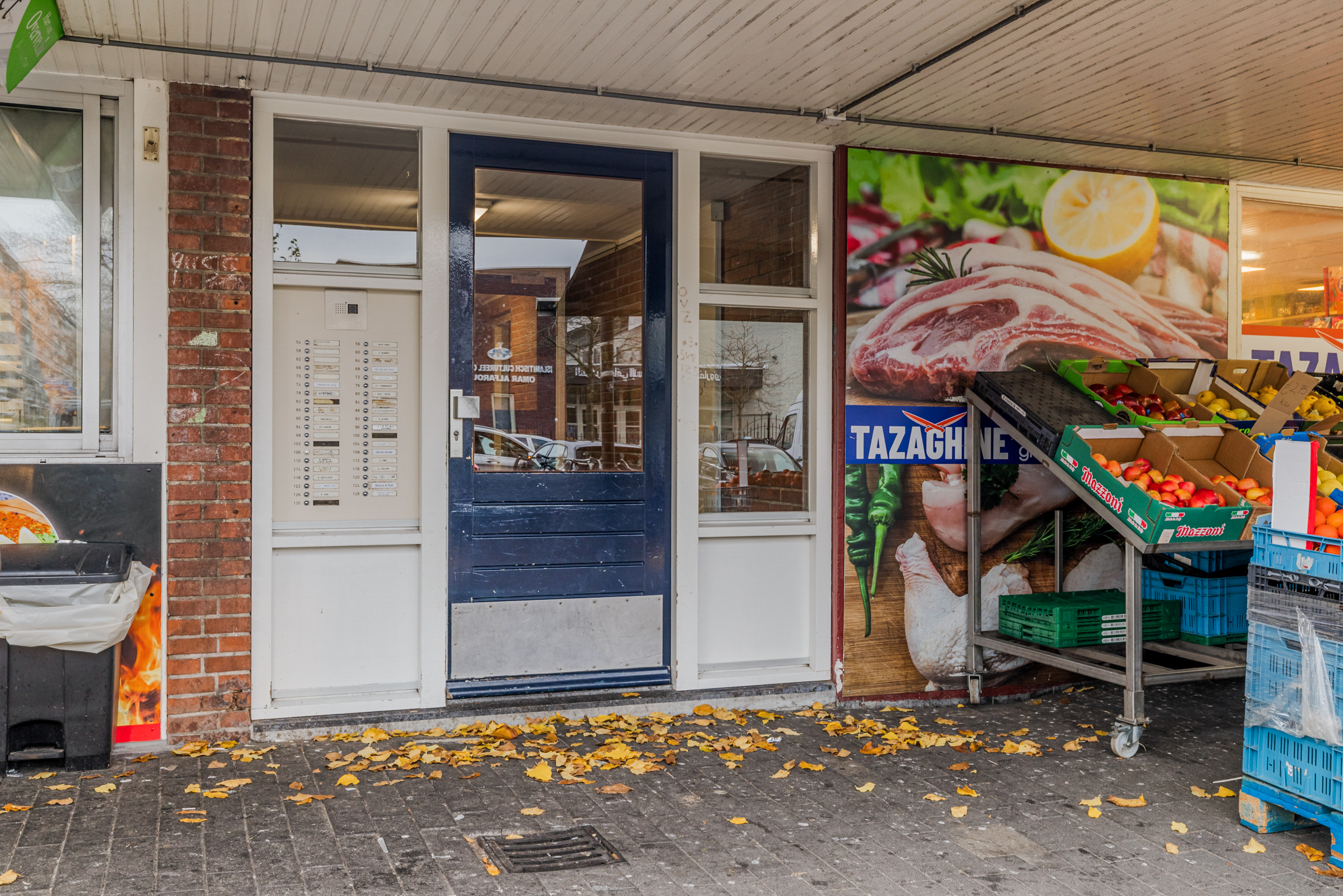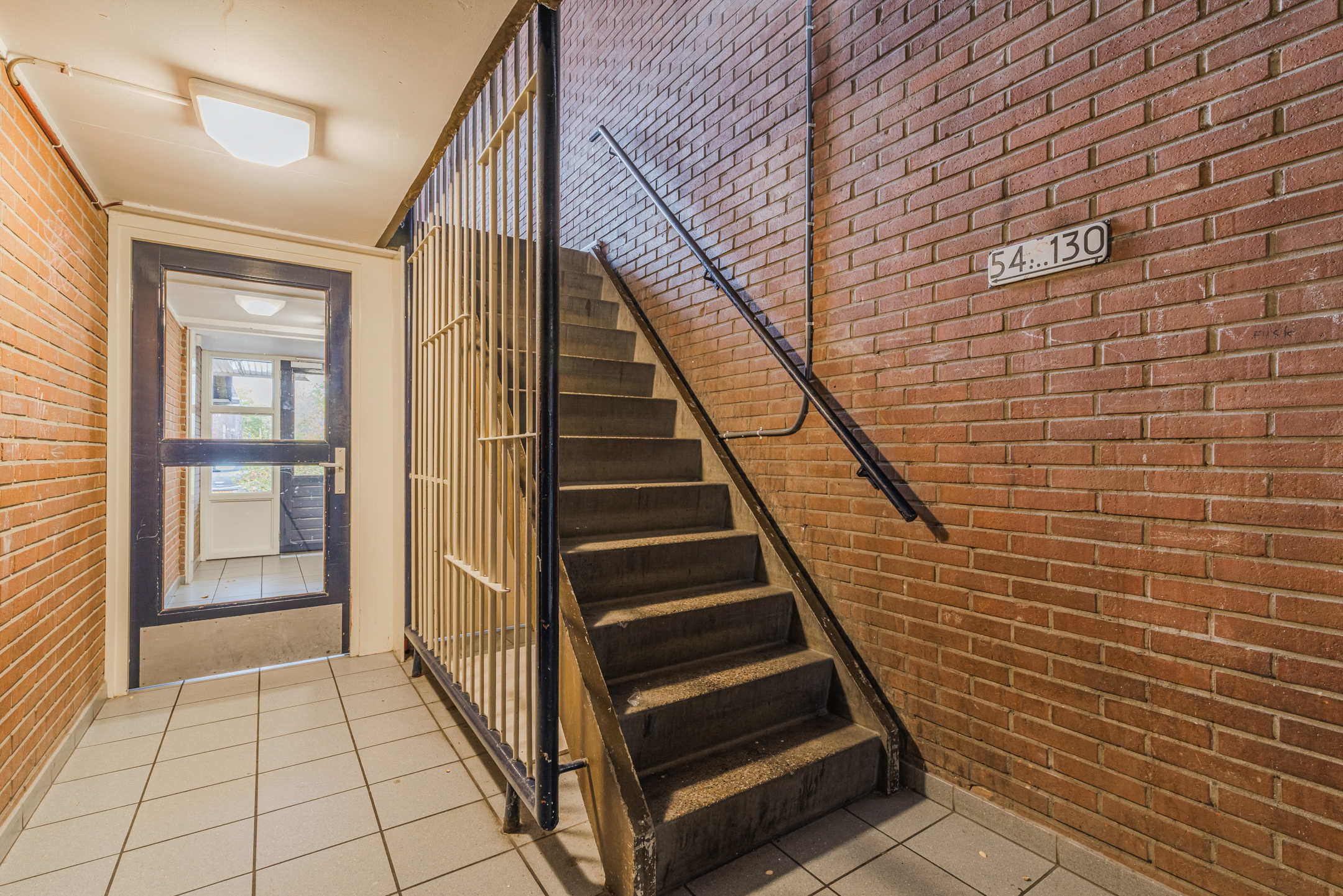 Gezamenlijk entree met bellentableau en brievenbussen, het trappenhuis en toegang tot de individuele bergingen.