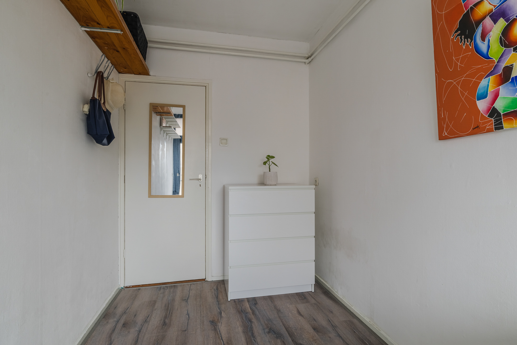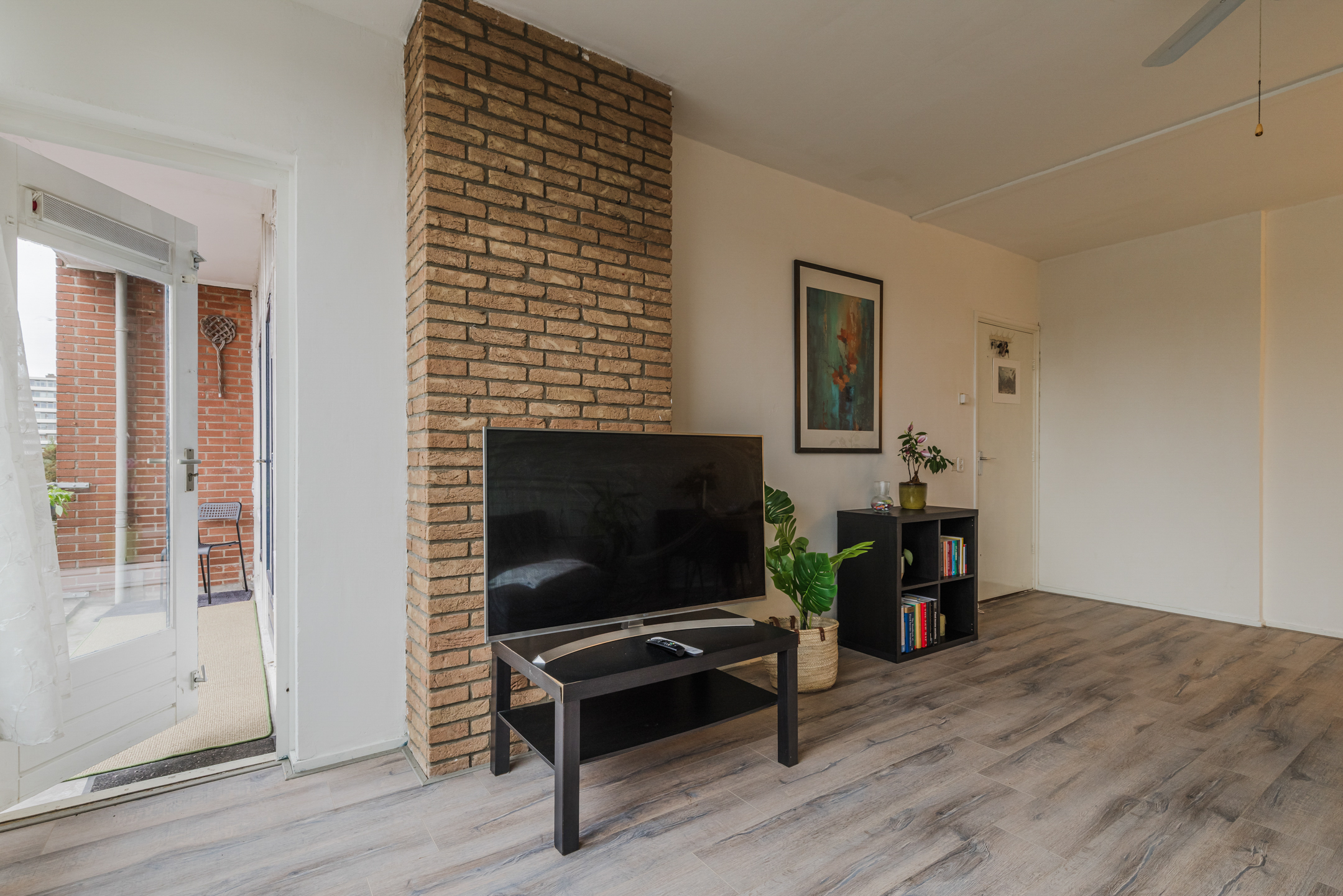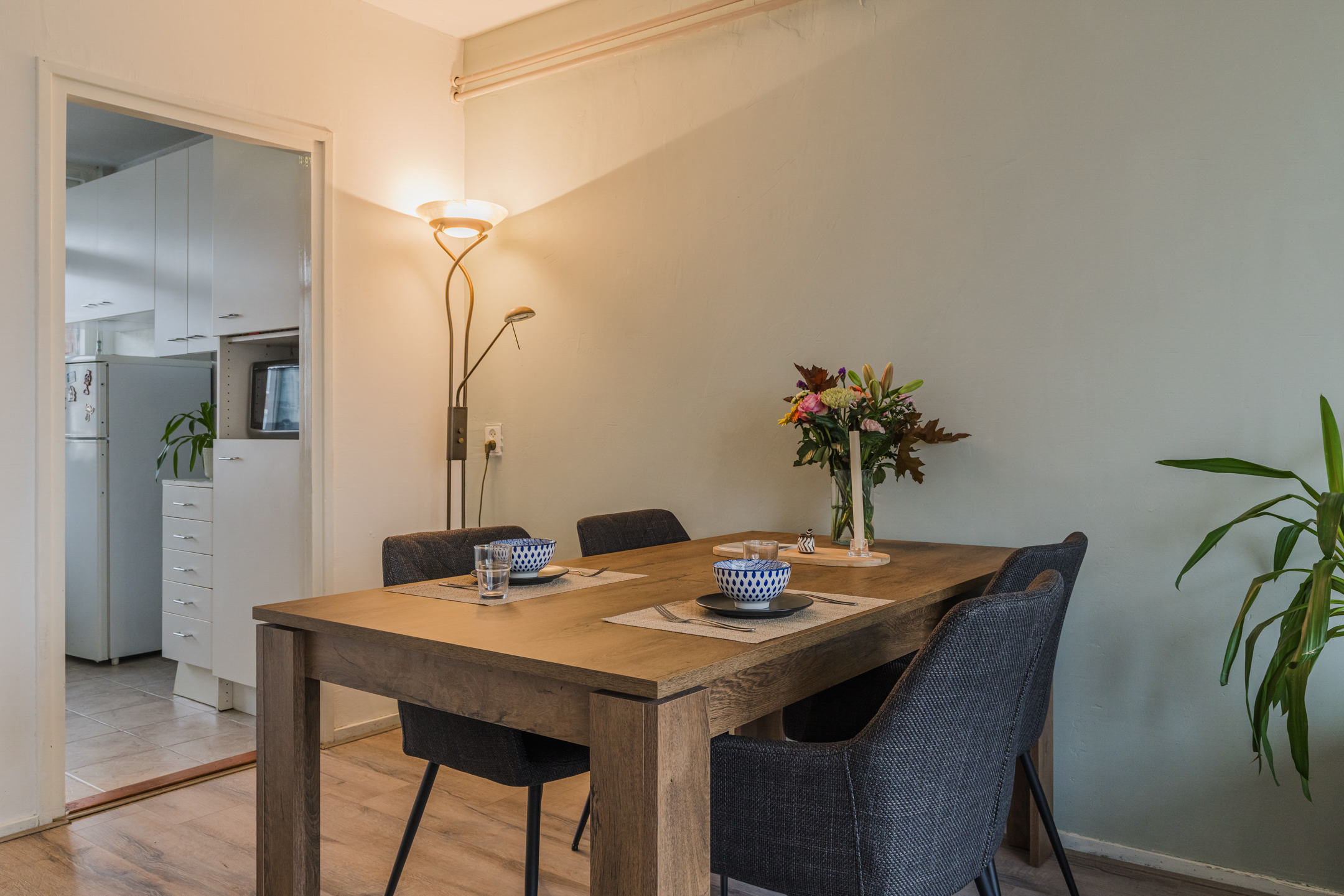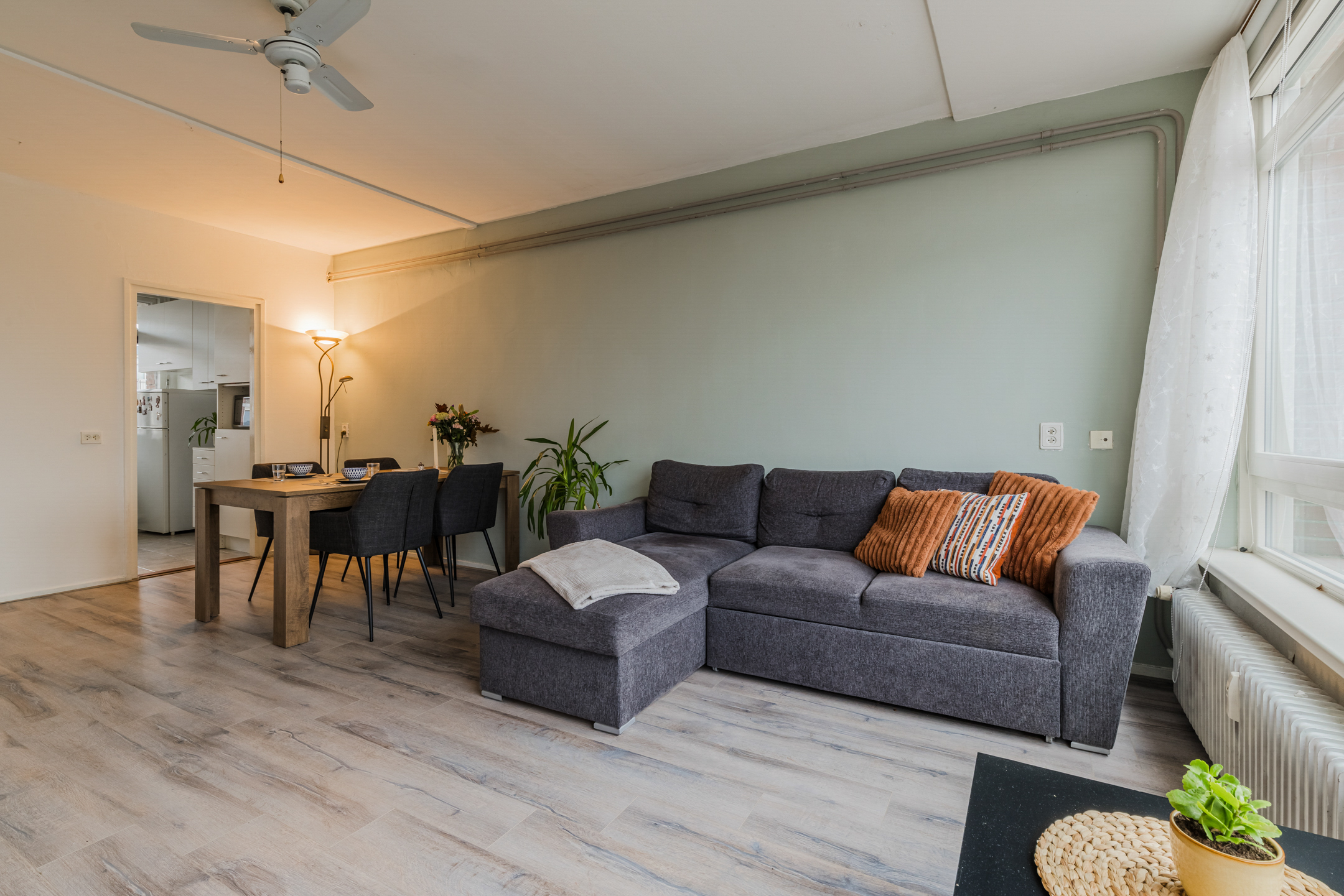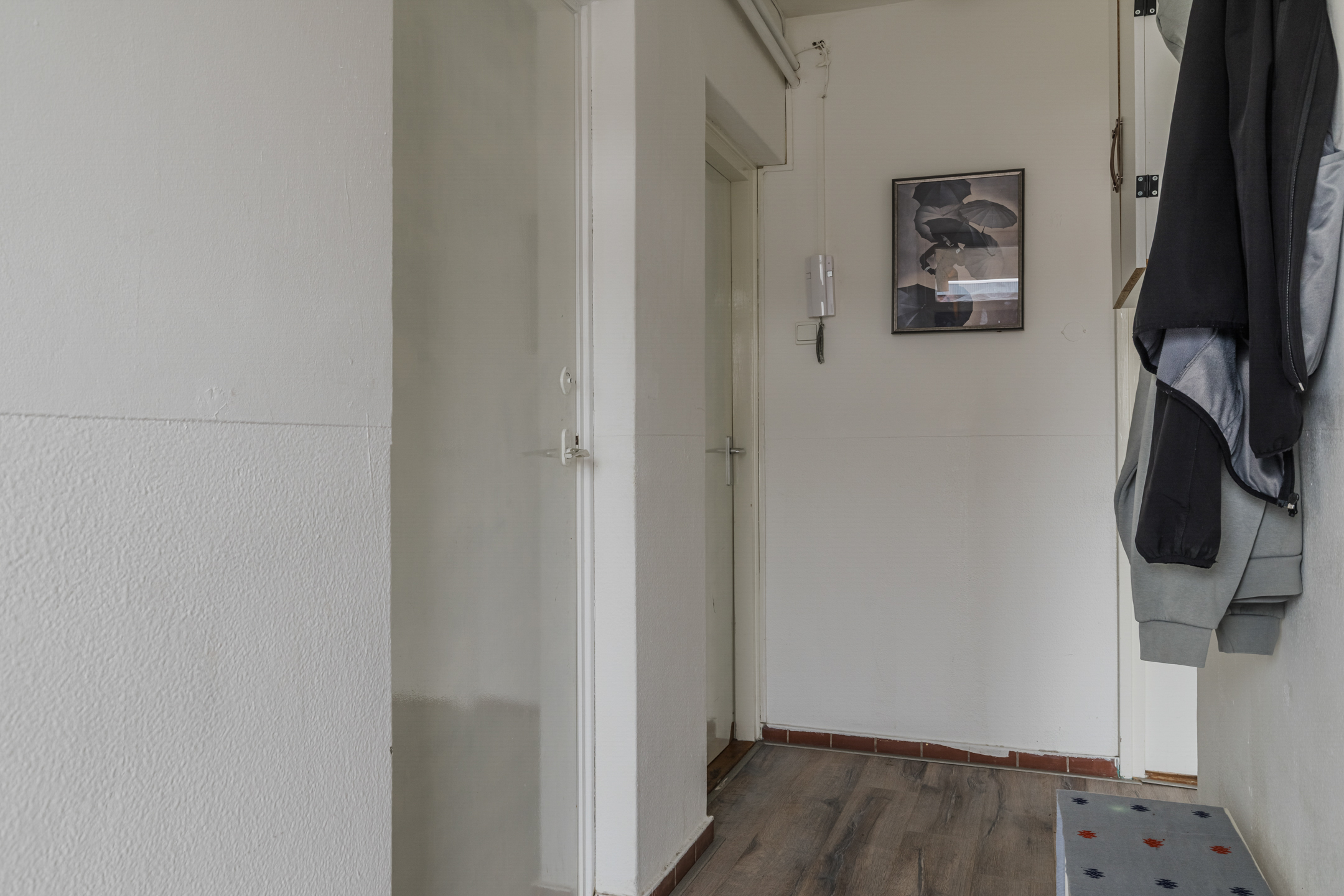 Het appartement is afgewerkt met lichte muren, deels voorzien van een laminaatvloer en met tegels in de keuken.
