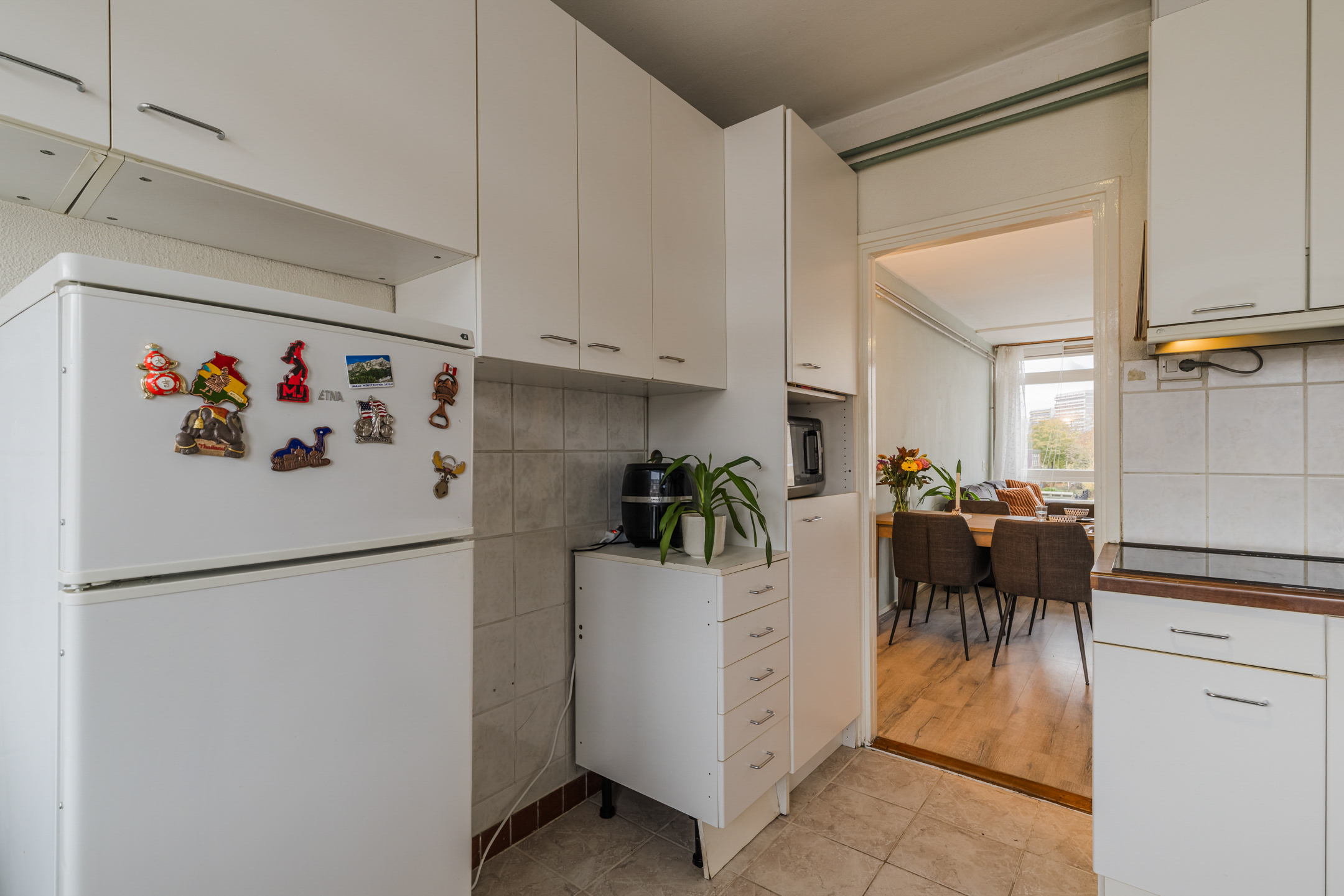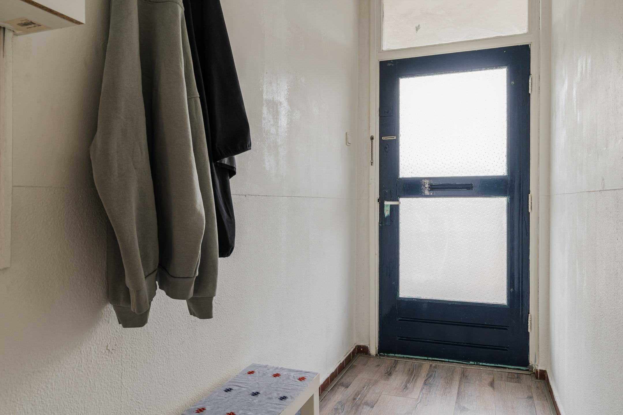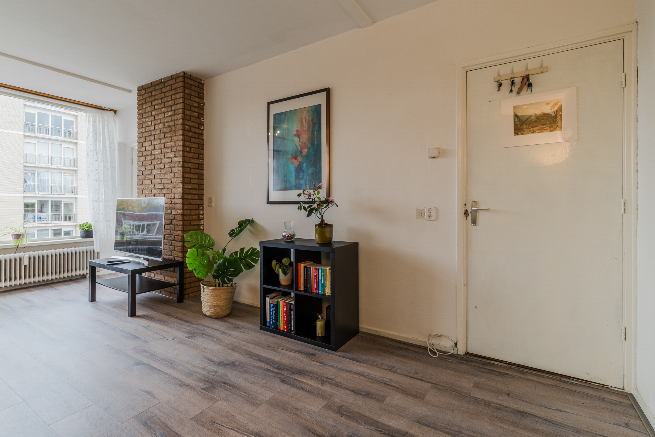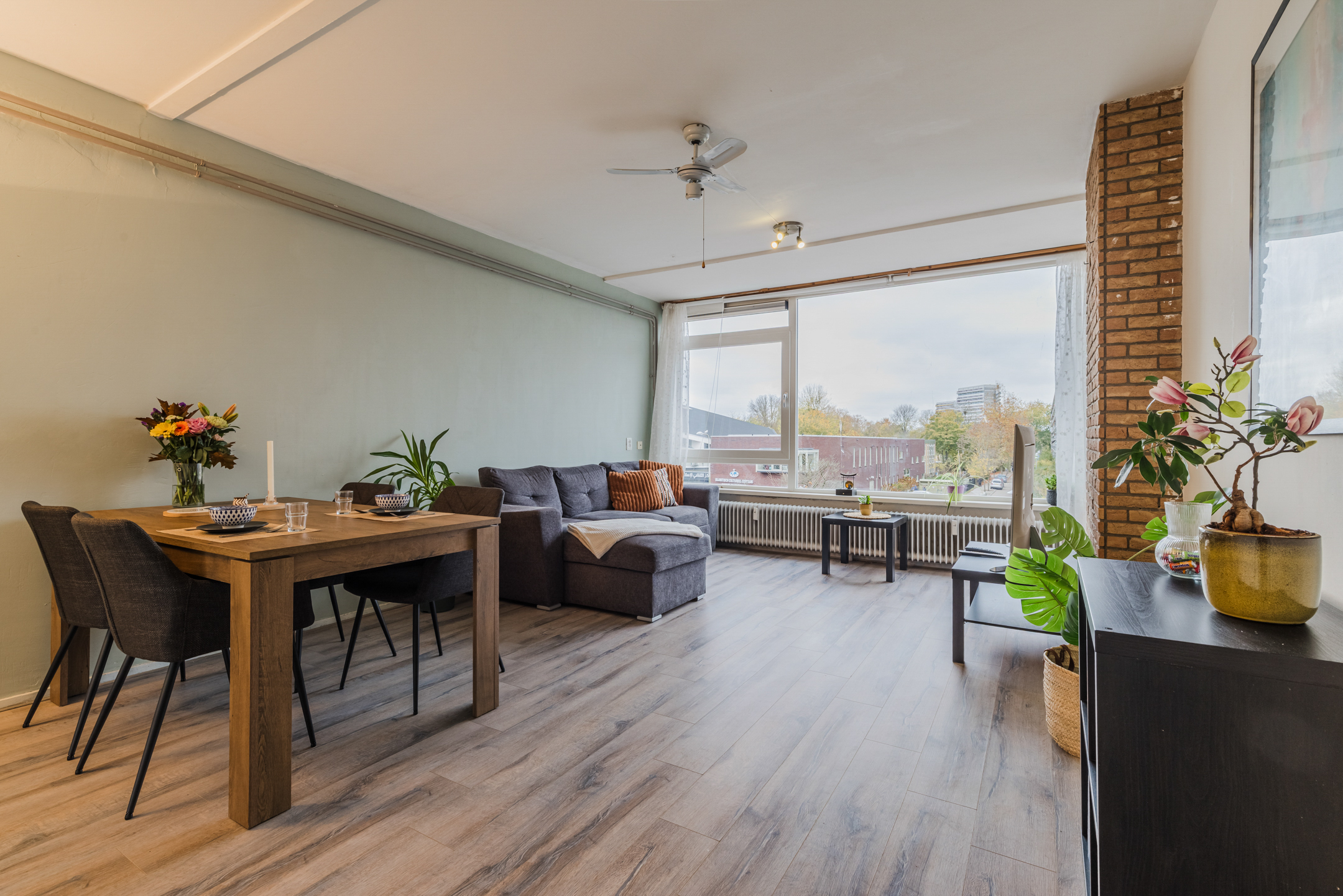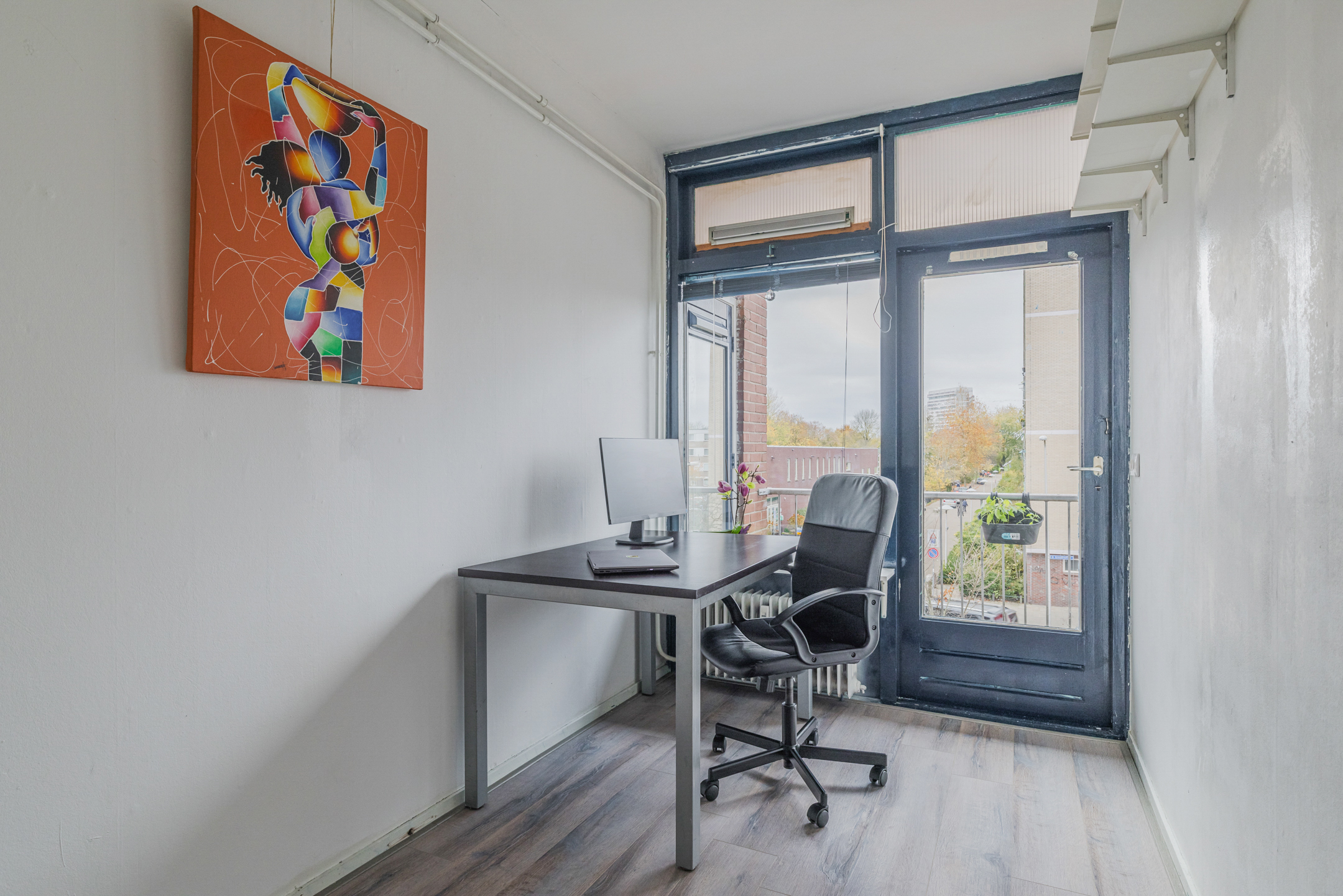 Het appartement is afgewerkt met lichte muren, deels voorzien van een laminaatvloer en met tegels in de keuken.