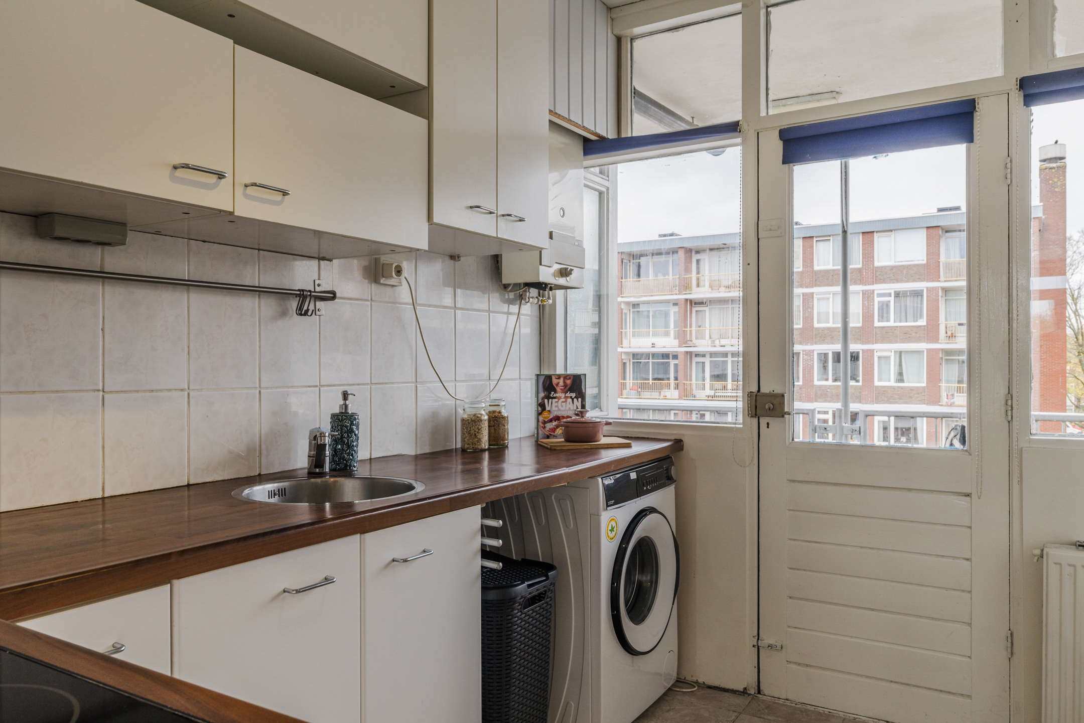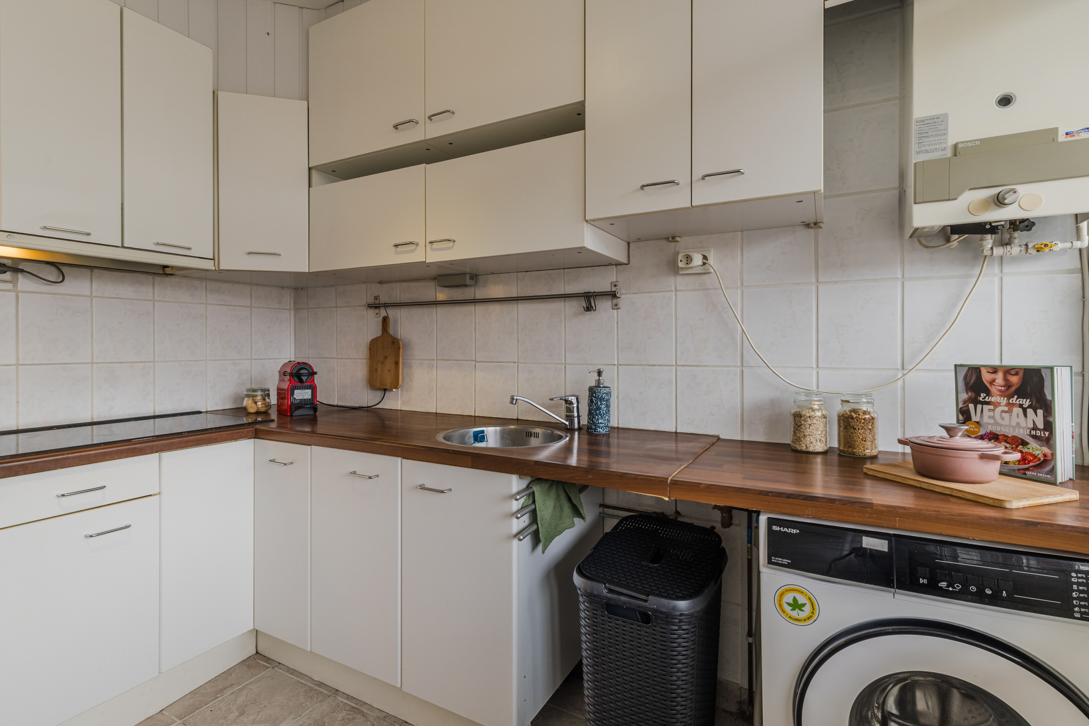 Via de woonkamer is de halfopen keuken bereikbaar. De keuken is voorzien van een inductiekookplaat, een houten werkblad én veel kastruimte. Tevens bevindt zich in deze keuken de aansluiting voor de wasmachine. Vanuit de keuken is er via een openslaande deur toegang tot de galerij.