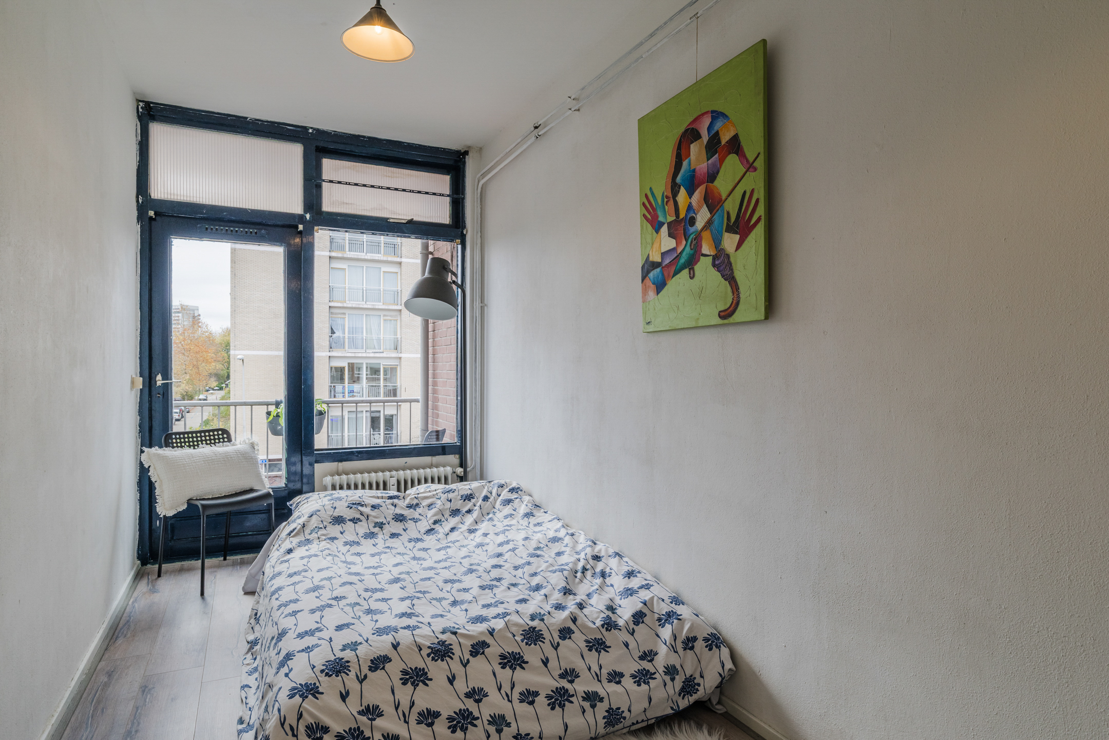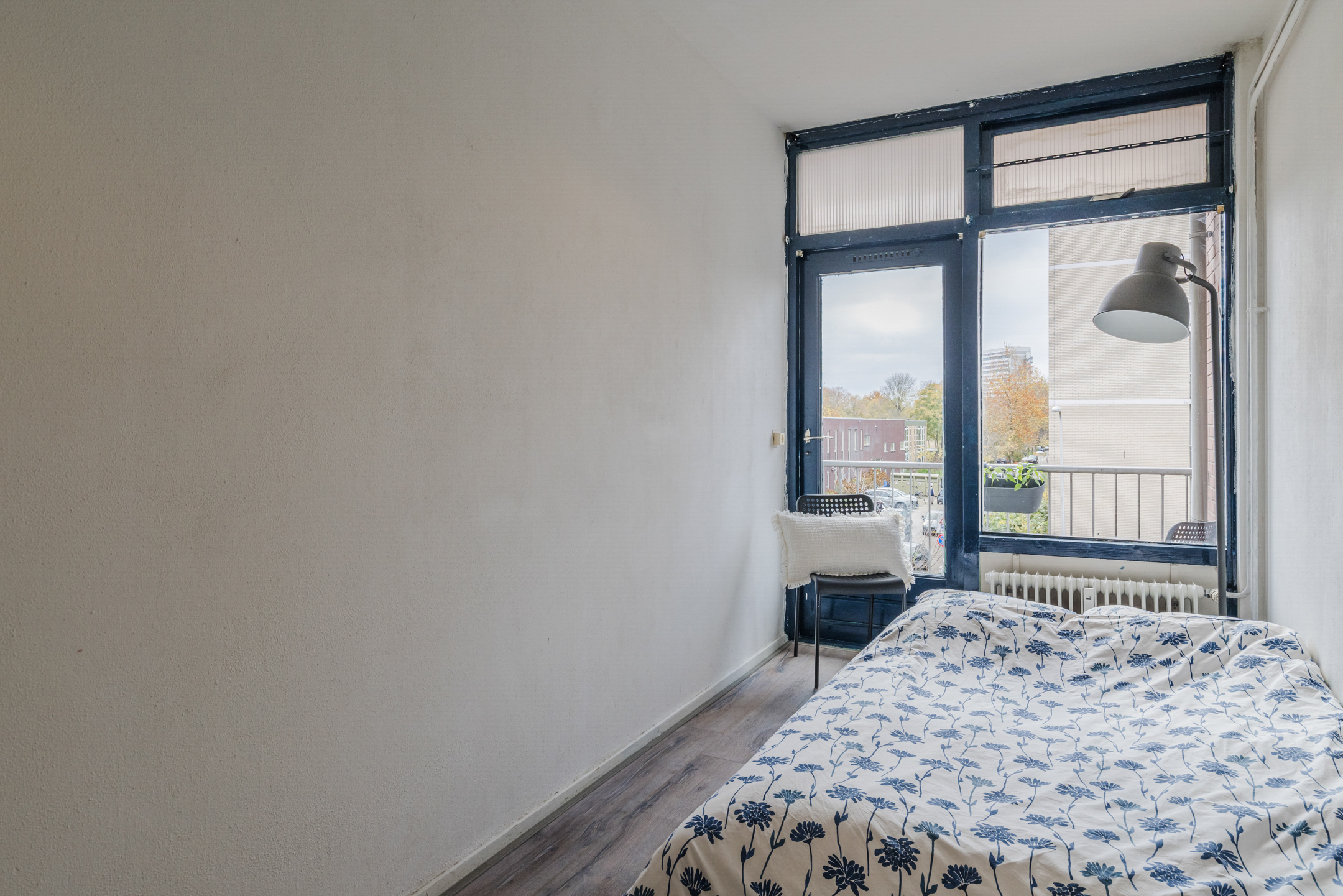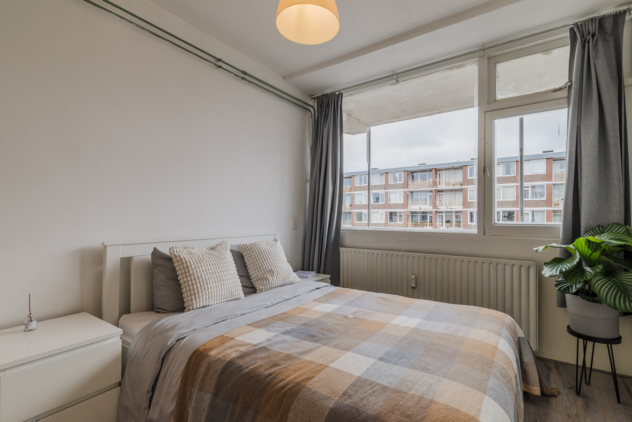 De “masterbedroom” bevindt zich aan de galerijkant van het appartement en biedt voldoende ruimte voor een tweepersoonsbed. De grote raampartij zorgt ervoor dat deze kamer baadt in het zonlicht.