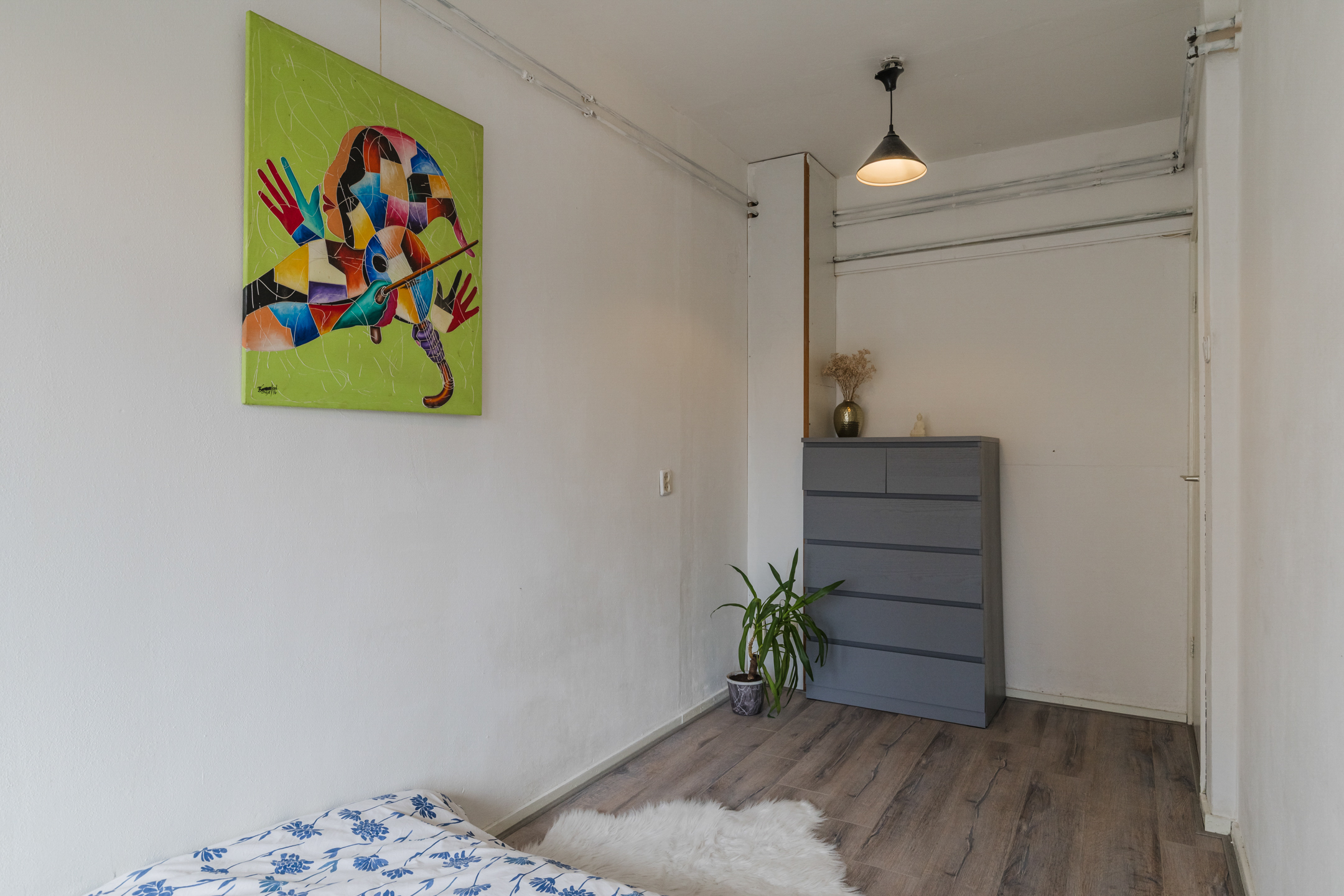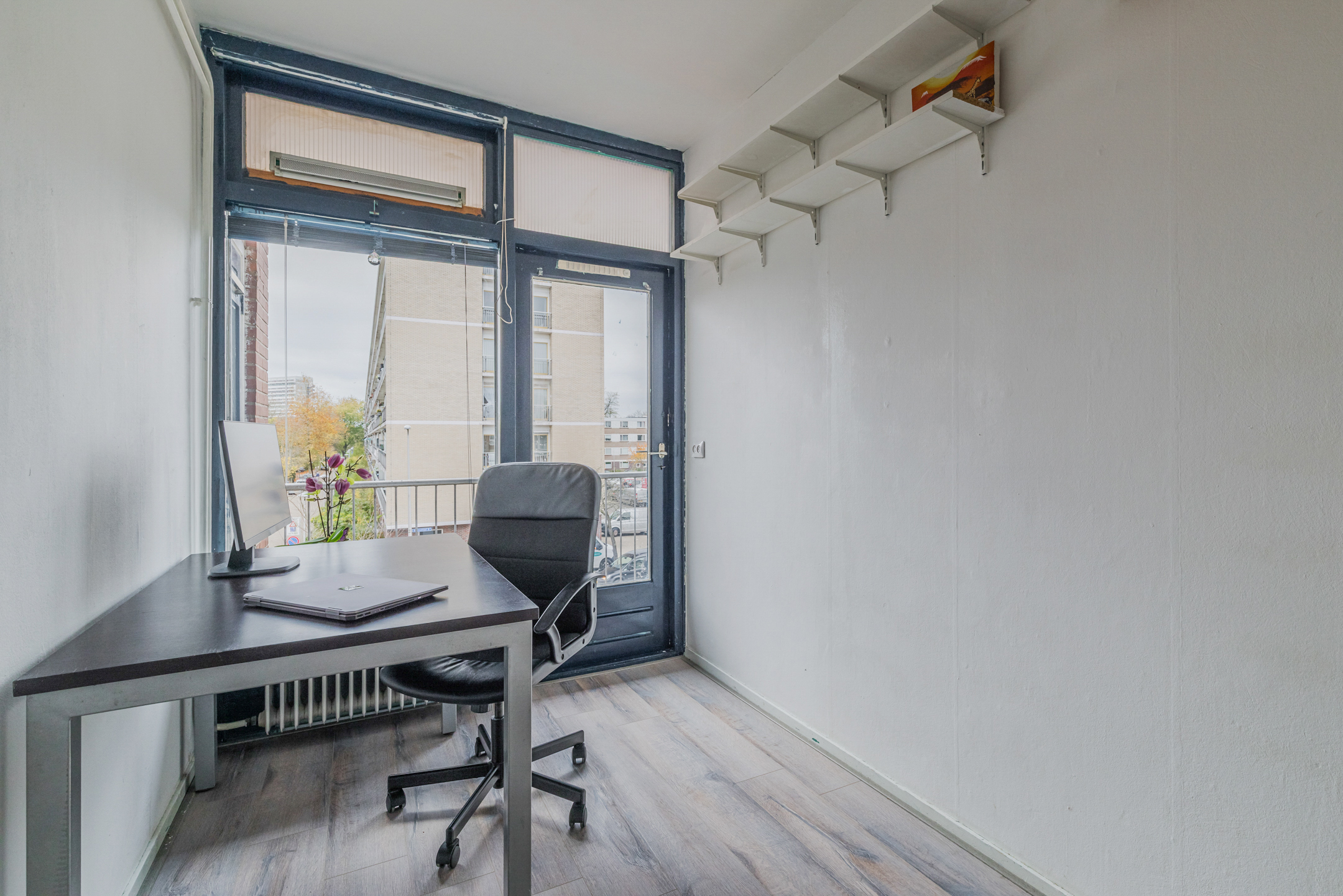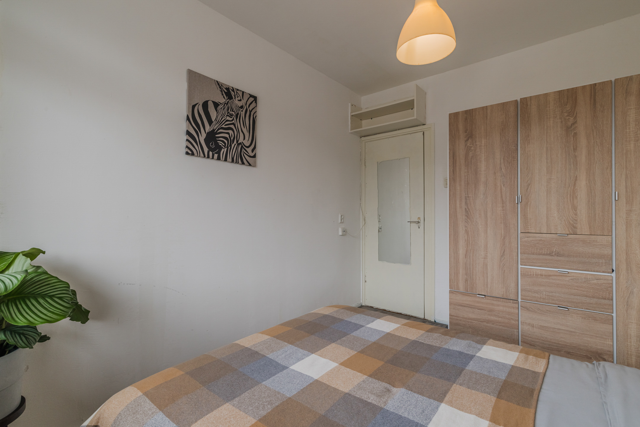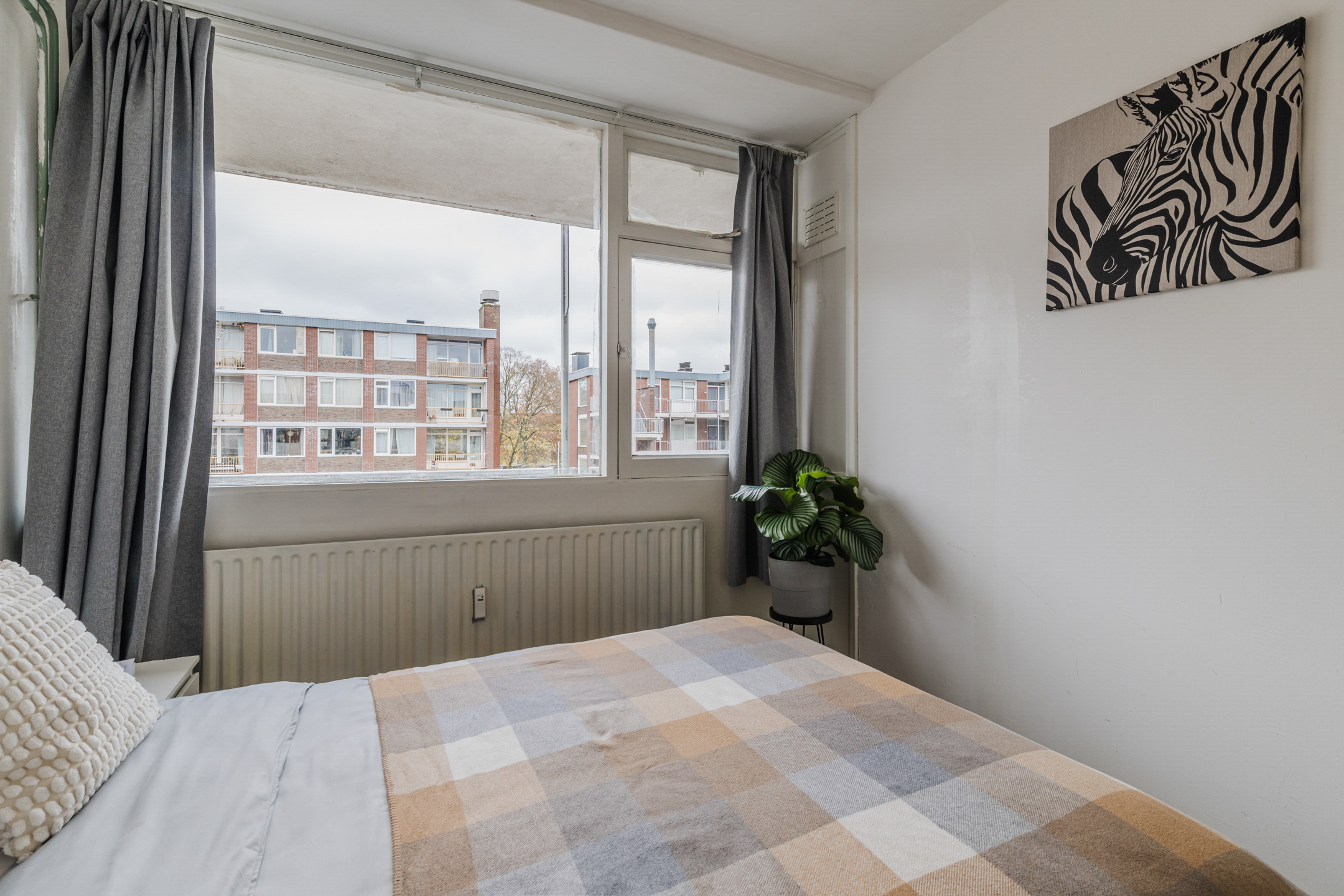 De “masterbedroom” bevindt zich aan de galerijkant van het appartement en biedt voldoende ruimte voor een tweepersoonsbed. De grote raampartij zorgt ervoor dat deze kamer baadt in het zonlicht.