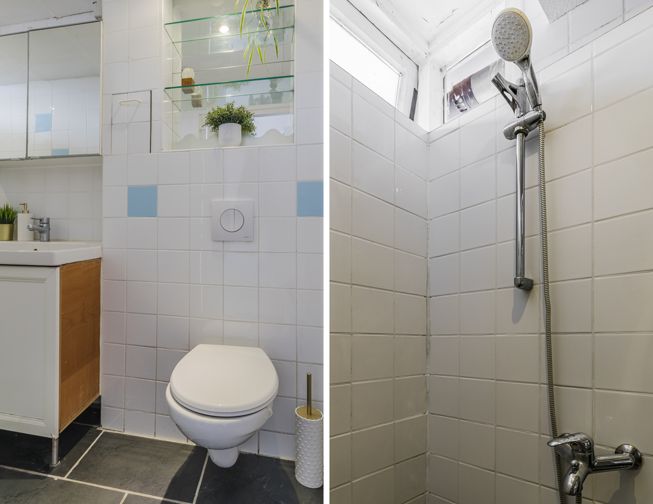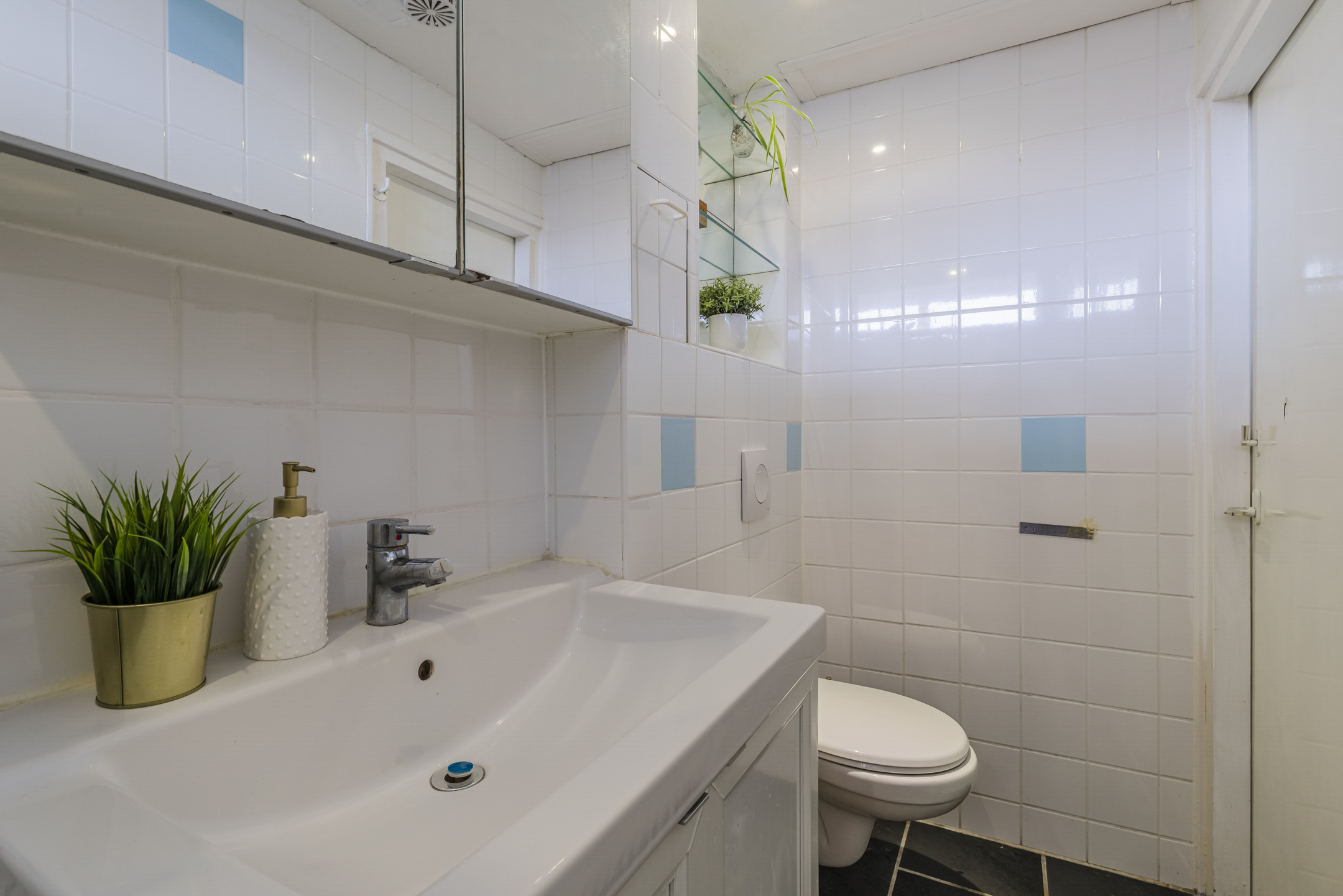 De praktische badkamer is uitgevoerd met een witte wandtegel in combinatie met een zwarte vloertegel. De badkamer beschikt over een inloopdouche voorzien van een glazen wand, een wastafel met meubel, een spiegelkast én een tweede hangend toilet.
