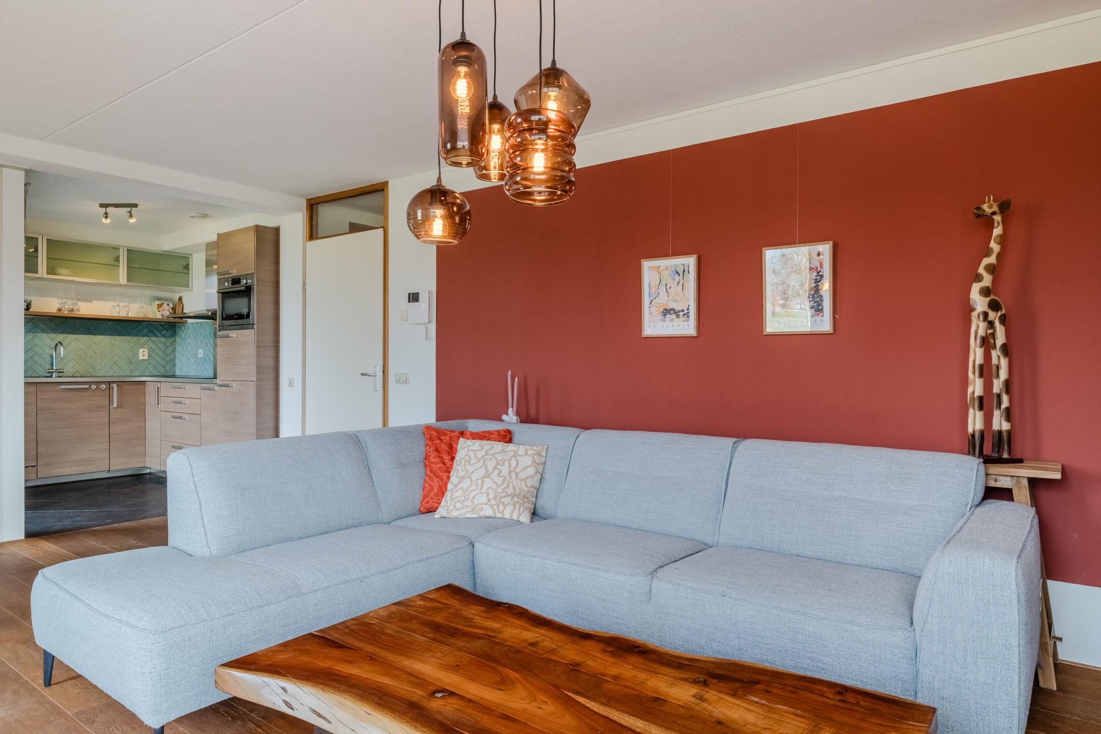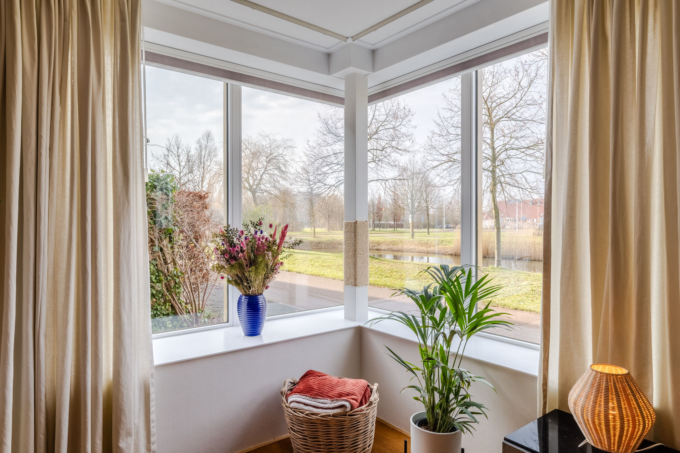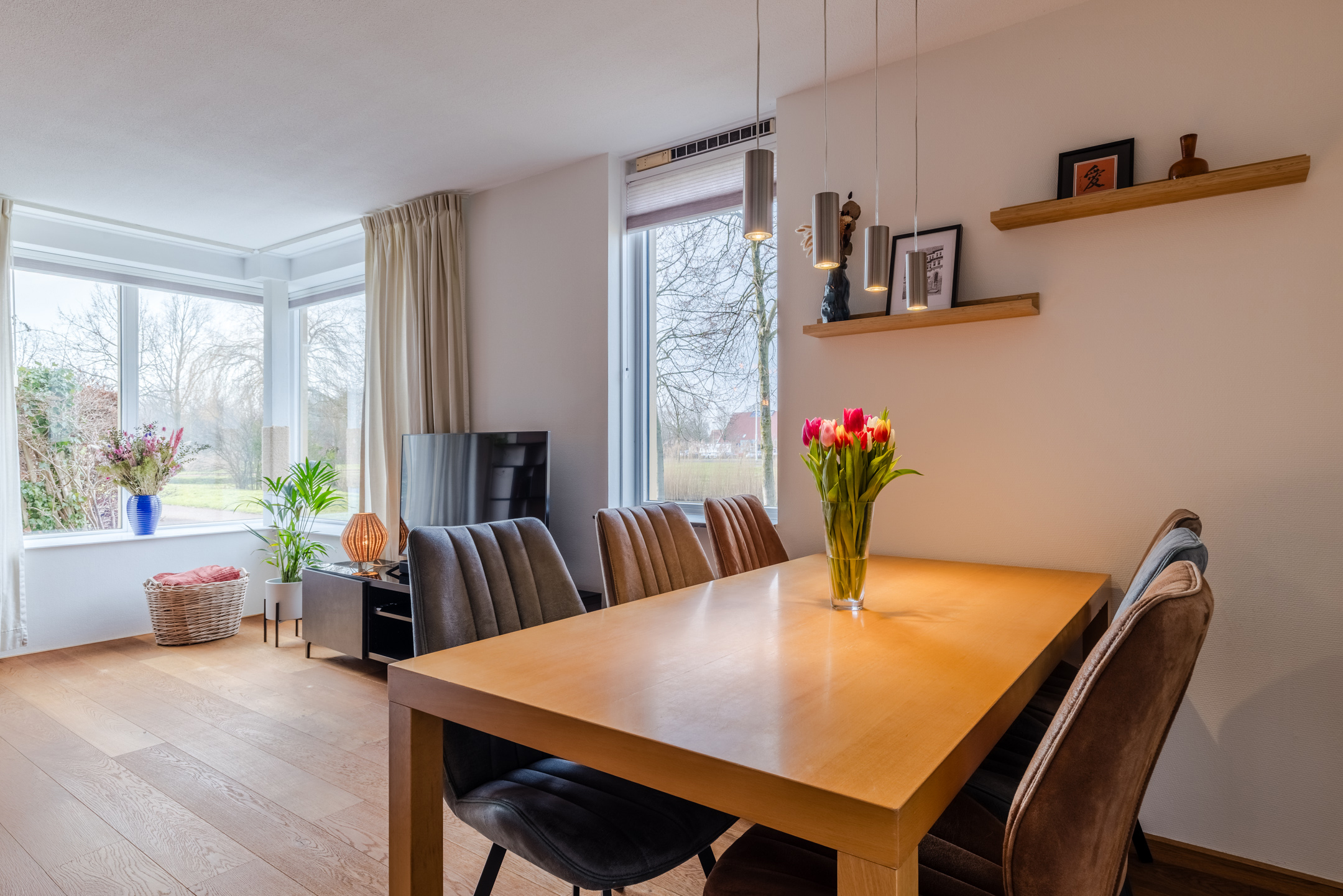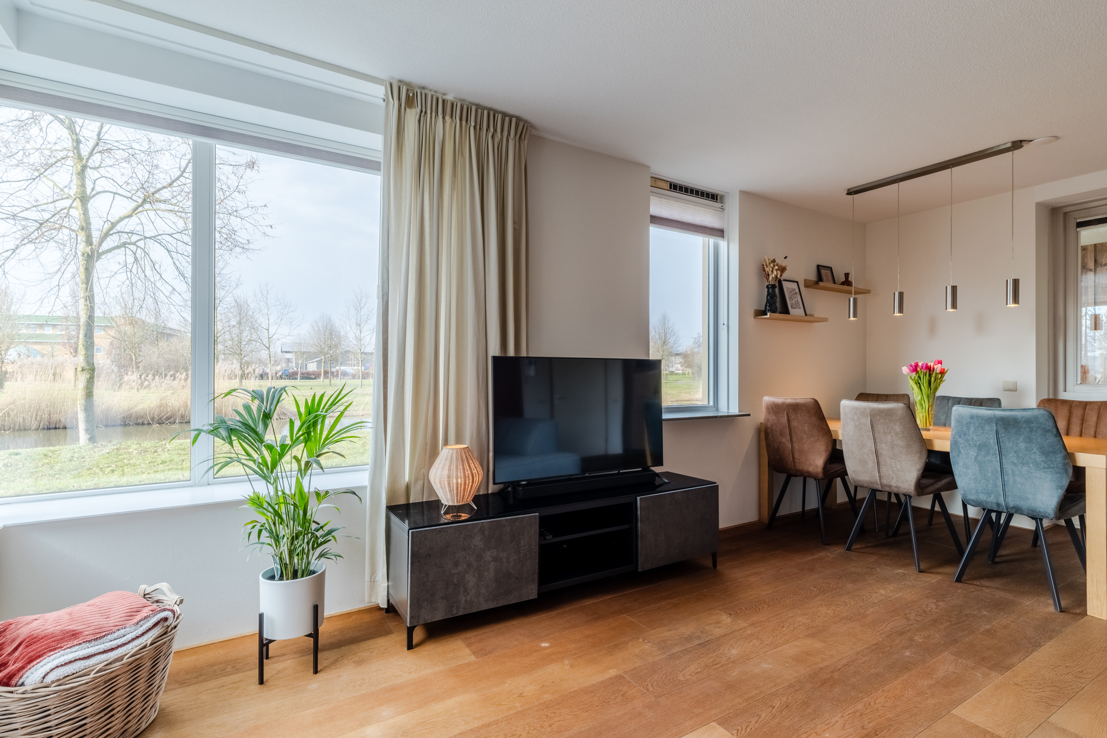 De woonkamer is heerlijk licht dankzij de grote raampartijen en biedt een vrij en groen uitzicht over water. Door de hoekligging en de prettige indeling voelt de ruimte open en ruimtelijk aan.
