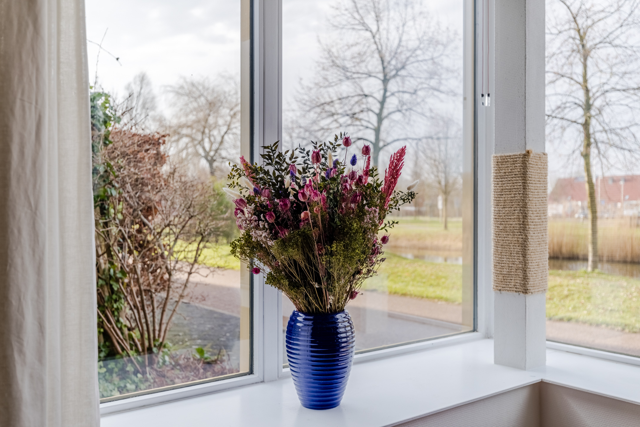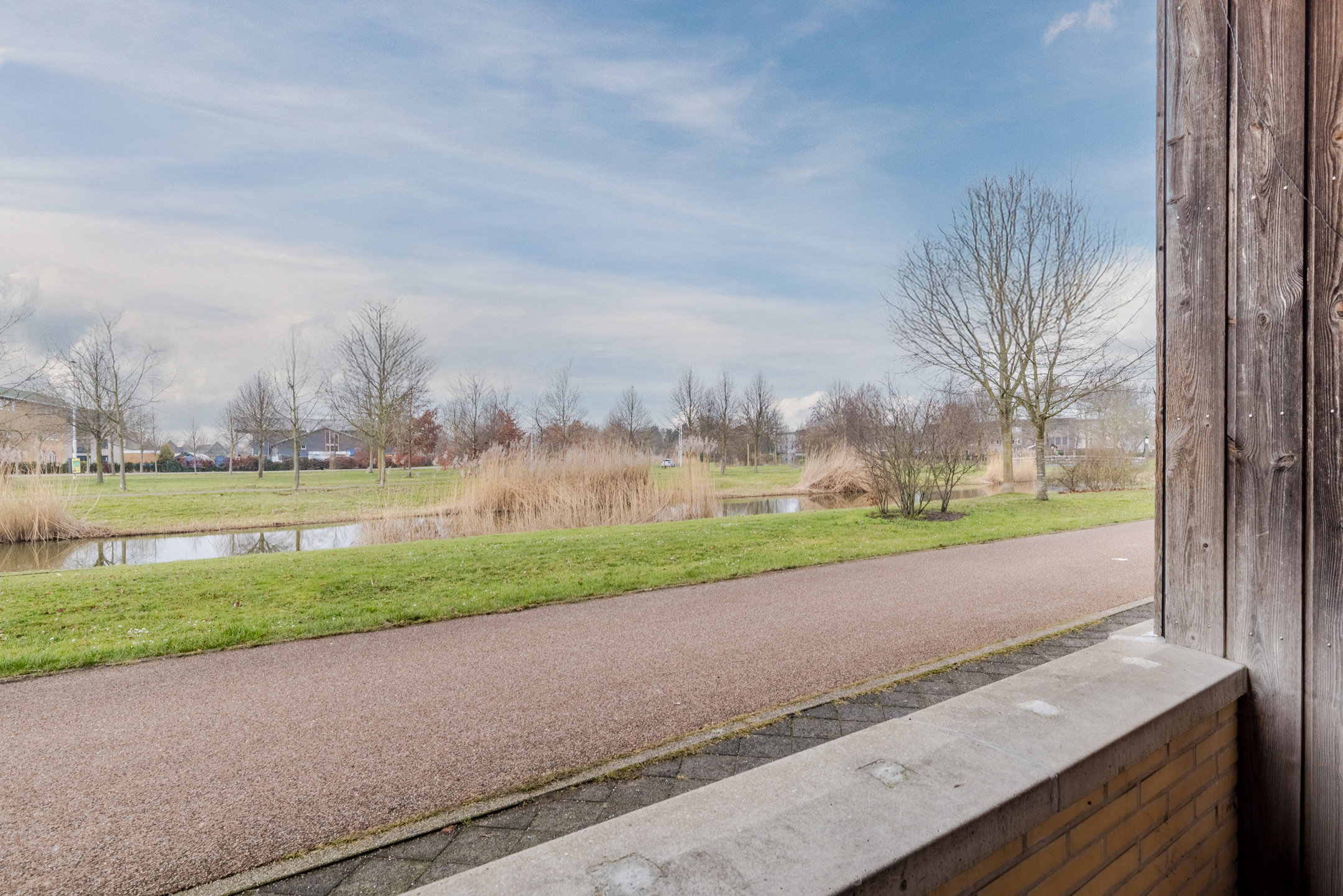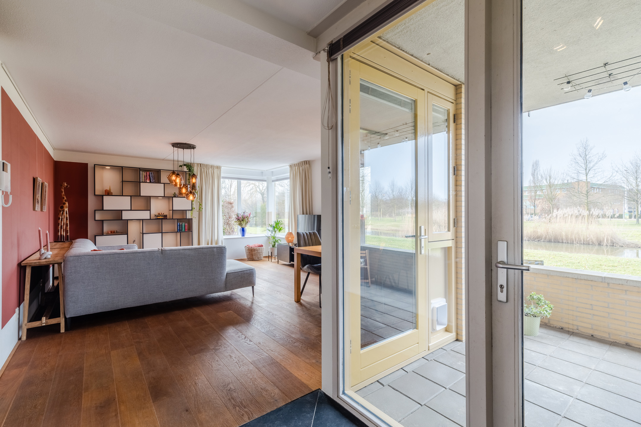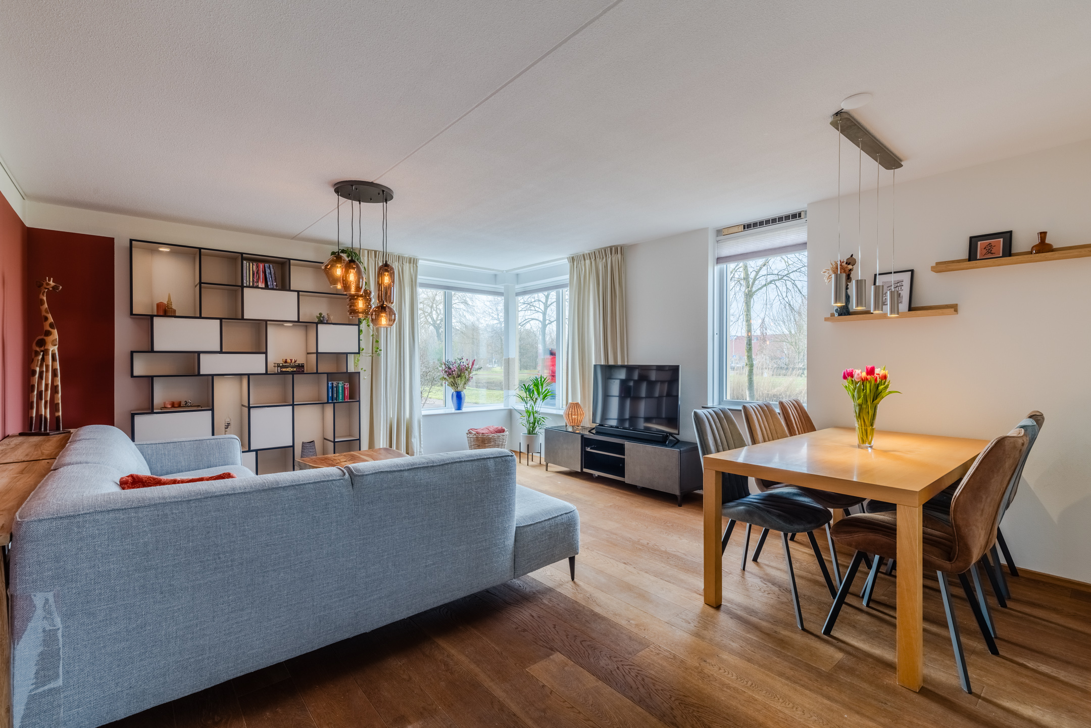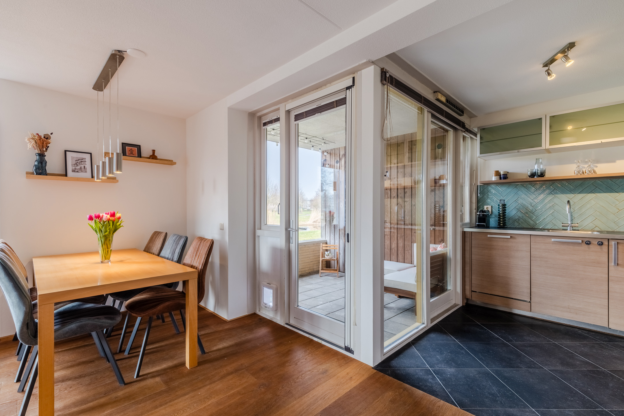 De woonkamer is heerlijk licht dankzij de grote raampartijen en biedt een vrij en groen uitzicht over water. Door de hoekligging en de prettige indeling voelt de ruimte open en ruimtelijk aan.