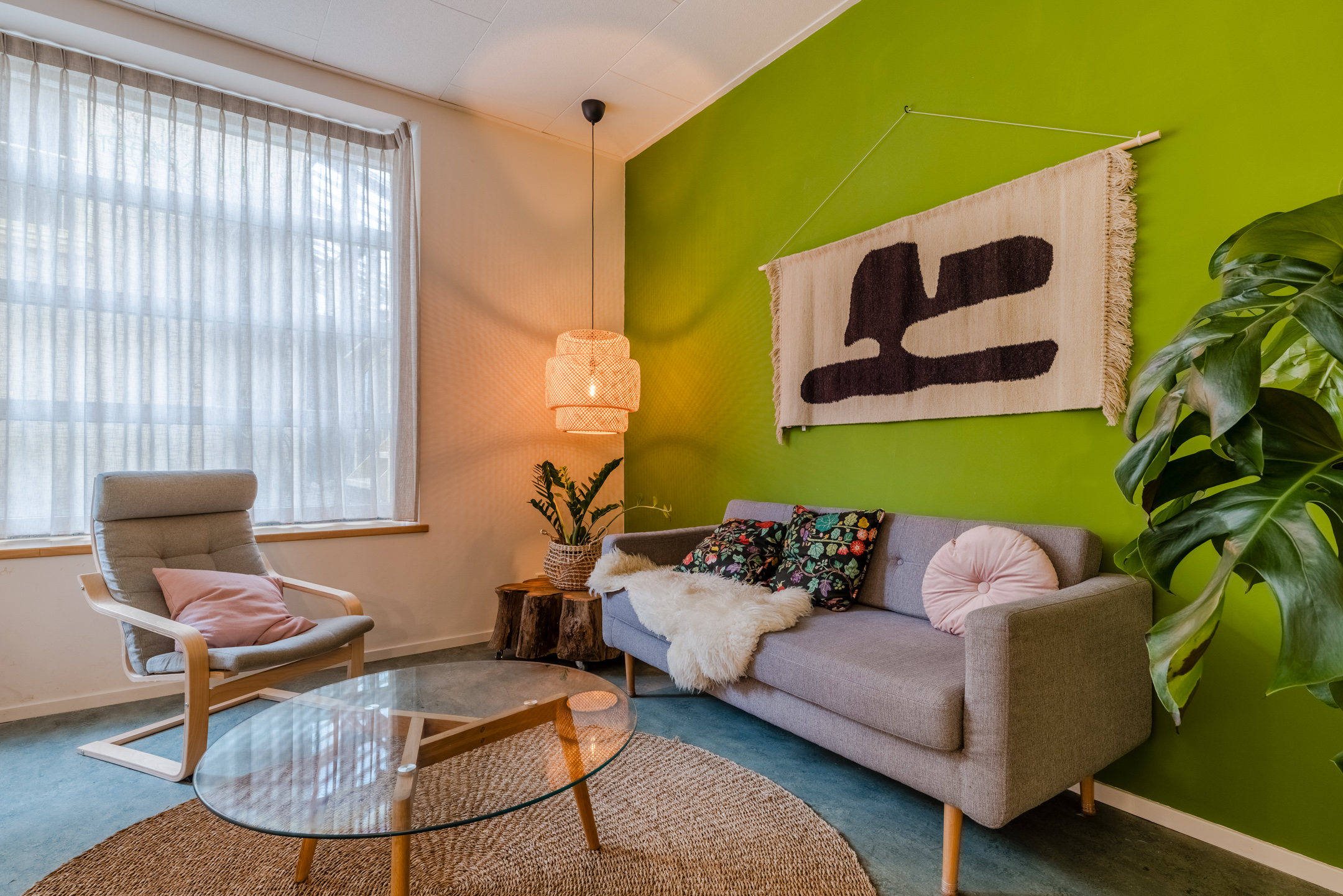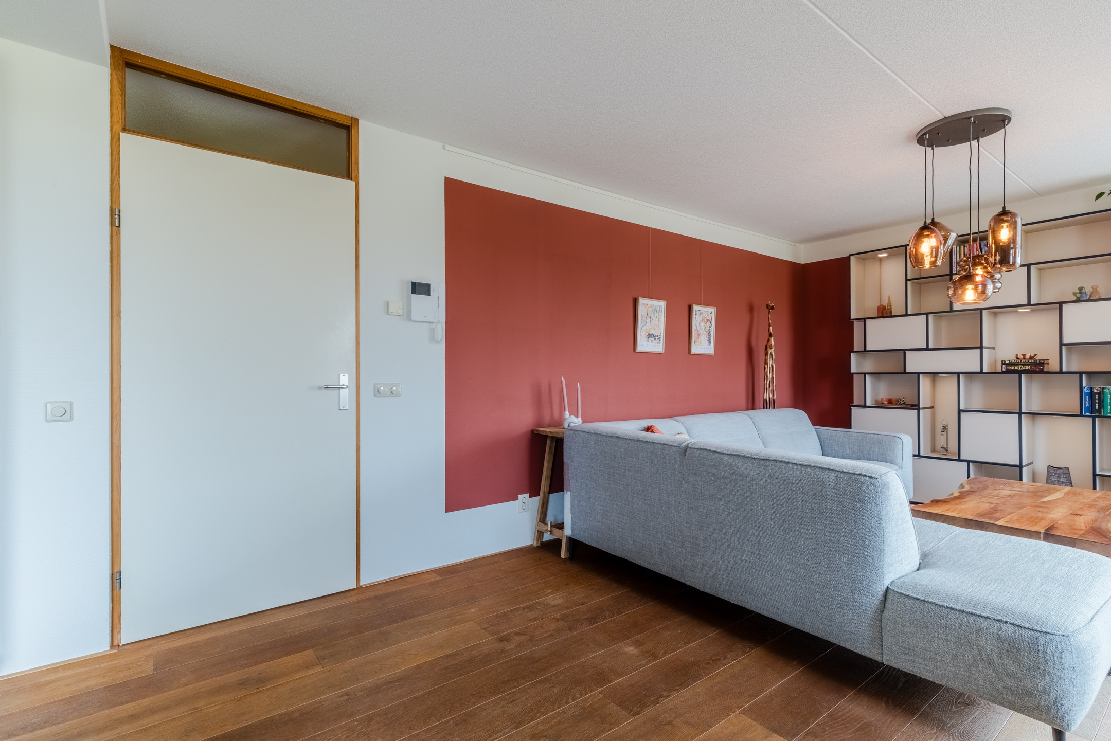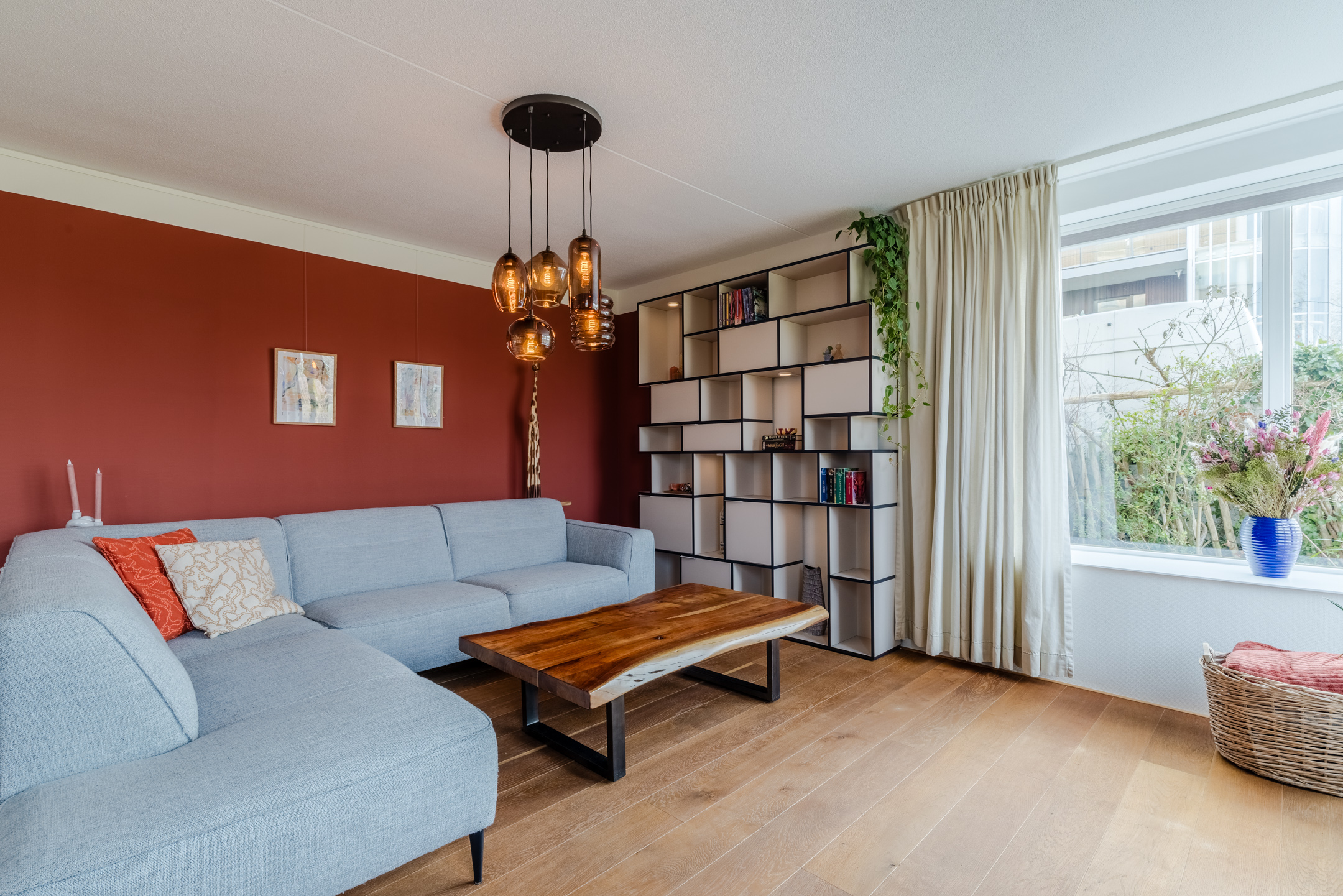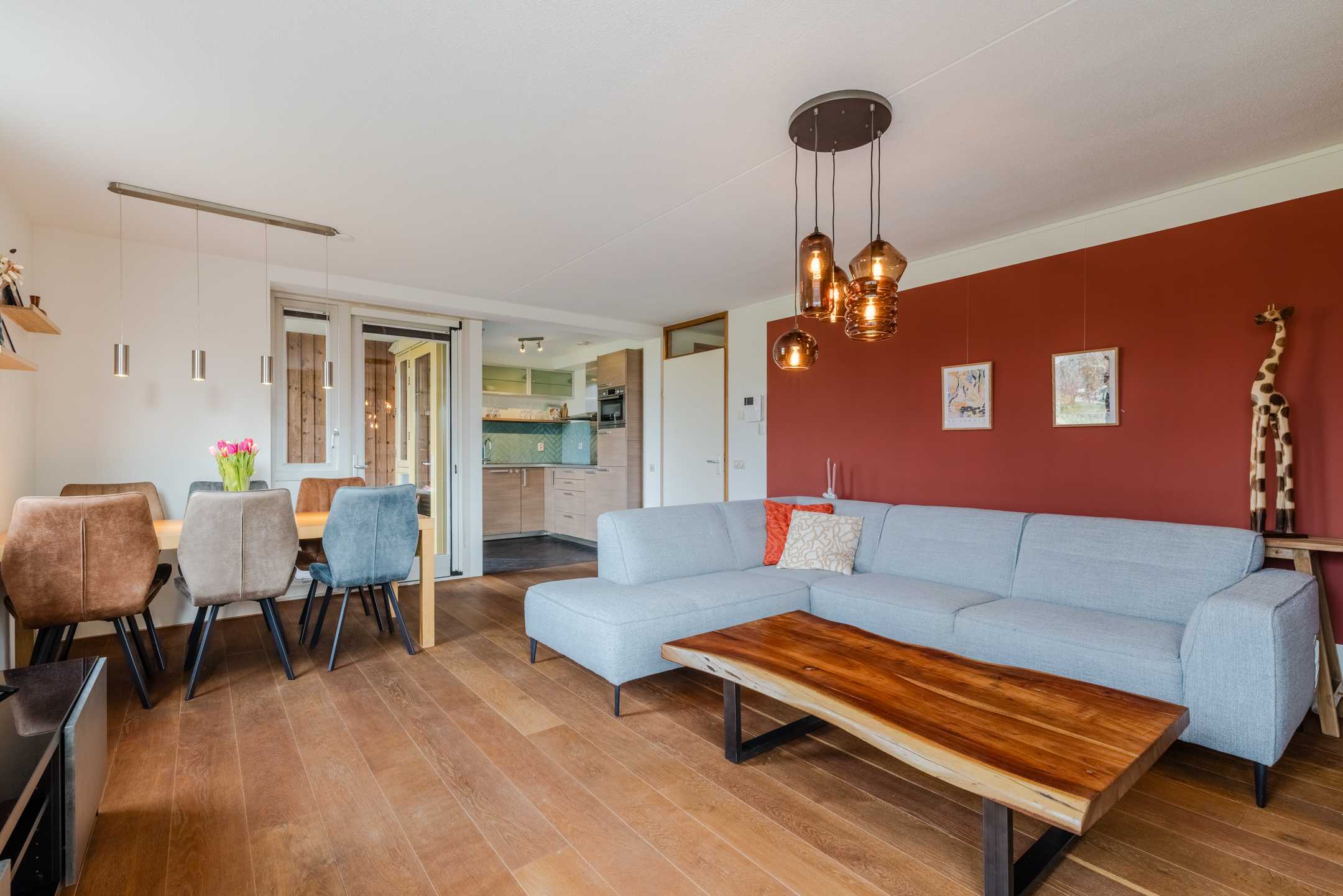 De woonkamer is heerlijk licht dankzij de grote raampartijen en biedt een vrij en groen uitzicht over water. Door de hoekligging en de prettige indeling voelt de ruimte open en ruimtelijk aan.