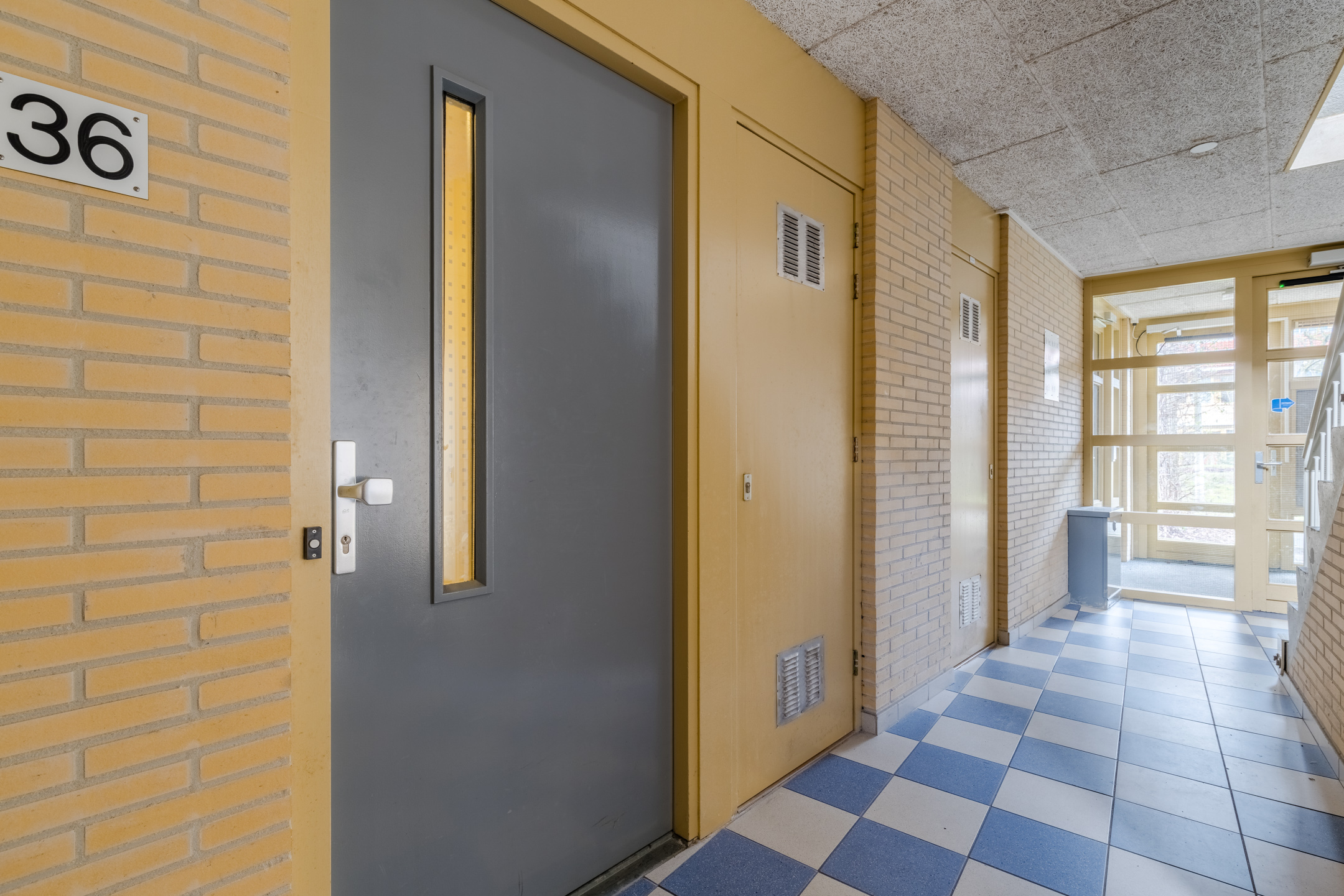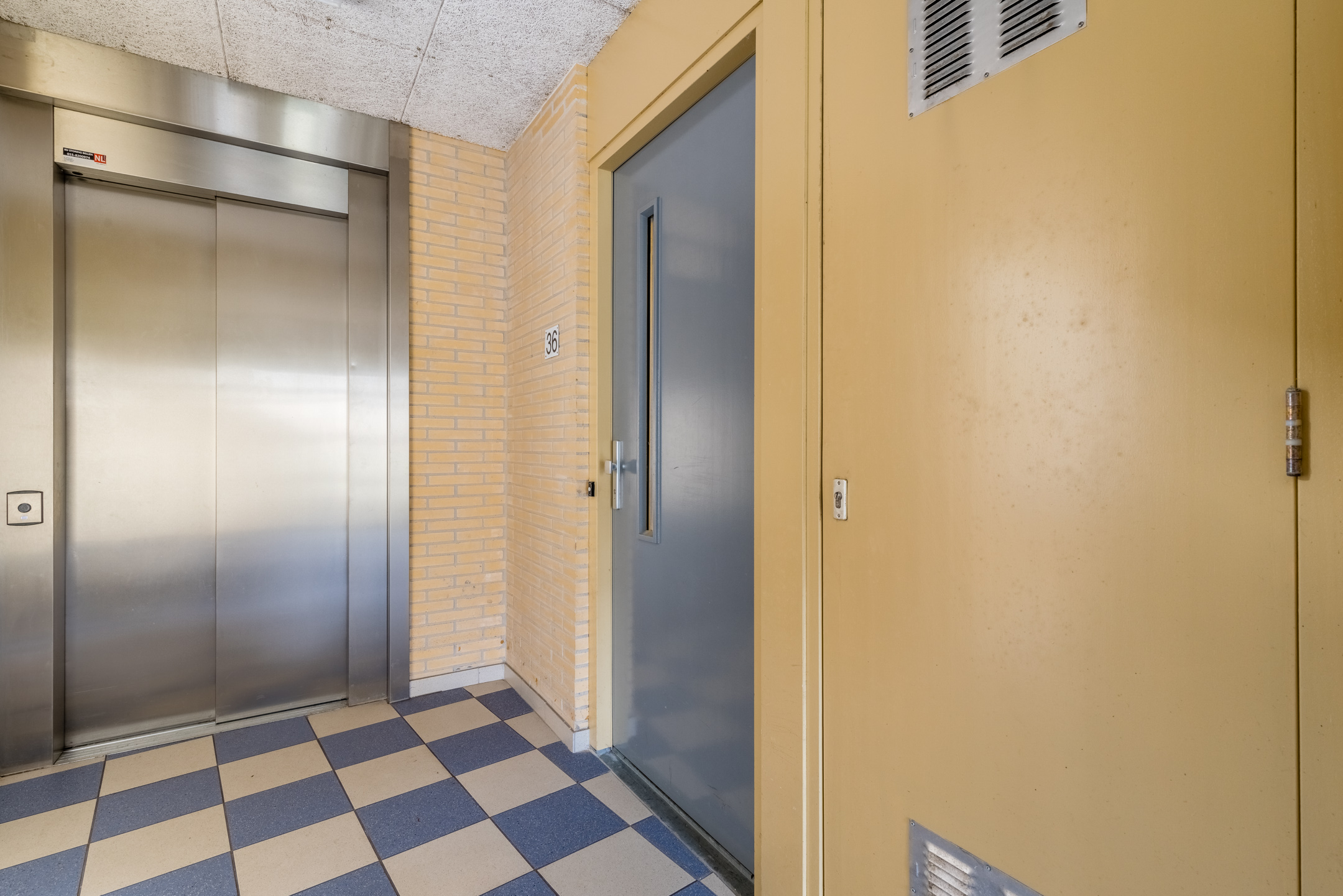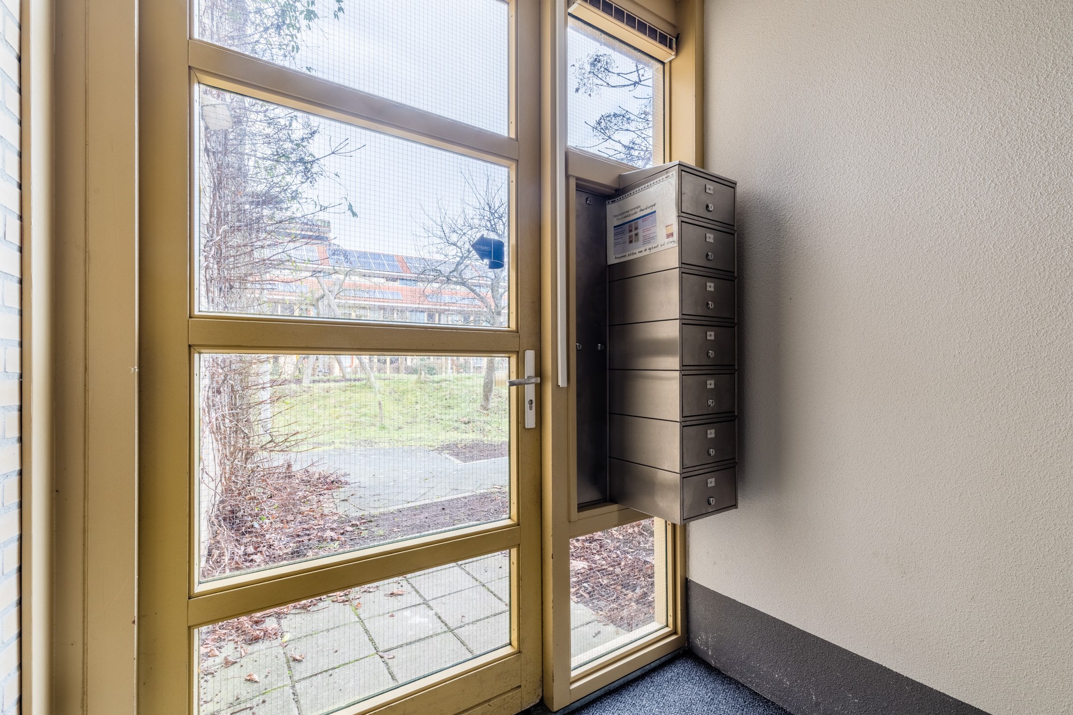 Centrale (afgesloten) entree met brievenbussen, lift en trappenhuis. Buitendeuren zijn recent geautomatiseerd voor makkelijke toegang tot het portiek. Op hetzelfde niveau bevindt zich de eigen afgesloten berging met directe uitgang naar het fietspad.