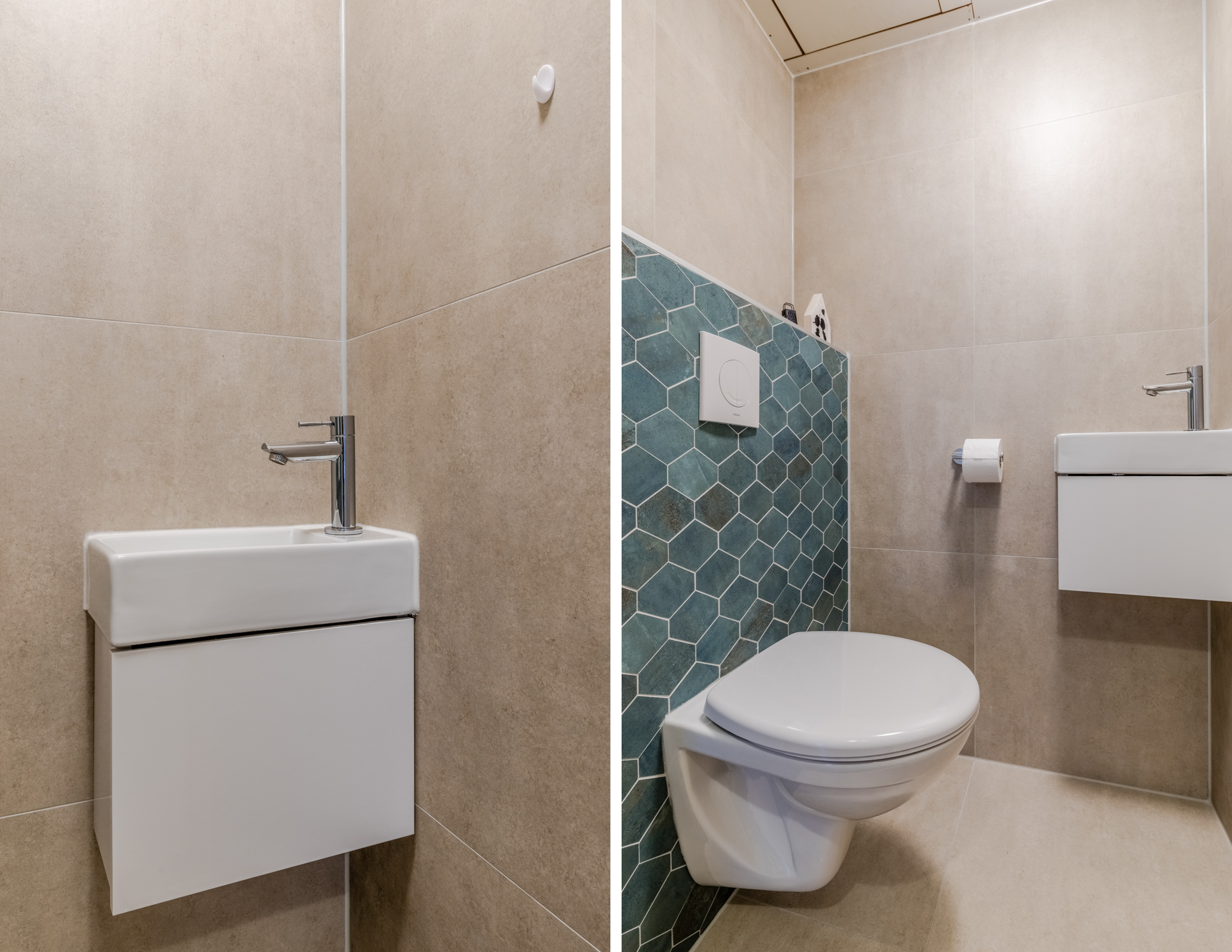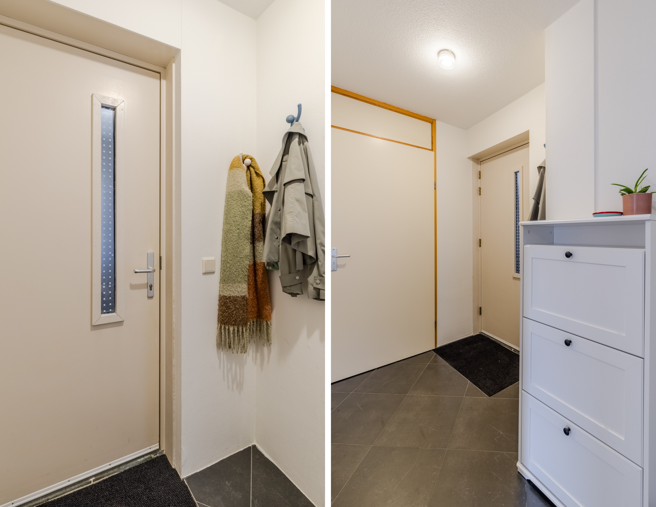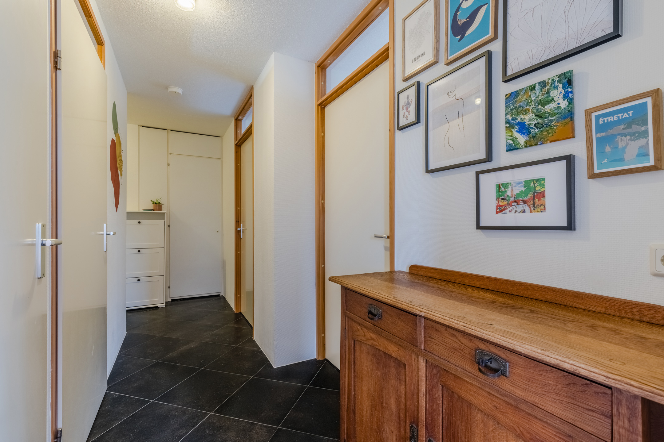 Entree, hal met garderobe en toiletruimte met hangend toilet en fontein (2024 gerenoveerd). Vanuit de hal zijn alle vertrekken bereikbaar. De meterkast bevindt zich net buiten het appartement direct naast de voordeur.
