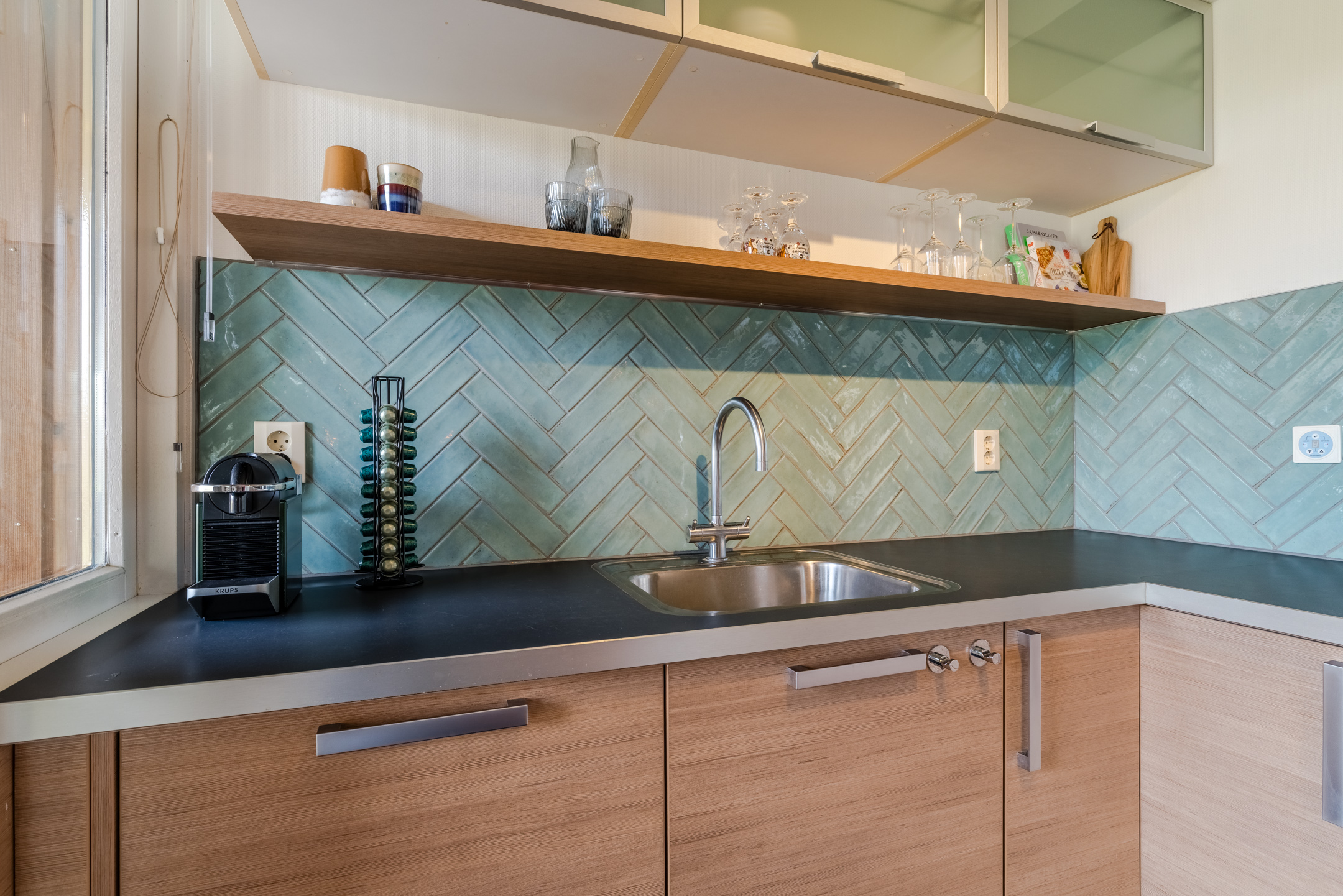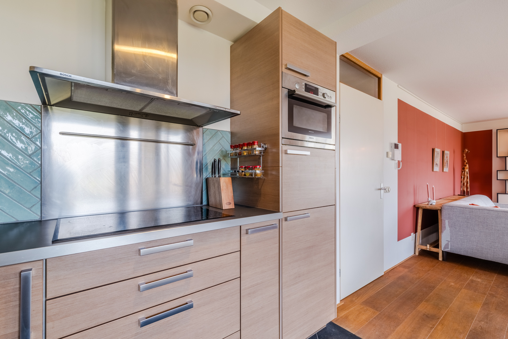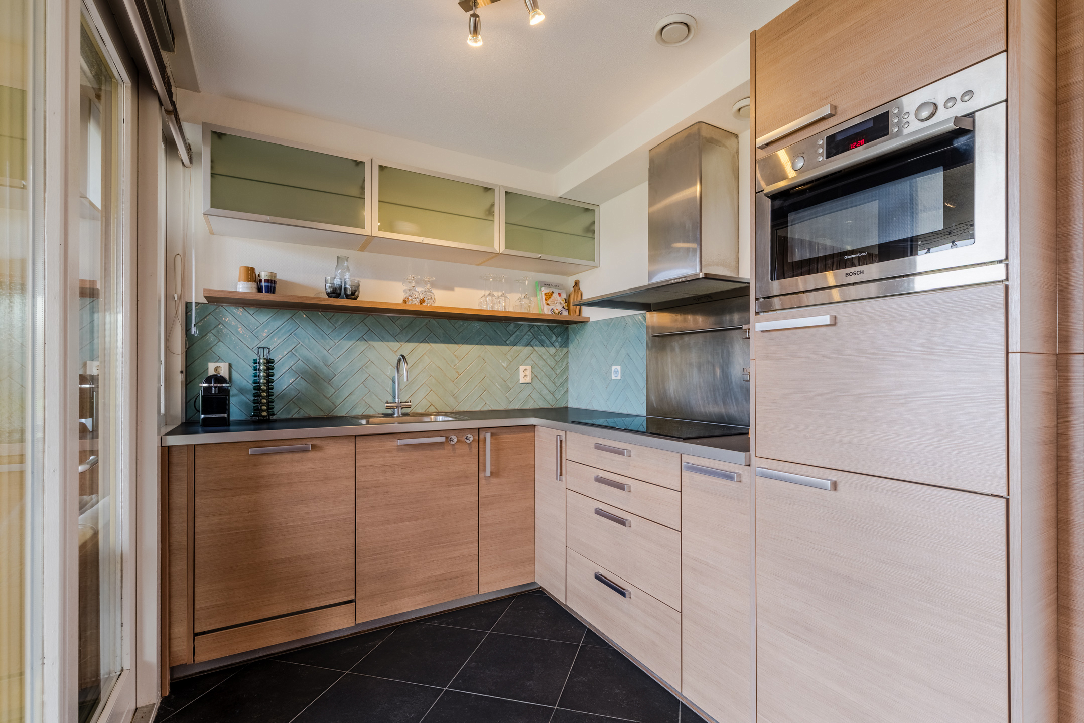 De halfopen keuken is centraal in het appartement gesitueerd en uitgevoerd in een praktische L-/hoekopstelling, voorzien van diverse inbouwapparatuur waaronder een elektrische kookplaat, koelkast, vriezer, vaatwasser en afzuigkap, met een kunststof werkblad. Door de leuke gekleurde tegels in de keuken heeft die een eigentijdse uitstraling! Vanuit de keuken is het terras/loggia bereikbaar.