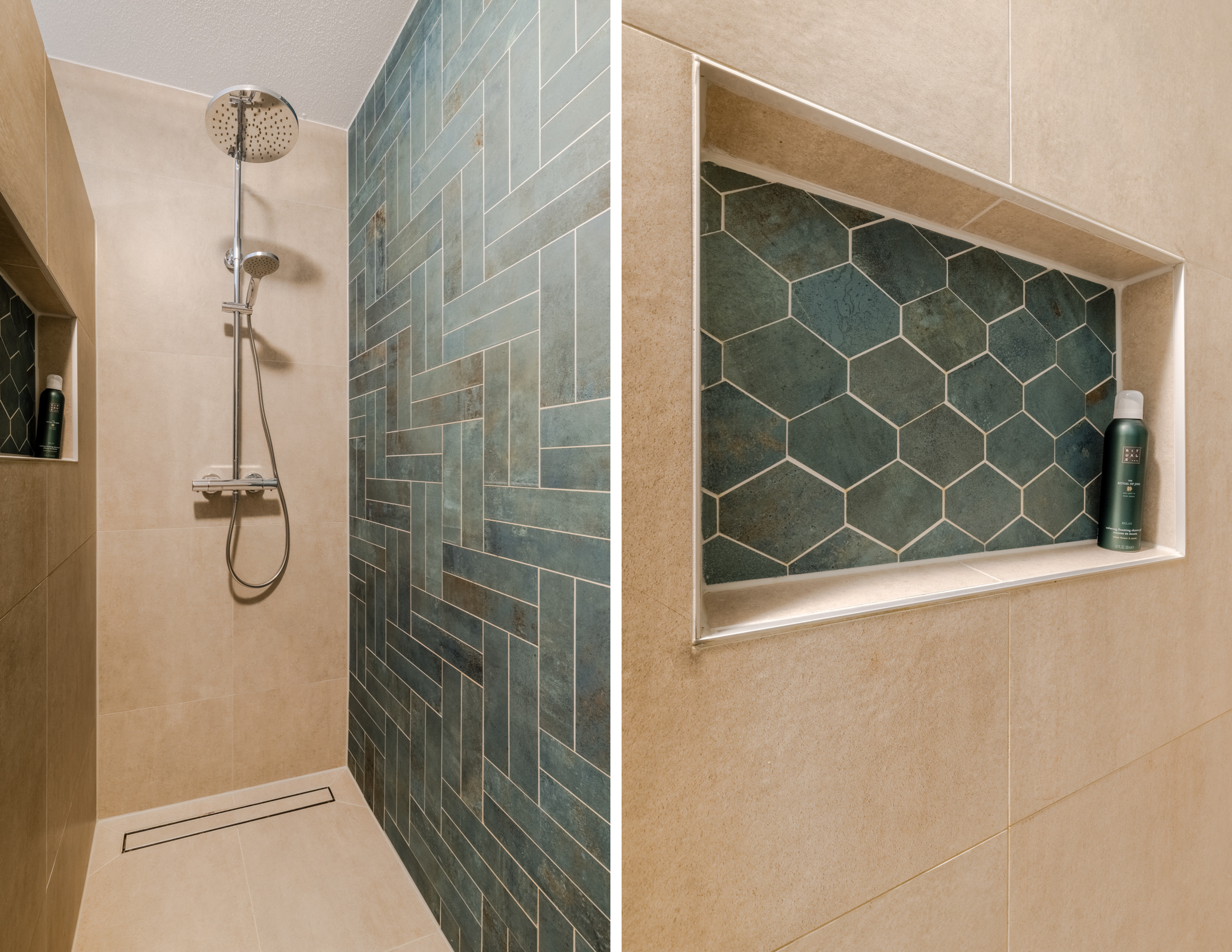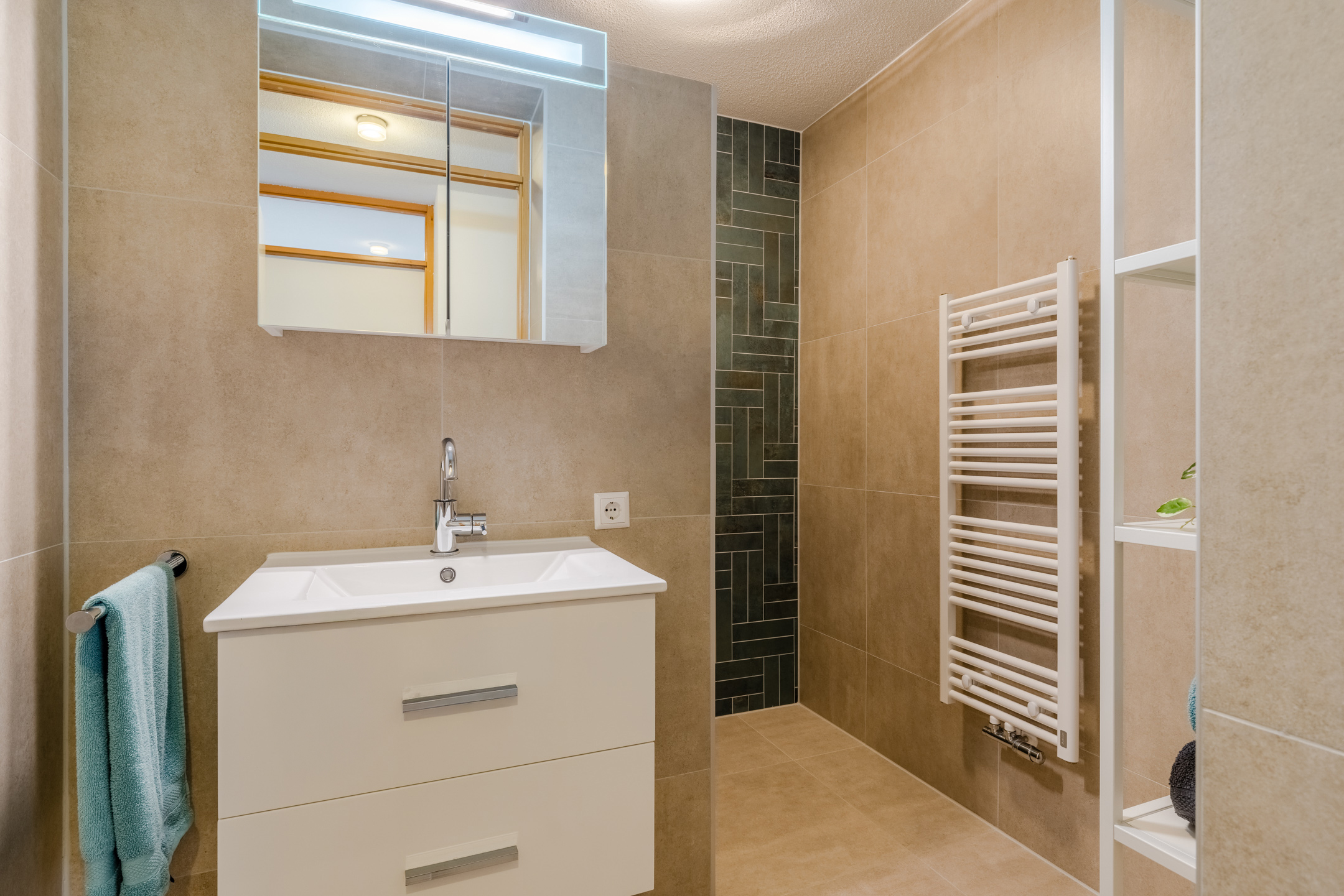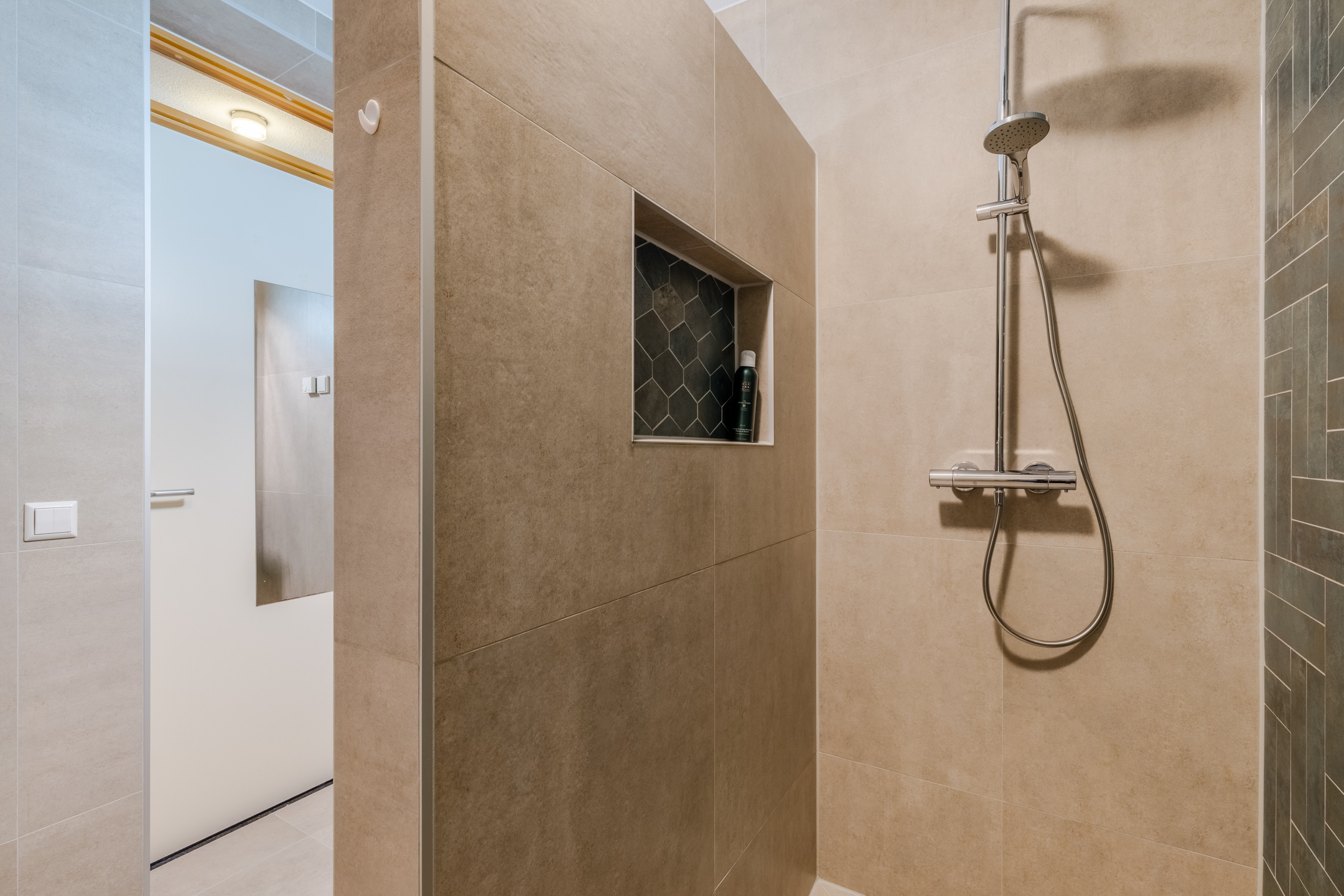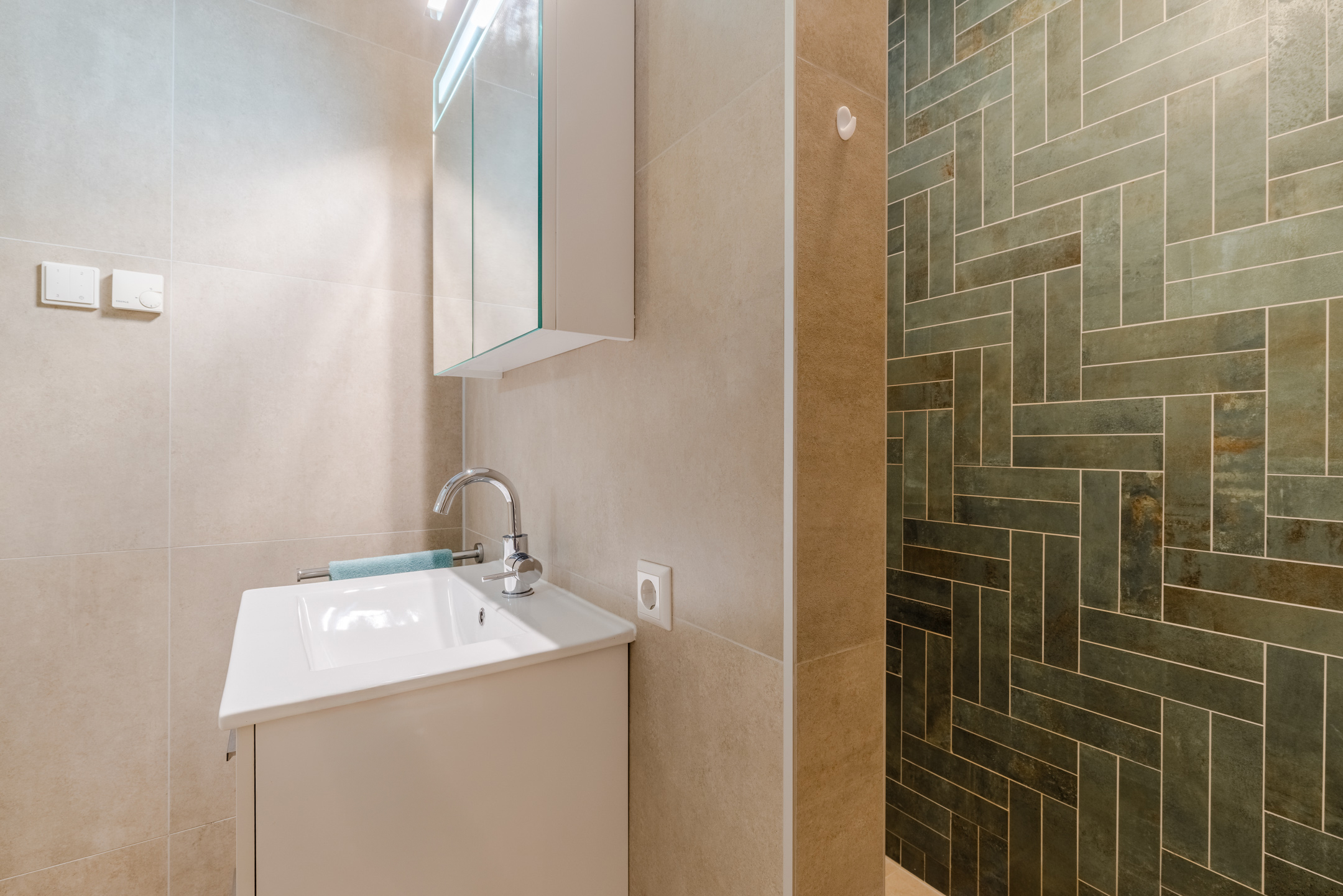 De ruime inpandige badkamer, vernieuwd in 2024, is modern uitgevoerd in een neutrale groen- en beigetint en voorzien van een inloopdouche met stijlvolle detailtegels, wastafel, badkamermeubel, verwarmd handdoekenrek en mechanische ventilatie (2025 vernieuwd). In de inloopdouche is een handig en speels nisje gecreëerd voor het netjes neerzetten van doucheproducten.