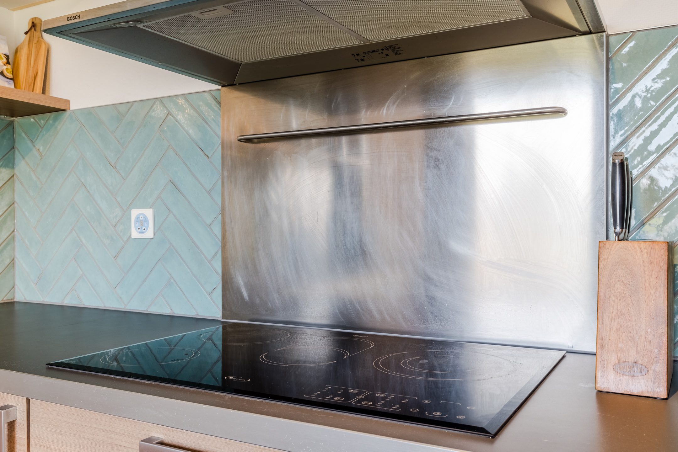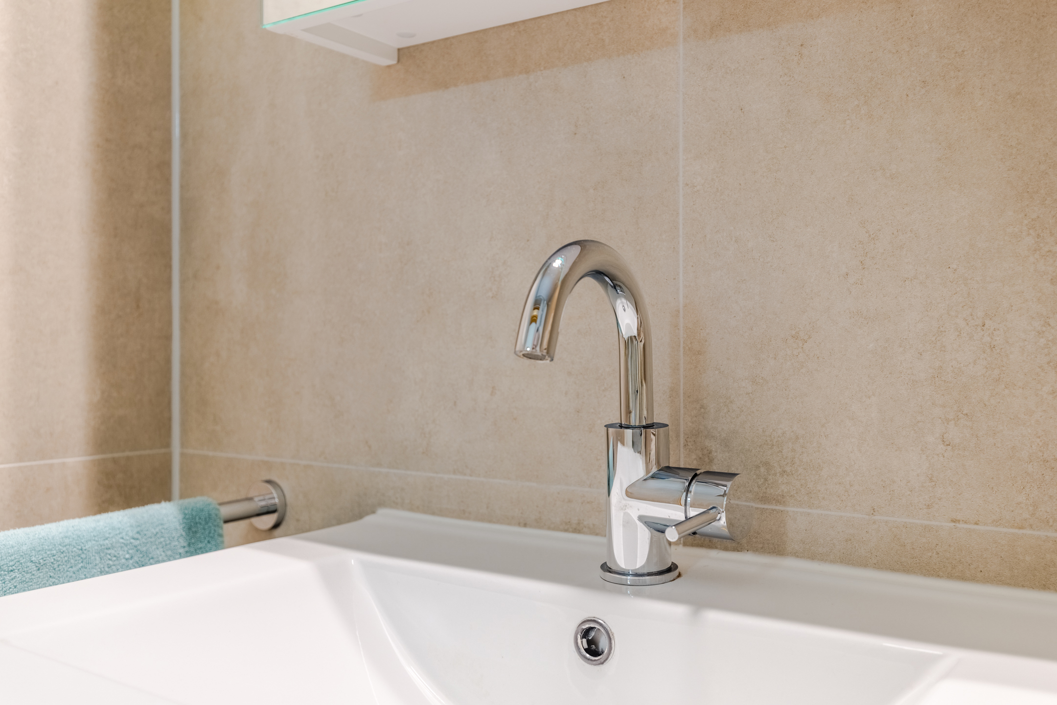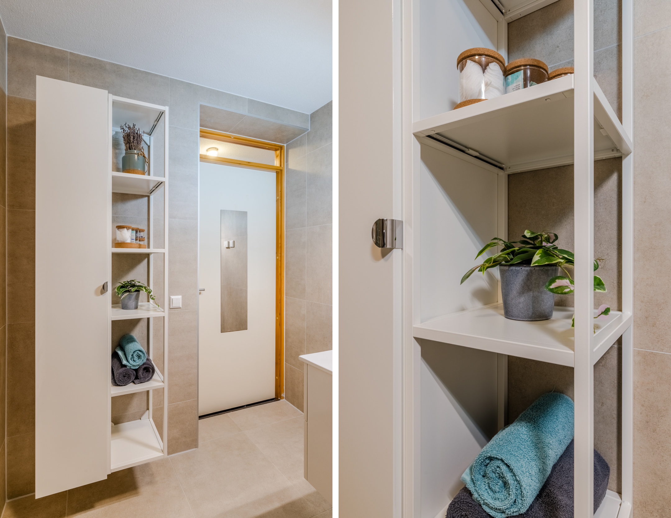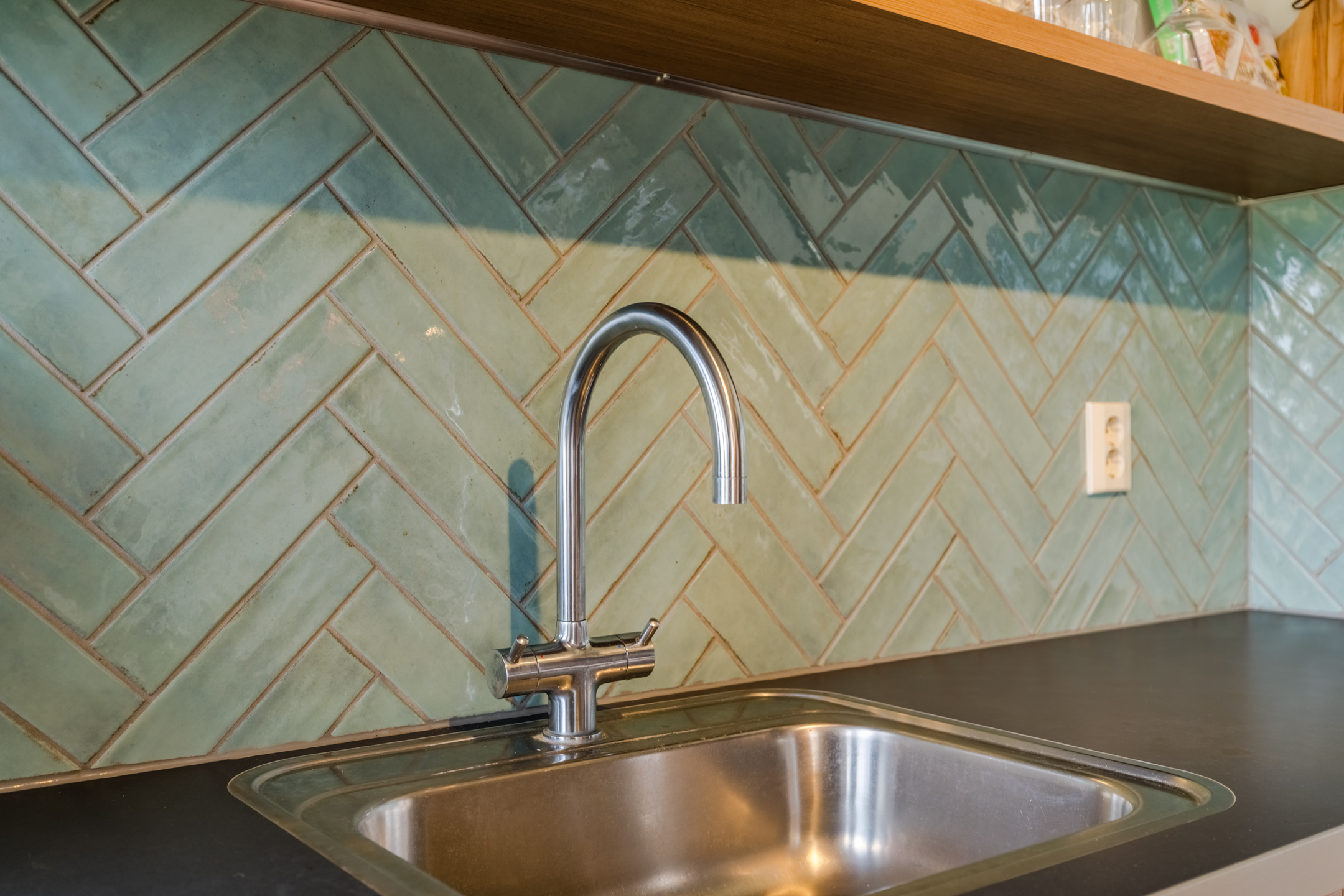 De ruime inpandige badkamer, vernieuwd in 2024, is modern uitgevoerd in een neutrale groen- en beigetint en voorzien van een inloopdouche met stijlvolle detailtegels, wastafel, badkamermeubel, verwarmd handdoekenrek en mechanische ventilatie (2025 vernieuwd). In de inloopdouche is een handig en speels nisje gecreëerd voor het netjes neerzetten van doucheproducten.