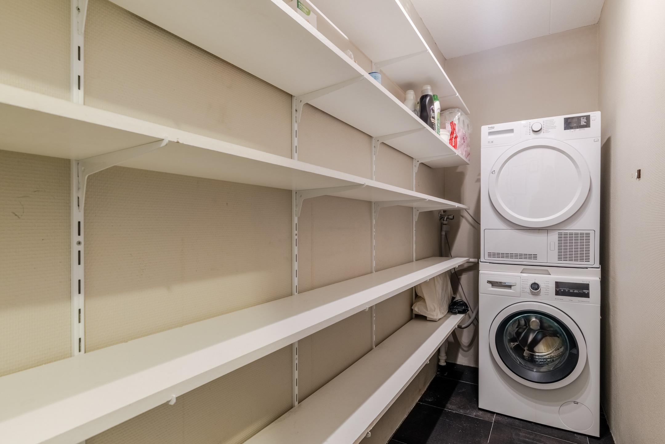De wasmachine en droger zijn netjes ondergebracht in een aparte inpandige berging/wasruimte. Hier heb je een zee aan extra opbergruimte. Eveneens is hier de kruipruimte gesitueerd.