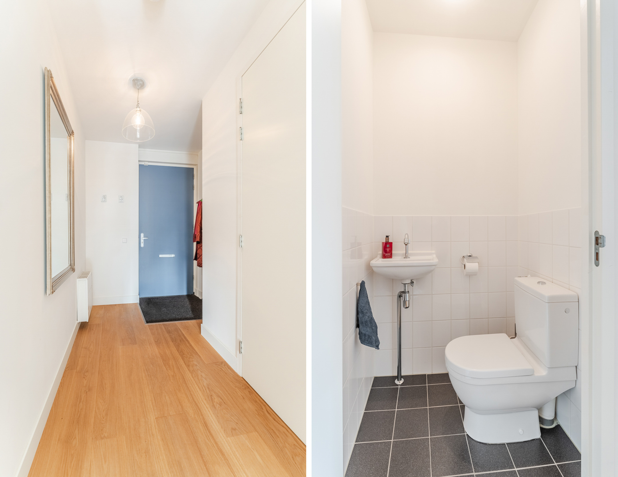 Entree, hal, garderobe, toiletruimte met staand toilet en fontein. Vanuit de hal bereik je de woonkamer.