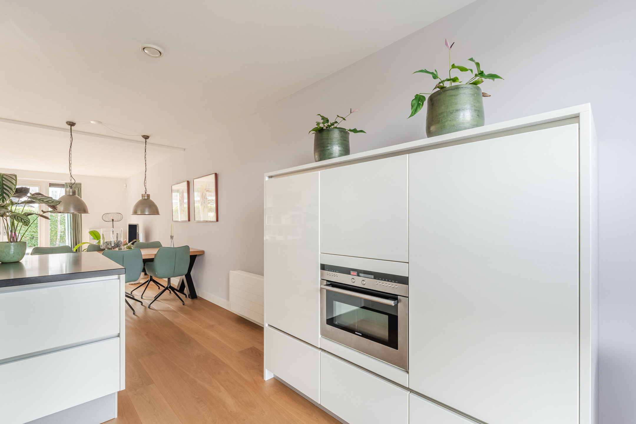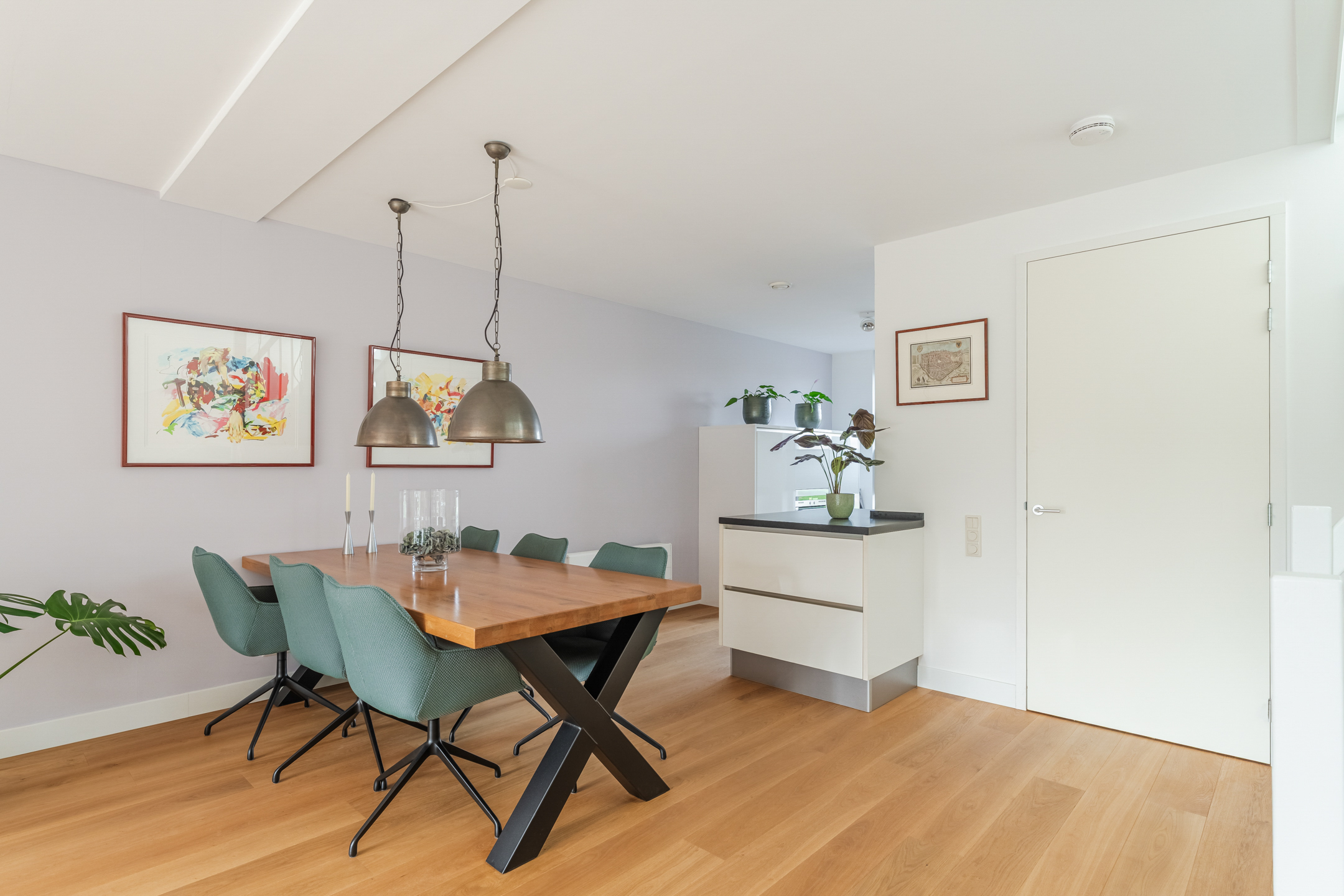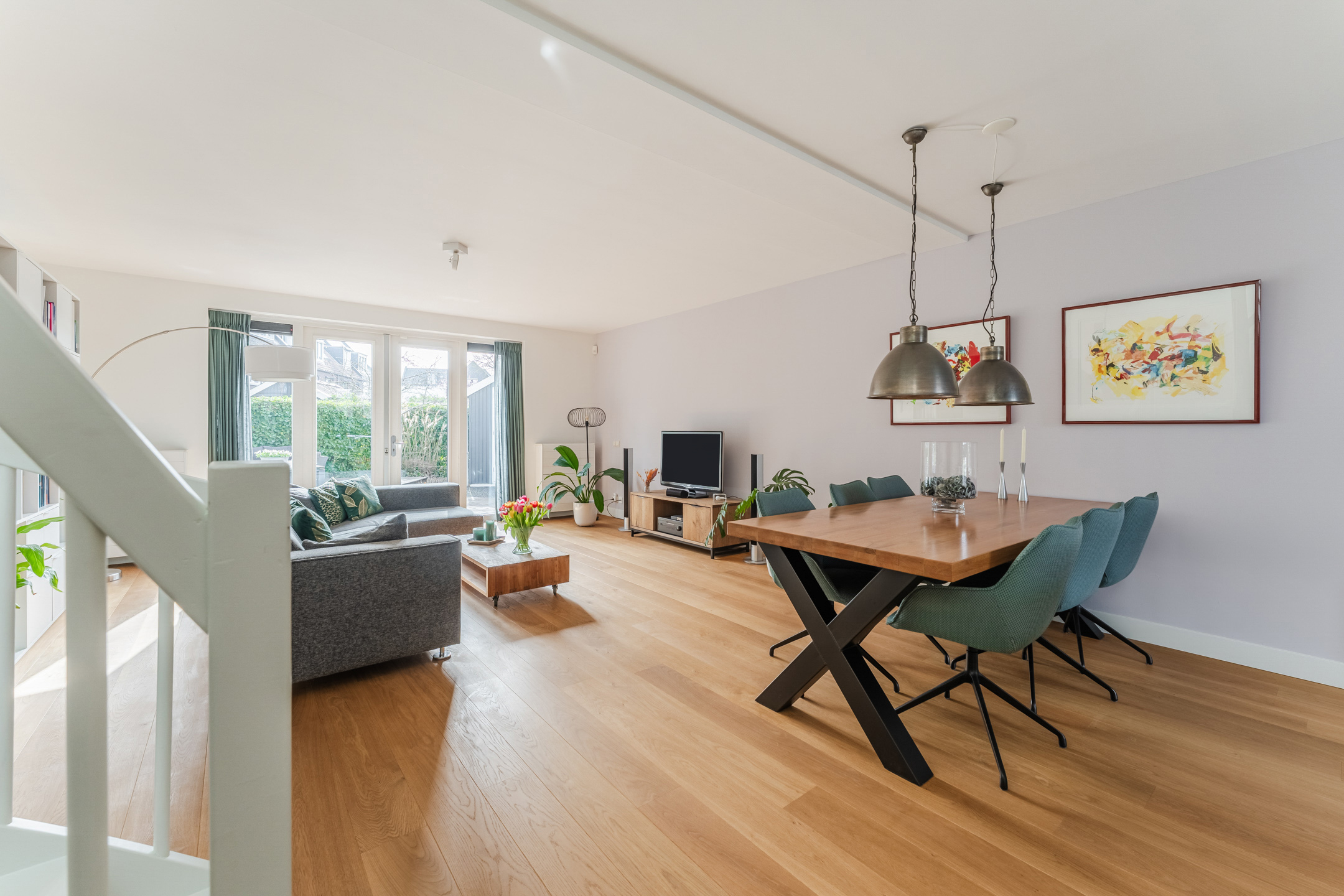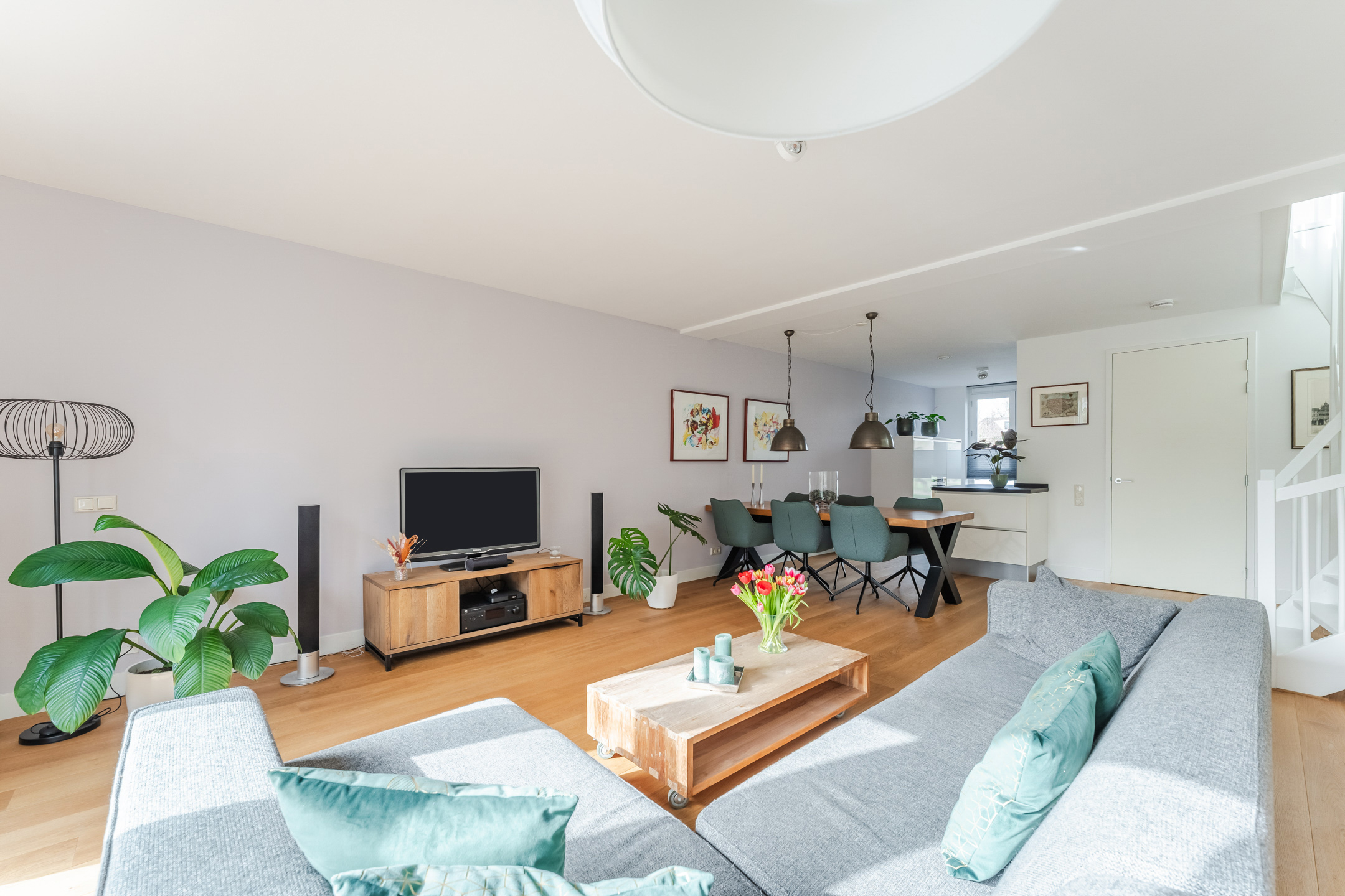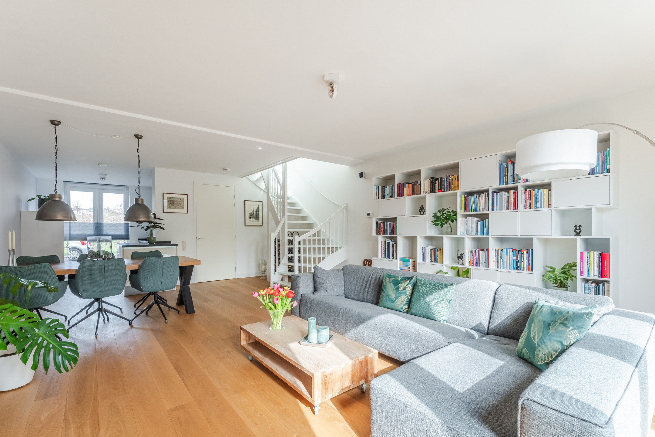 De gehele begane grond is voorzien van een sfeervolle eikenhouten lamelparketvloer en strak gestucte wanden en plafonds.