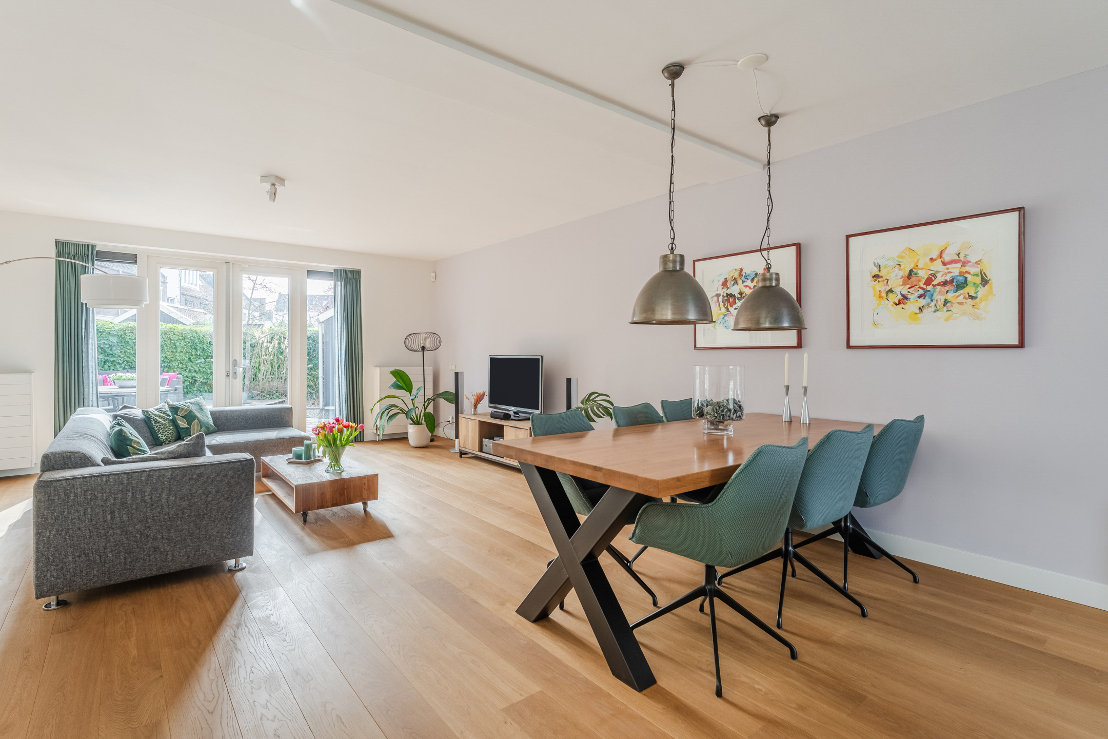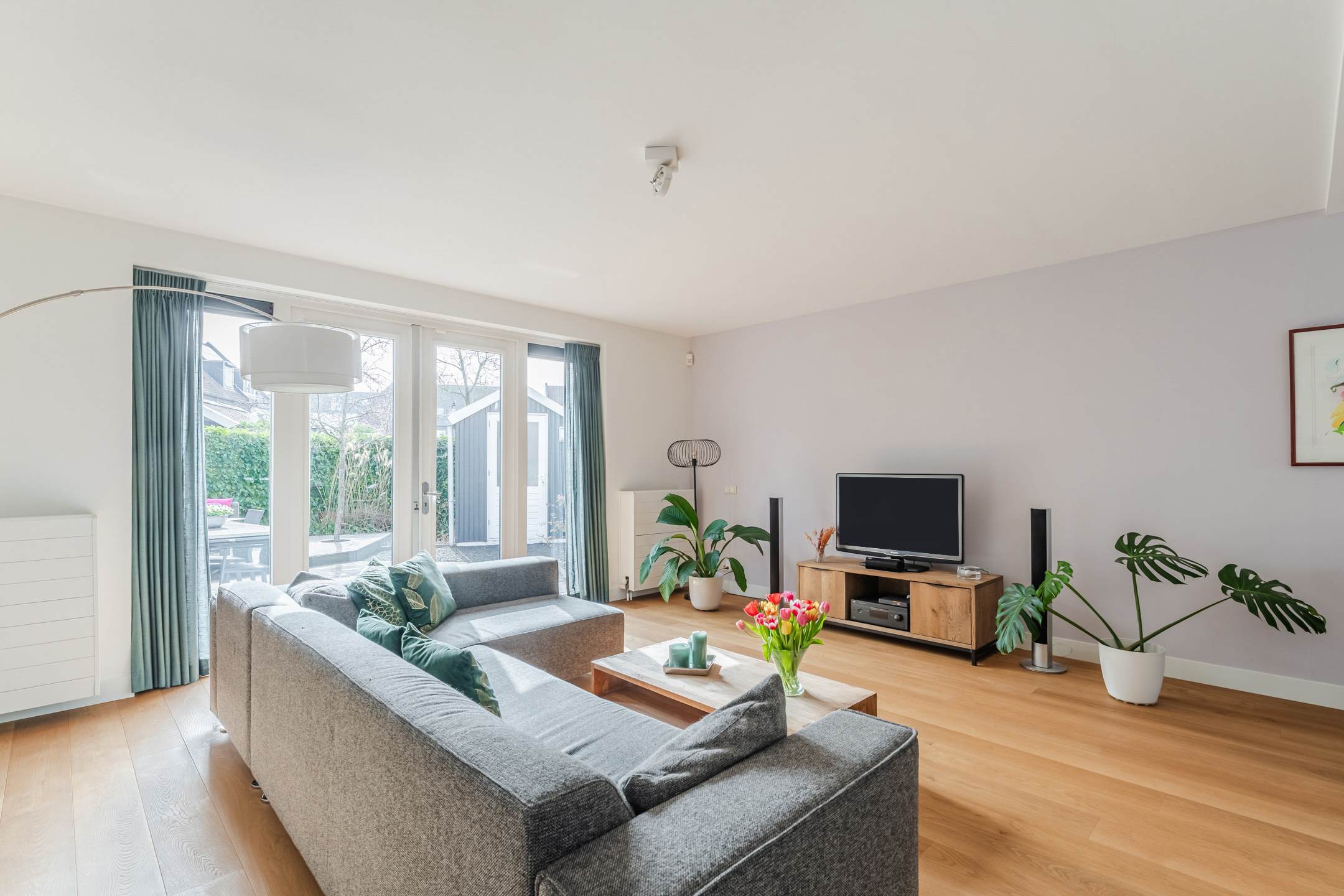 De sfeervolle en tuingerichte woonkamer bevindt zich aan de achterzijde van de woning. De woonkamer heeft een grote raampartij met openslaande deuren naar de tuin, waardoor er veel daglicht binnenvalt en een prettige verbinding met buiten ontstaat.