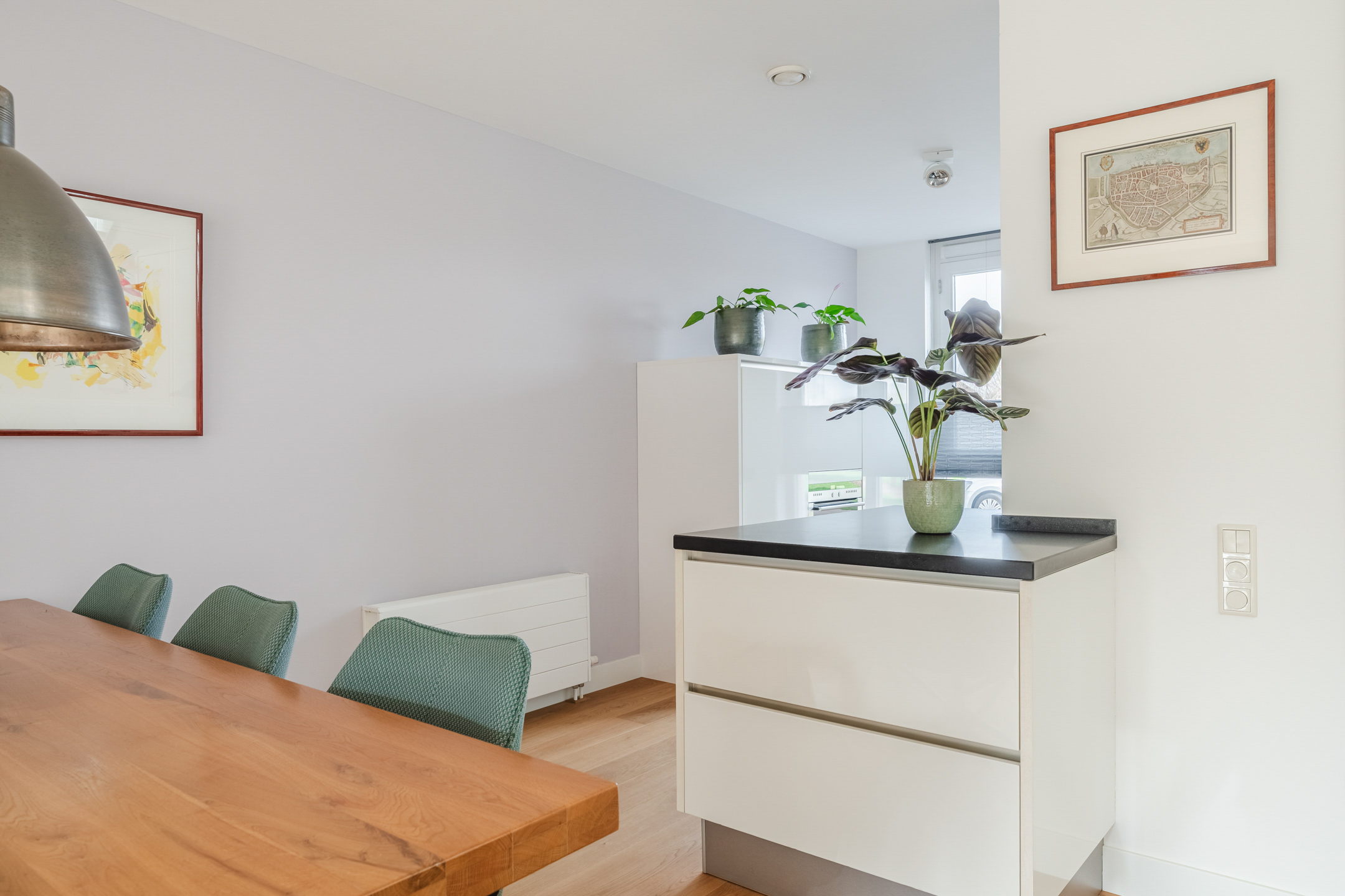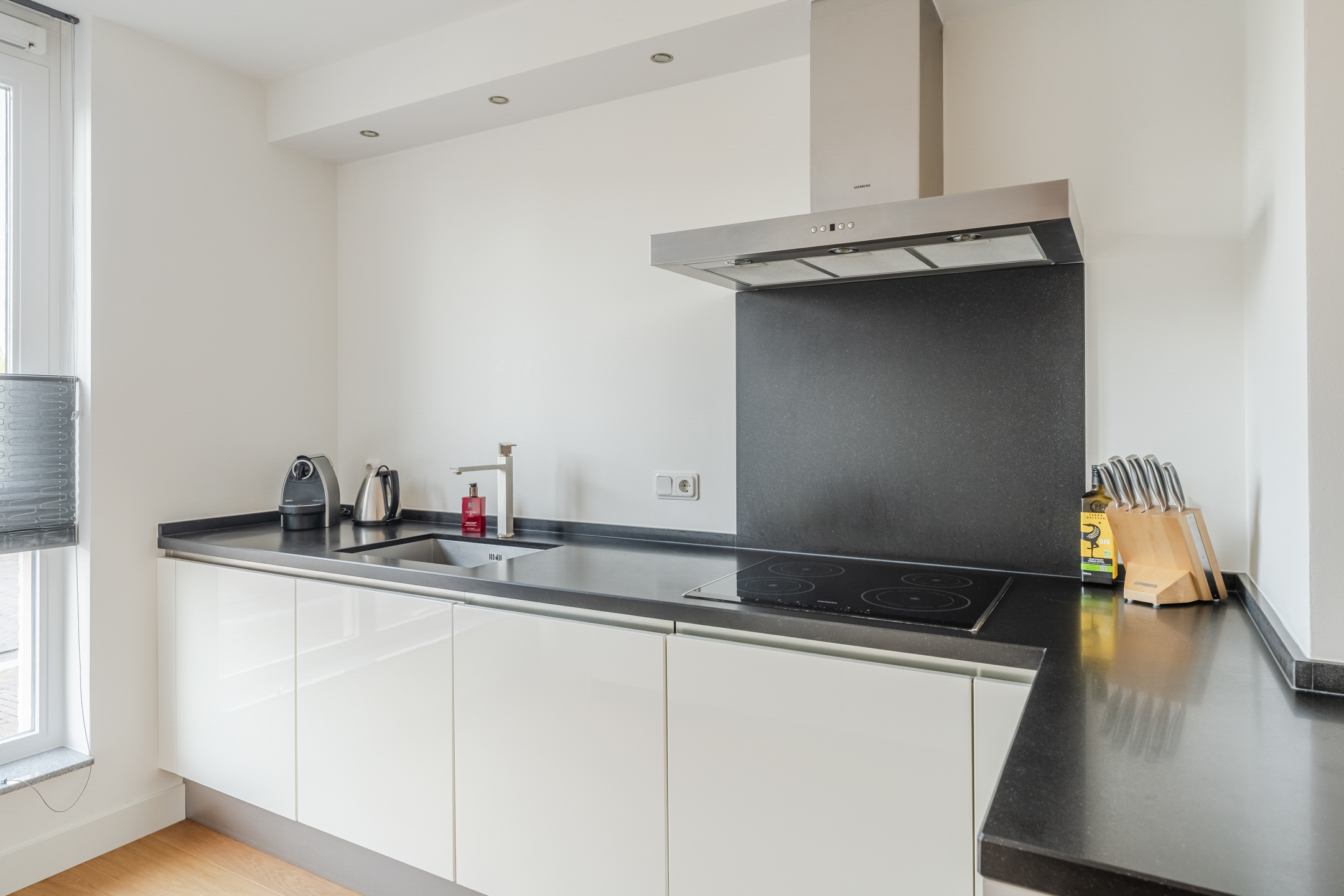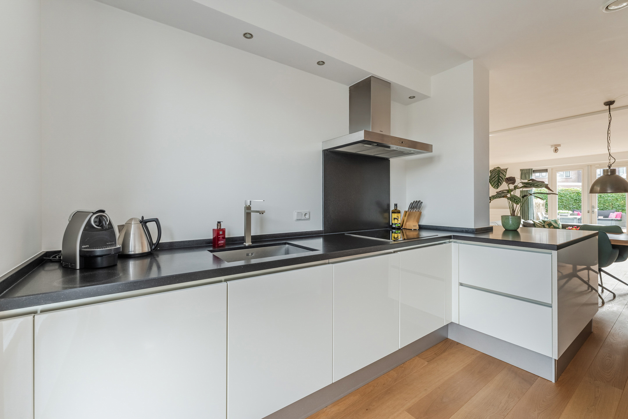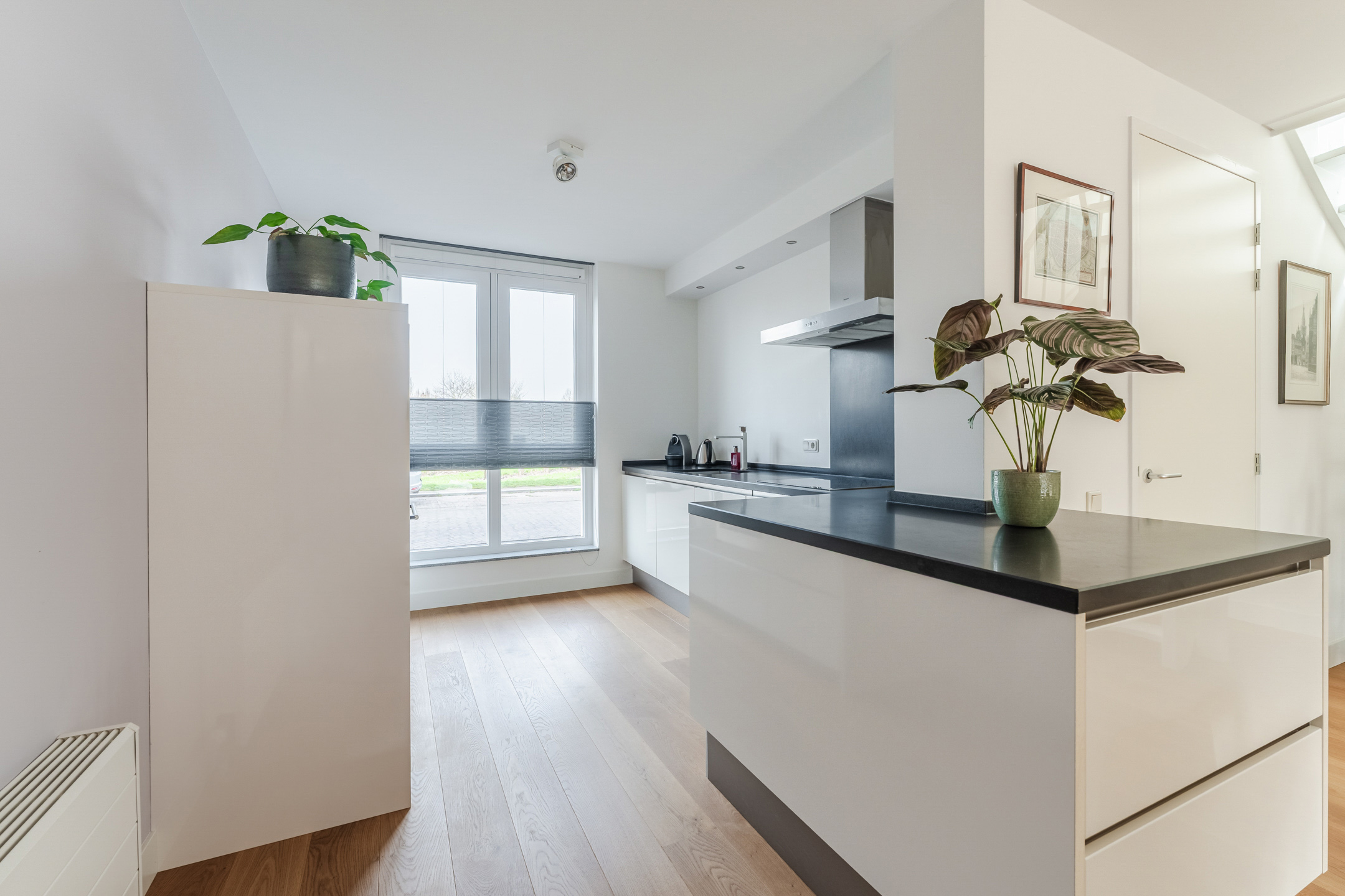 De halfopen keuken (ca. 3.22 x 2.87 m) aan de voorzijde van de woning is geplaatst in een ruime opstelling met apparatenwandkast en schiereiland. De keuken is uitgevoerd in een moderne, hoogglans witte kleurstelling en een mooi zwart Caesar Stone aanrechtblad. Via de grote ramen aan de voorzijde heb je tijdens het koken een leuk zicht op de perenboomgaard aan de overkant van de straat.