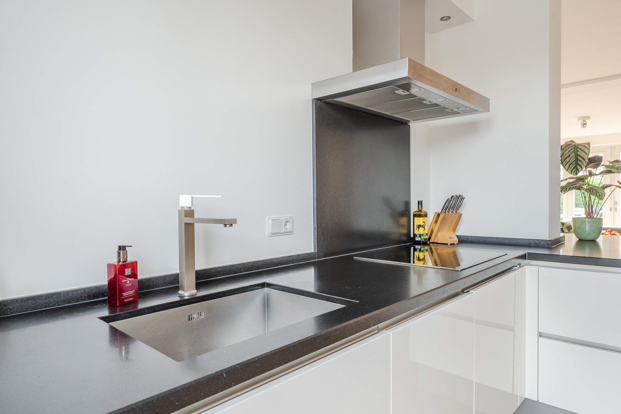 De keuken heeft alle wenselijke inbouwapparatuur: een inductiekookplaat, een combi-oven/magnetron, een koelkast, een vriezer, een vaatwasser en een rvs- afzuigkap.