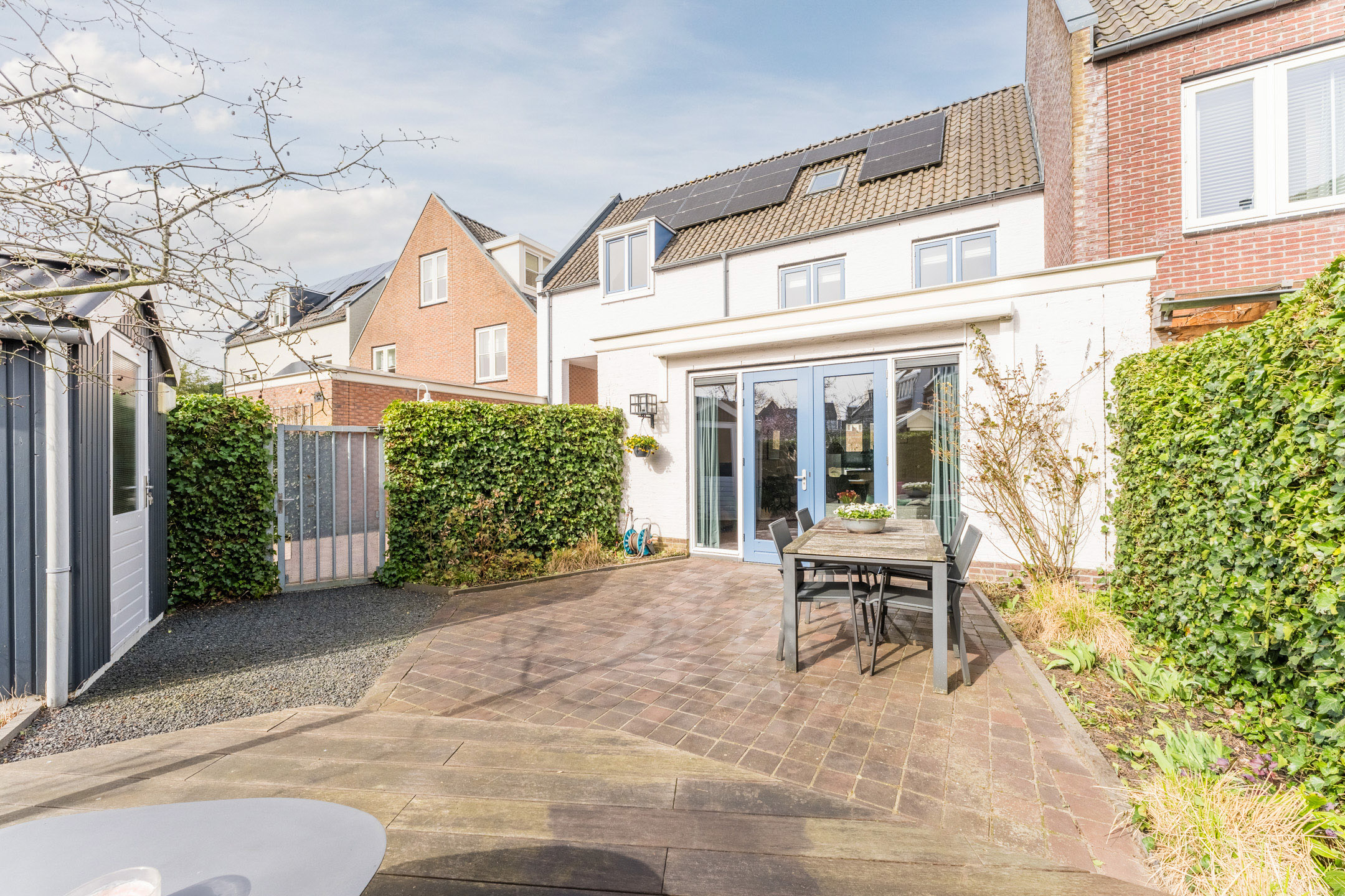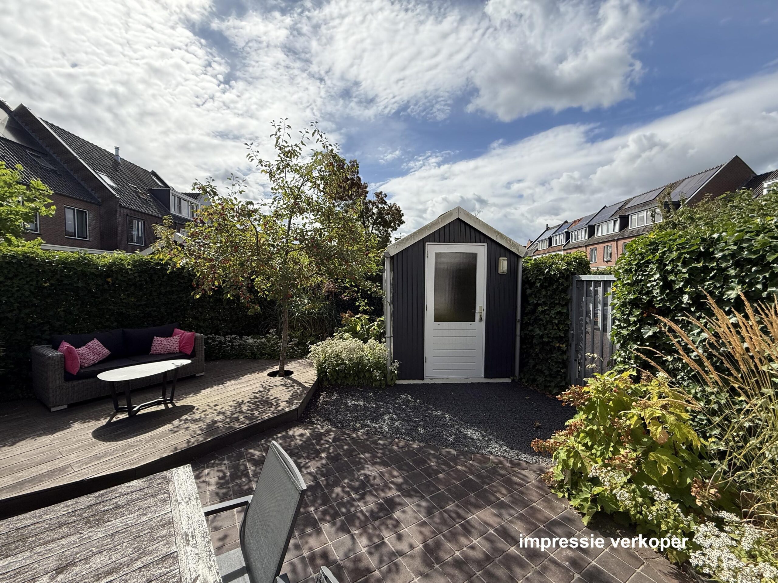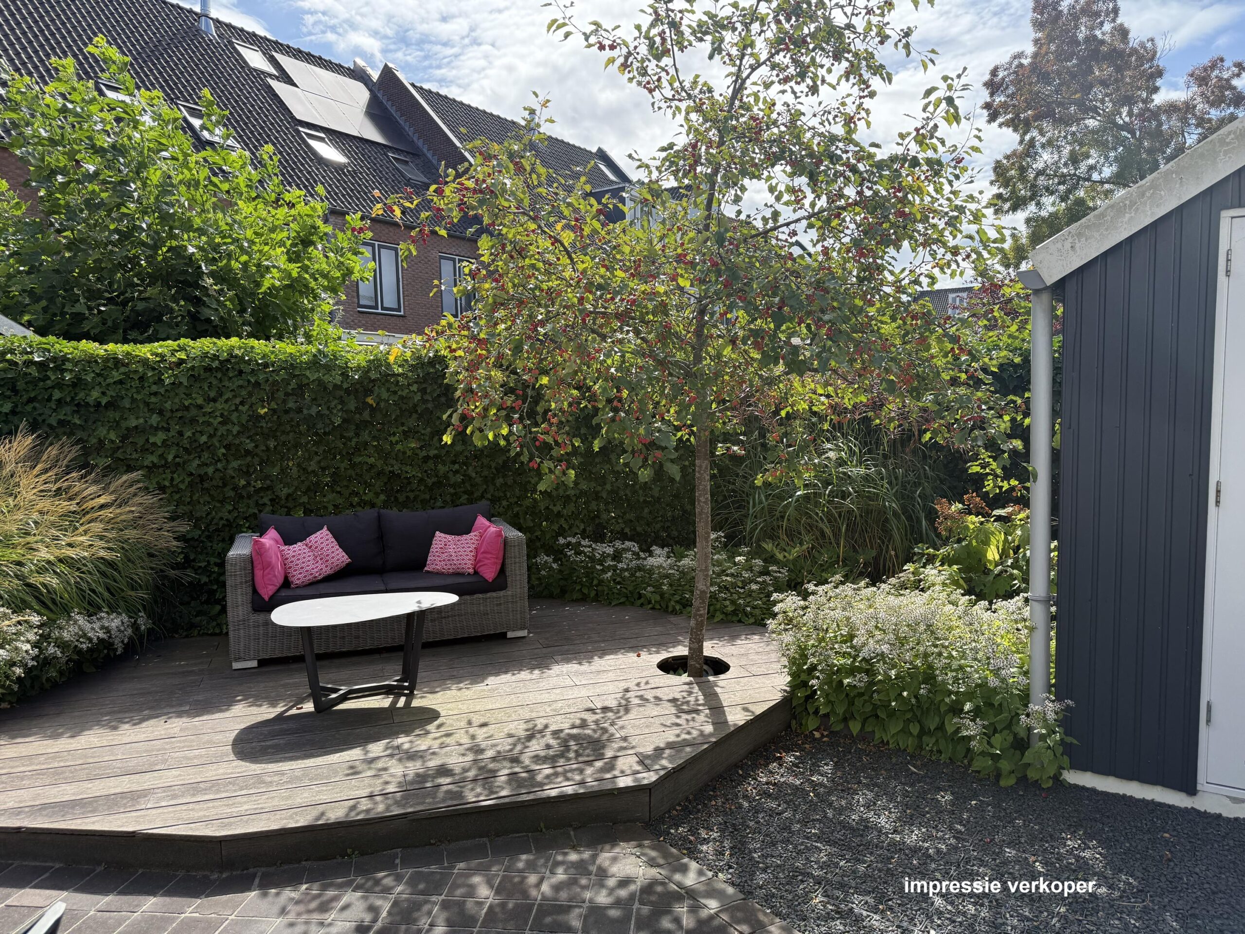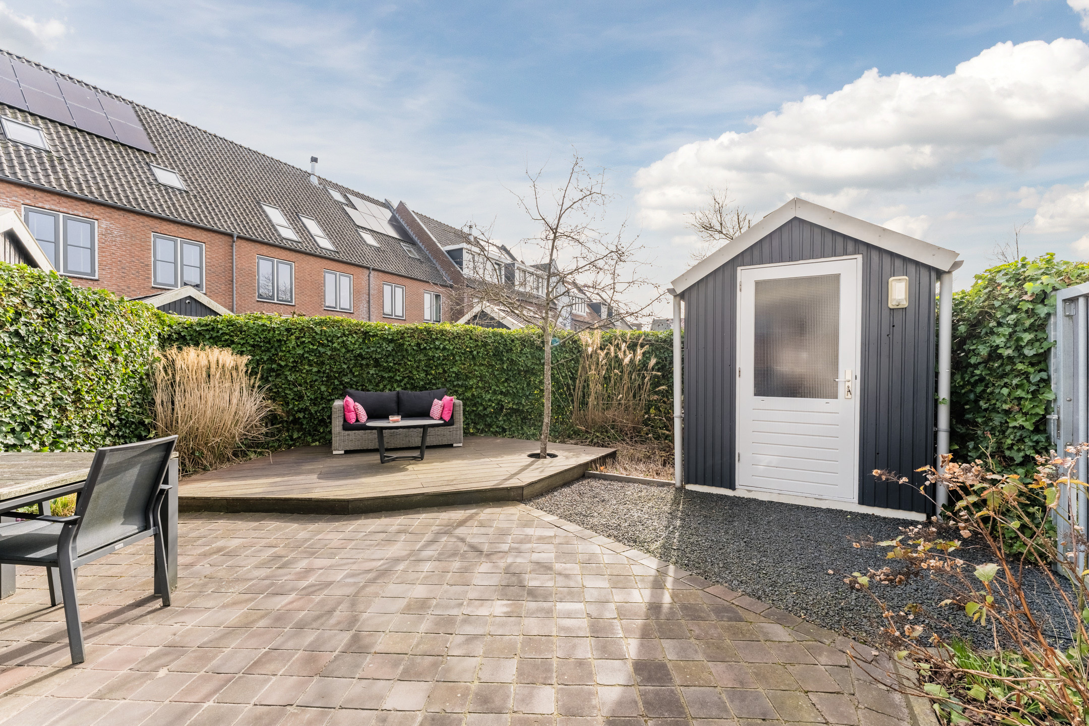 Via de openslaande deuren bereik je de smaakvol aangelegde en bovenal zonnige achtertuin op het zuiden. De tuin heeft een groot terras, een groene erfafscheiding en een ruime vlonder (op de meest zonnige plek van de tuin!) waar je eenvoudig een comfortabele loungeset plaatst. Daarnaast heeft de tuin een achterom en een vrijstaande houten berging, ideaal voor het stallen van fietsen en het opbergen van tuingereedschap en spullen.
